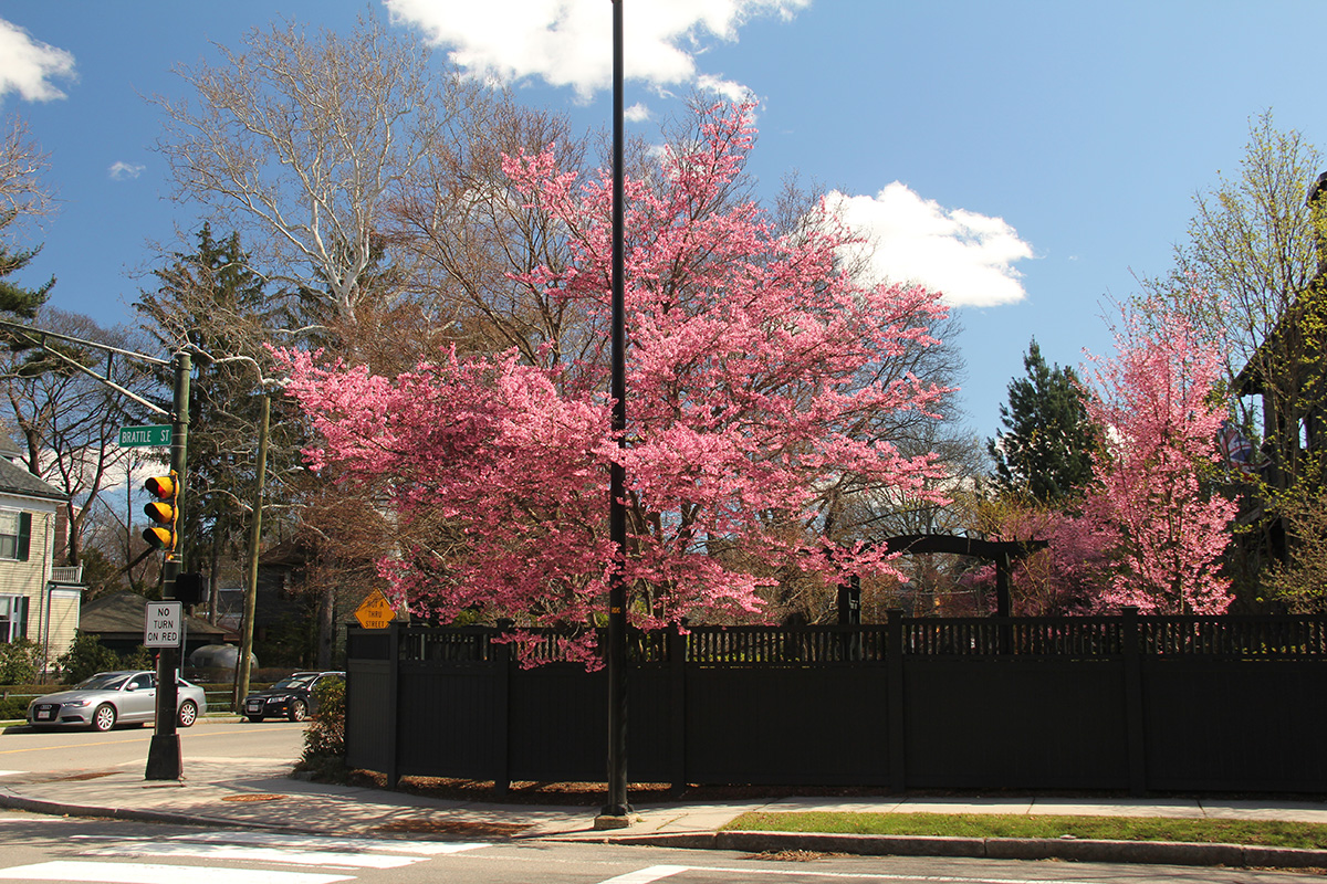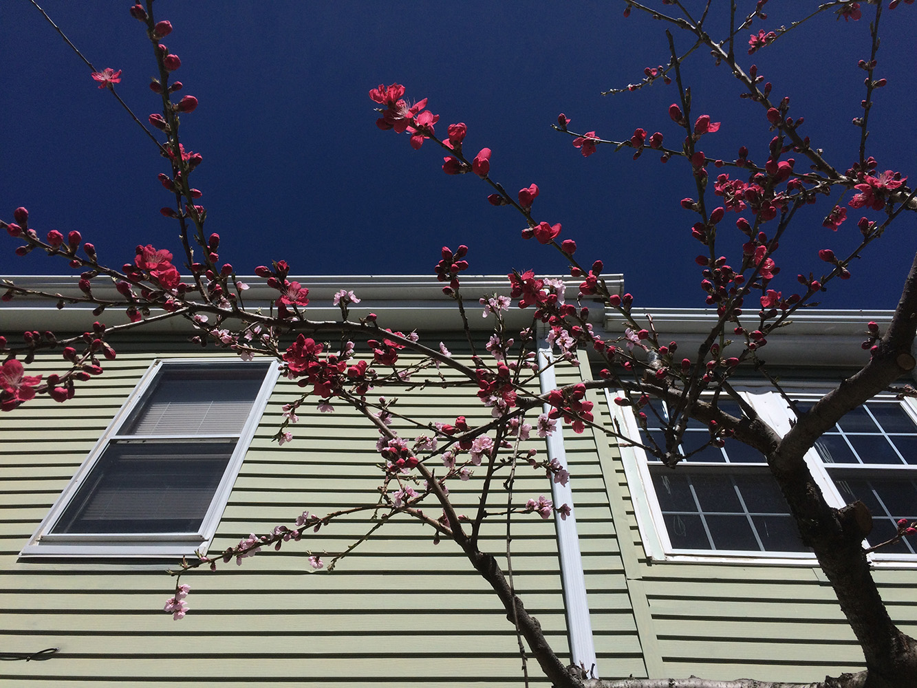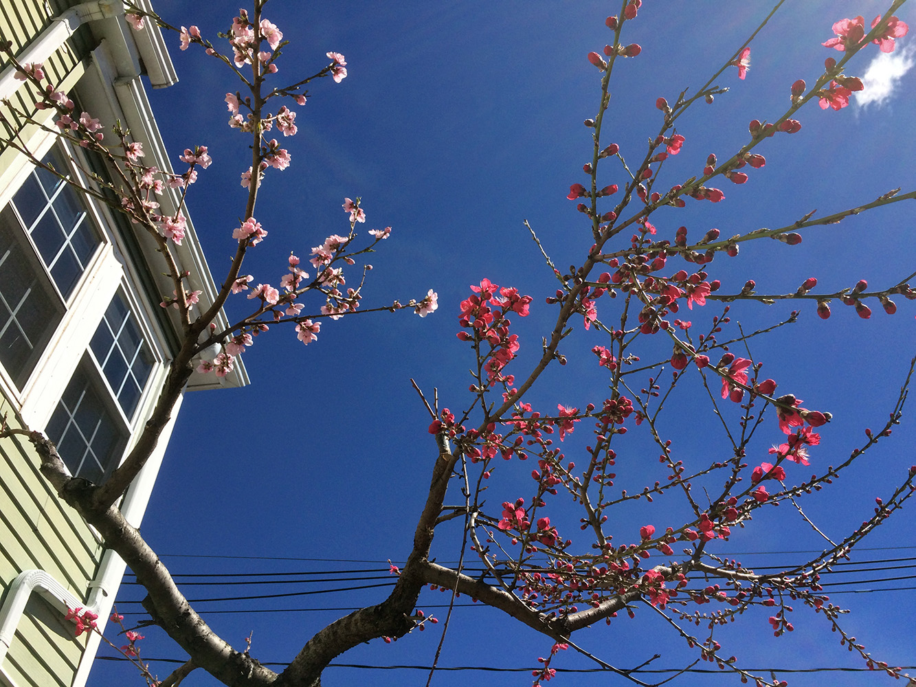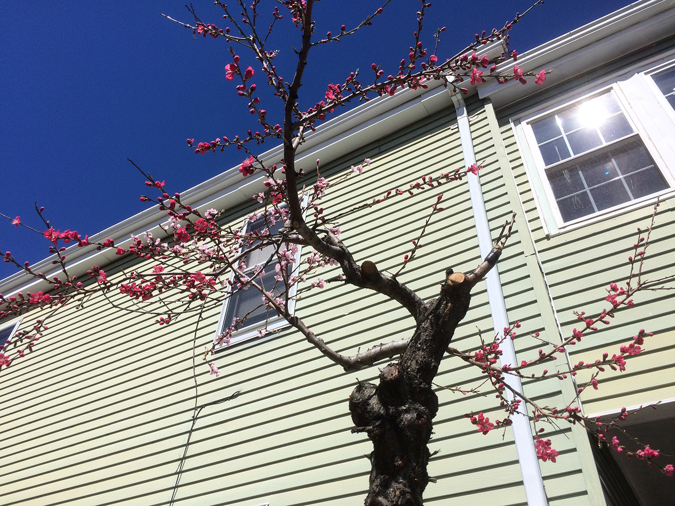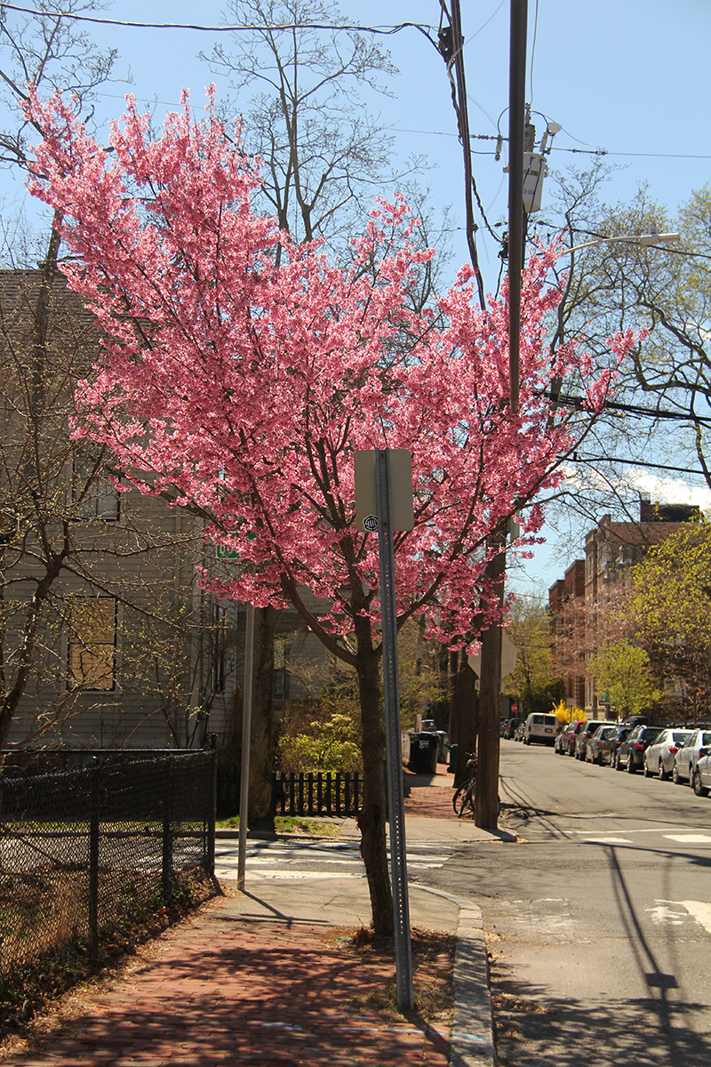 i found myself stopping and checking out every flowering cherry tree that i came across. i saw the most interesting tree on the corner of properzi way and village street. i've known about the flowering trees that grow there for a while now. originally i thought they were crabapples based on the gnarly bark, but upon closer examination they were a type of prunus. not cherry though but something else: flowering plums. and not just any flowering plums: one tree in particular had been grafted so one branch bloomed dark pink blossoms while the other branch had light pink flowers. the trees seemed neglected next to the loading parking space of the metal stamping factory, but it got plenty of sun and for the time being at least it was putting on a show.