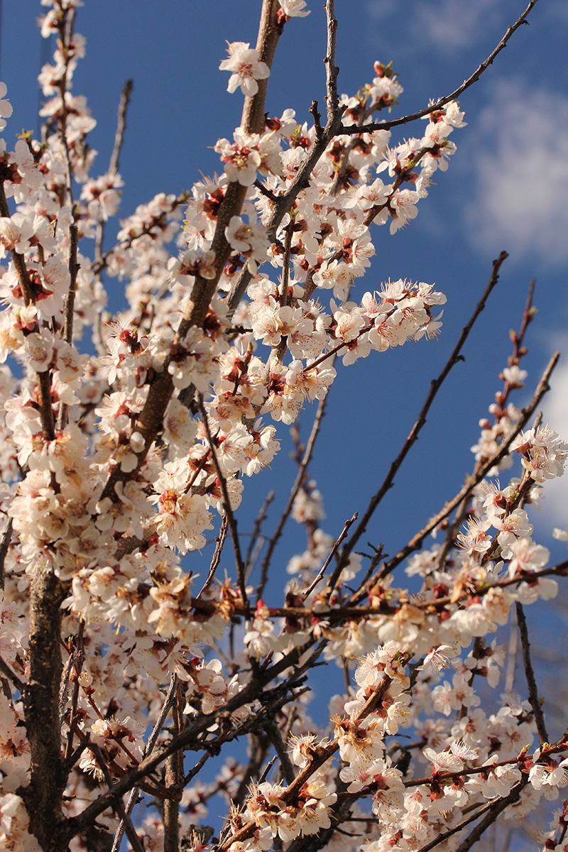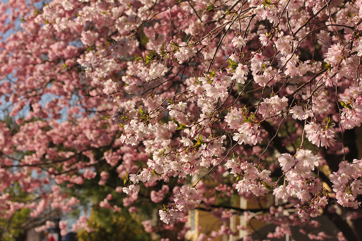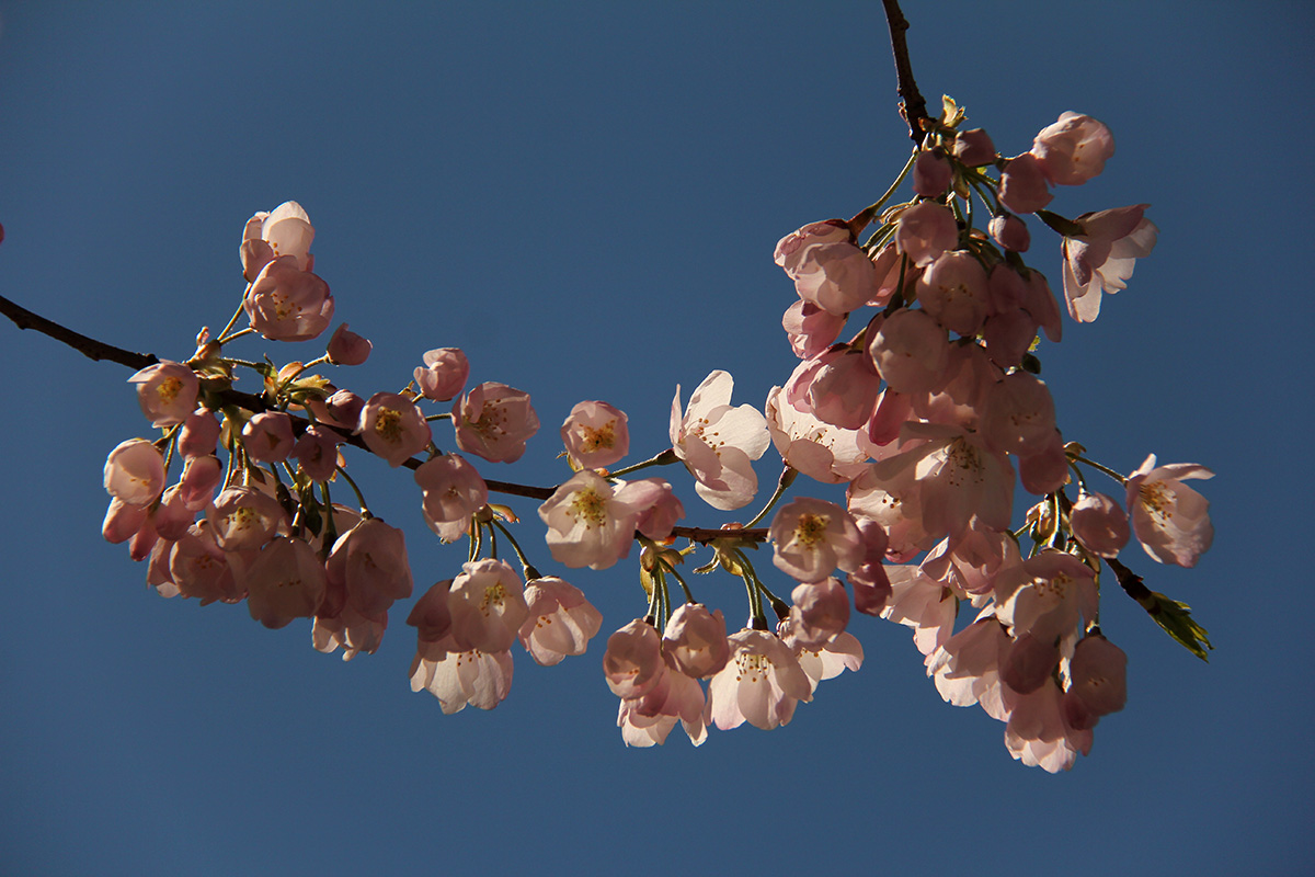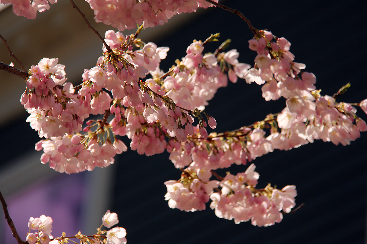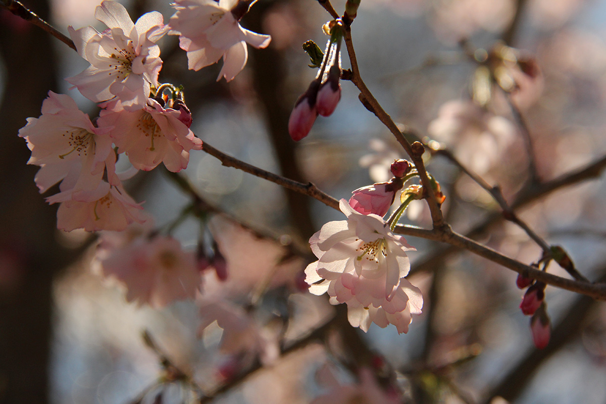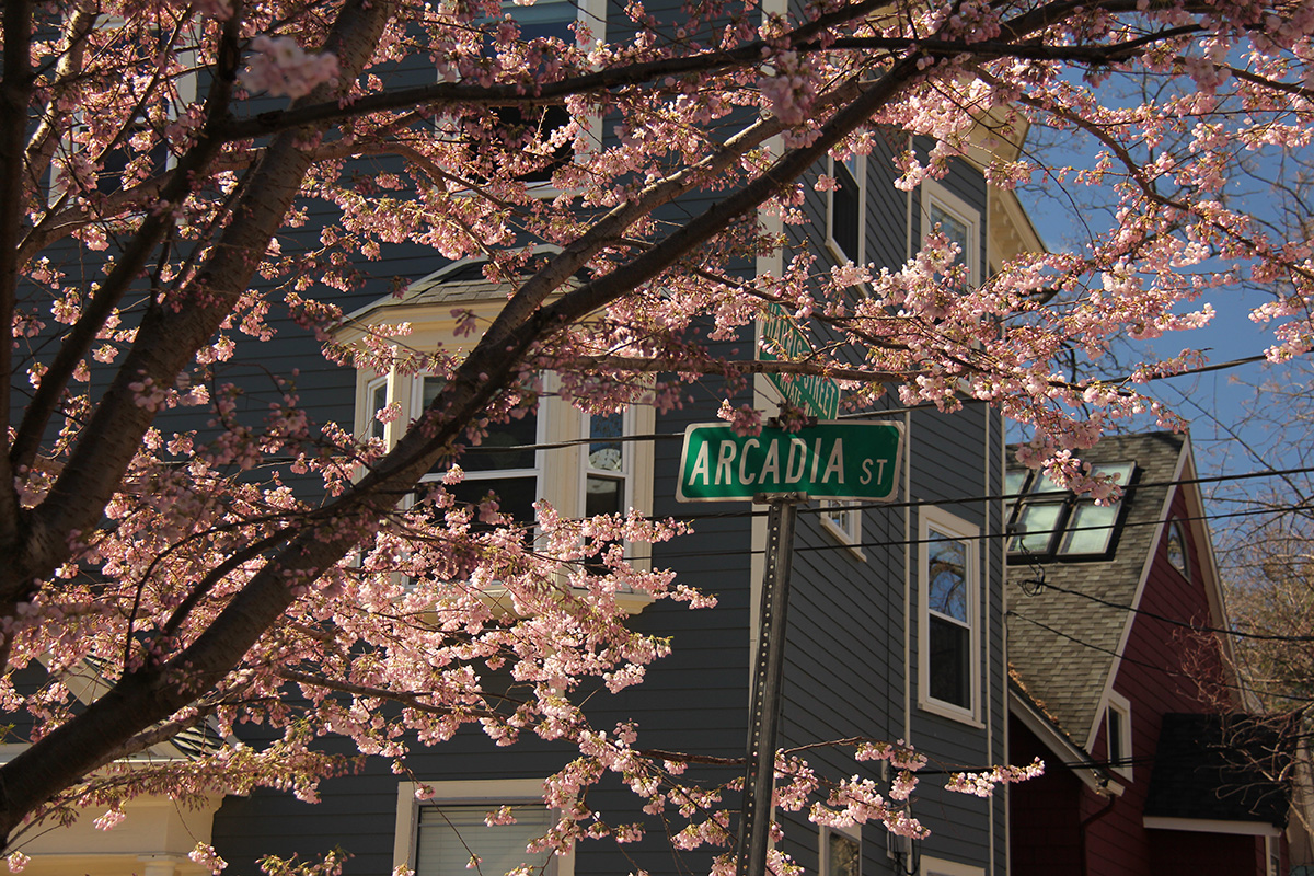i found myself stopping and checking out every flowering cherry tree that i came across. i saw the most interesting tree on the corner of properzi way and village street. i've known about the flowering trees that grow there for a while now. originally i thought they were crabapples based on the gnarly bark, but upon closer examination they were a type of prunus. not cherry though but something else: flowering plums. and not just any flowering plums: one tree in particular had been grafted so one branch bloomed dark pink blossoms while the other branch had light pink flowers. the trees seemed neglected next to the loading parking space of the metal stamping factory, but it got plenty of sun and for the time being at least it was putting on a show.