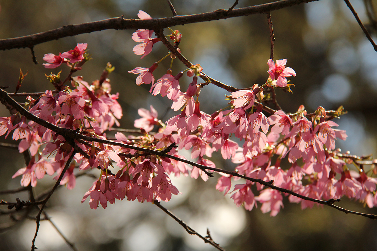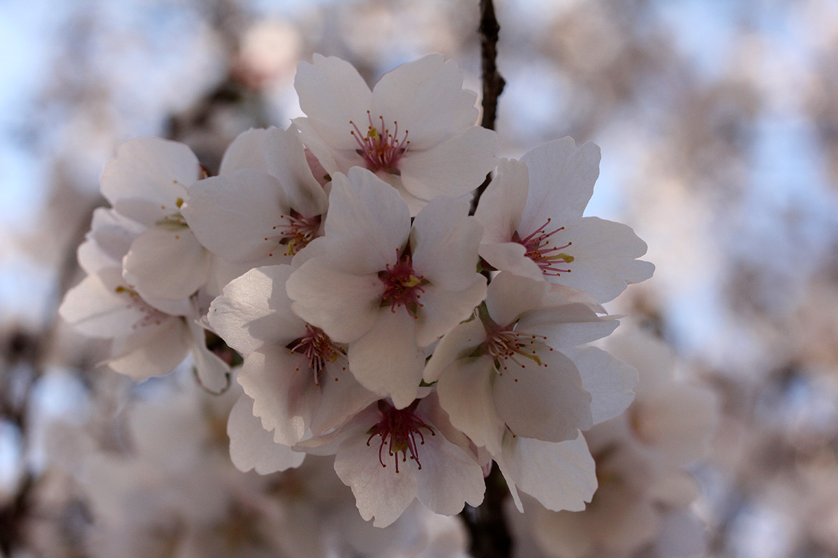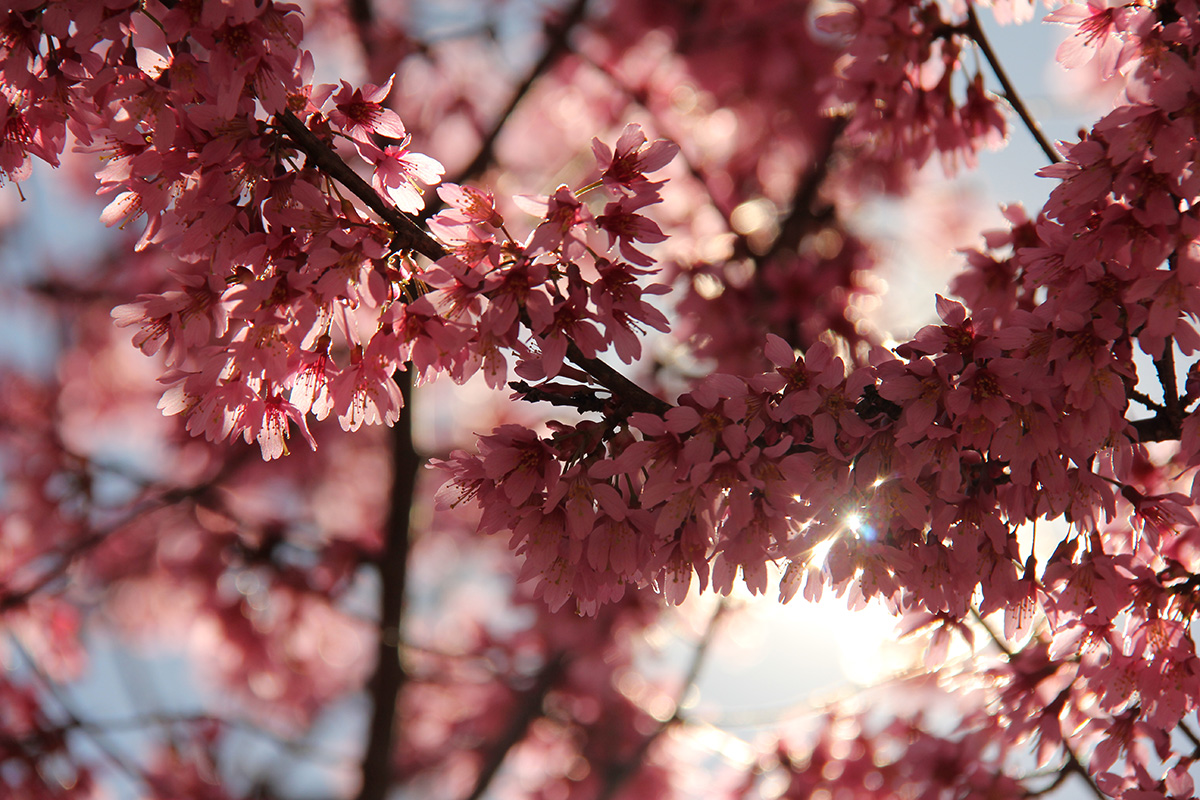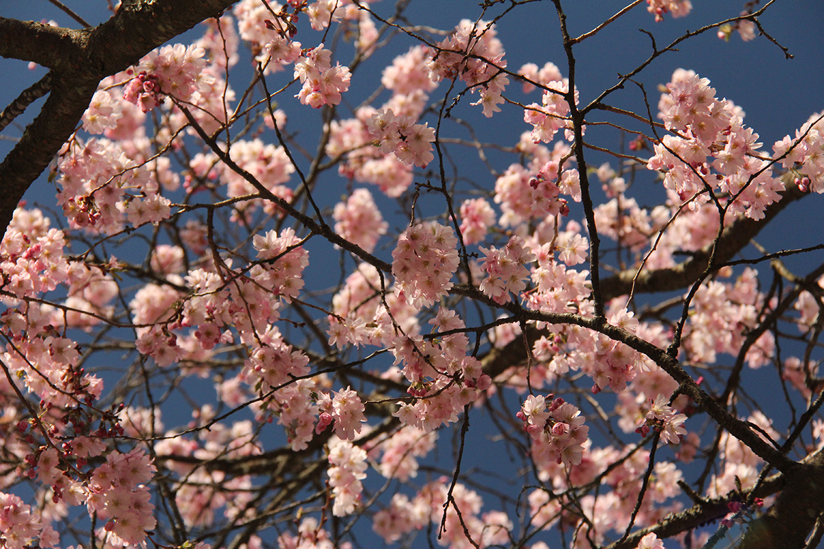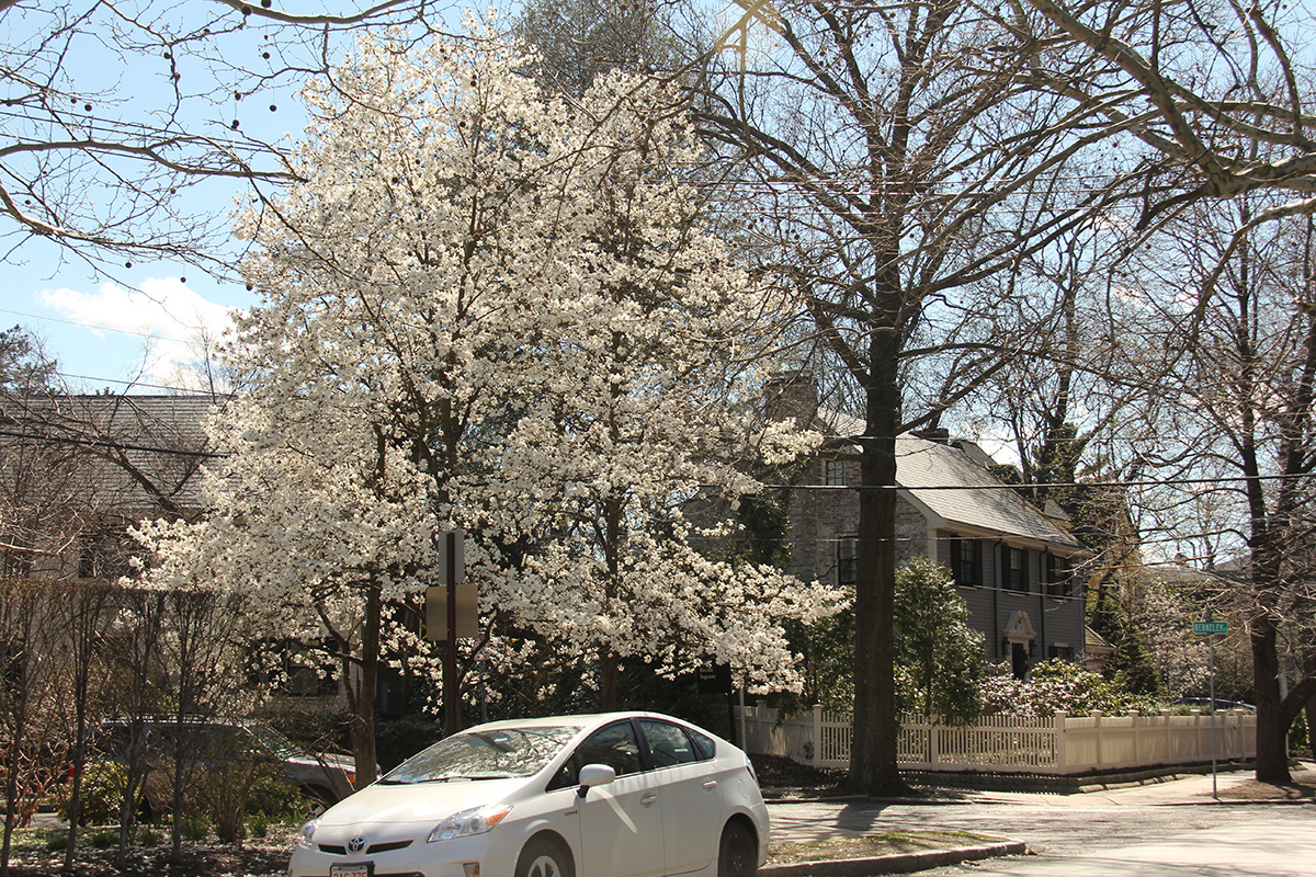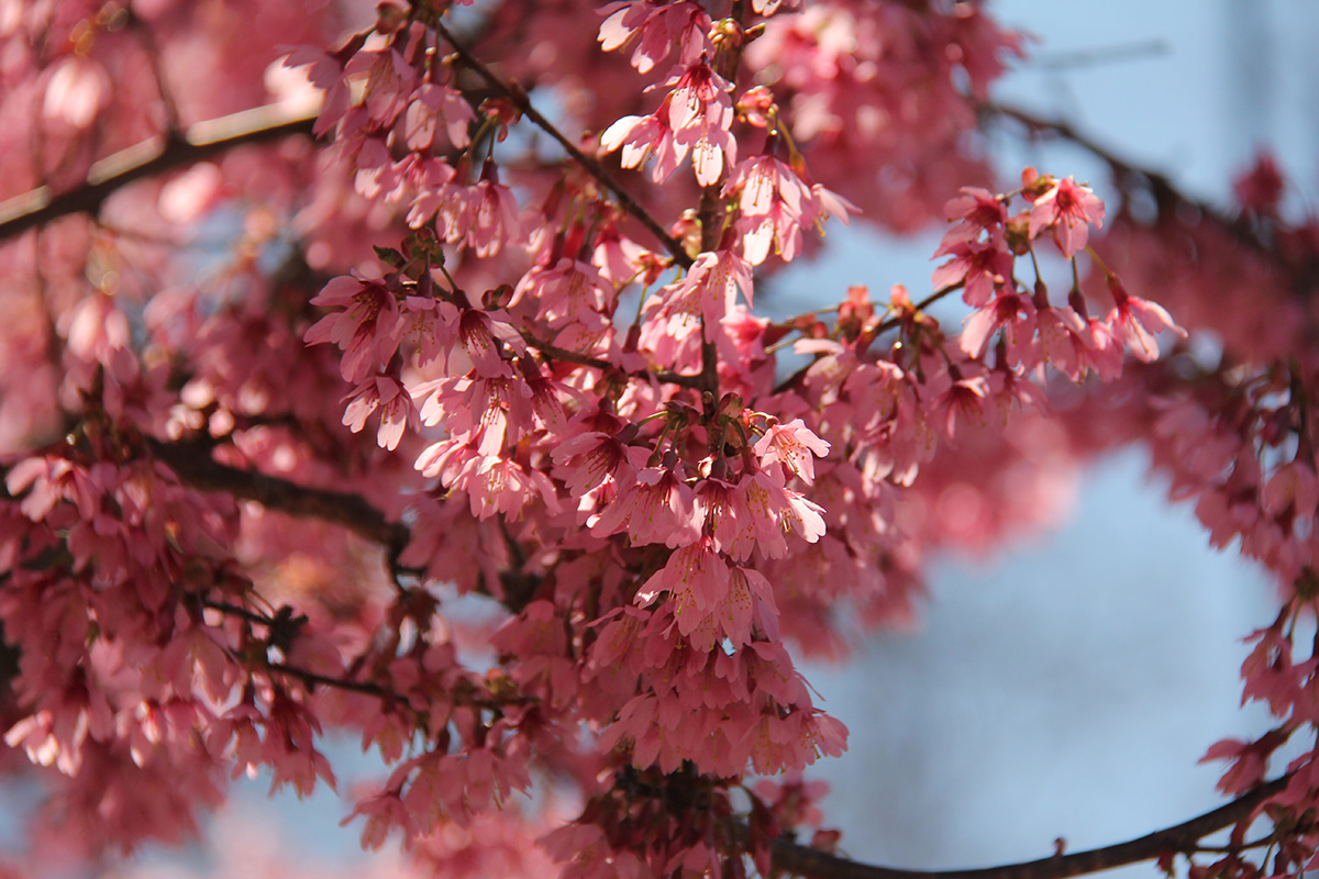 i found myself stopping and checking out every flowering cherry tree that i came across. i saw the most interesting tree on the corner of properzi way and village street. i've known about the flowering trees that grow there for a while now. originally i thought they were crabapples based on the gnarly bark, but upon closer examination they were a type of prunus. not cherry though but something else: flowering plums. and not just any flowering plums: one tree in particular had been grafted so one branch bloomed dark pink blossoms while the other branch had light pink flowers. the trees seemed neglected next to the loading parking space of the metal stamping factory, but it got plenty of sun and for the time being at least it was putting on a show.