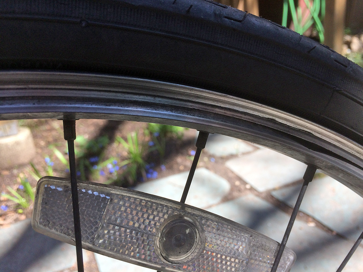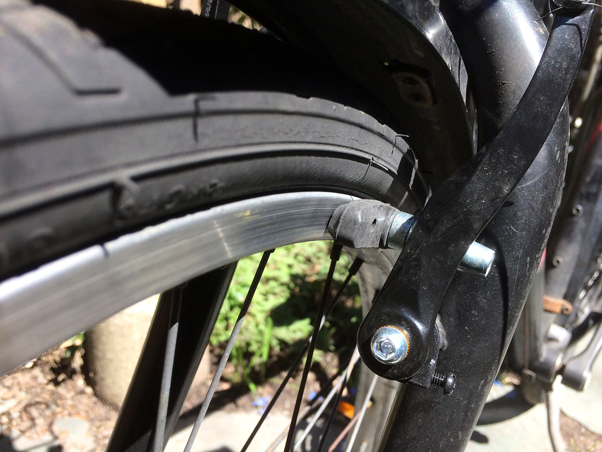 i spent the morning fixing the front brakes on my cargo bike. the left brake pad had come loose because the thread holding the nut in place had been stripped. the brake pad had wobbled around and there was a deep gash where the pad made contact with the corner of the rim. i ended up having to replace both pads, as replacing one would create an imbalance. fortunately i had some slightly used pads so i didn't have to use new pads on the old rim. unfortunately the rim was in such terrible shape - danger of collapsing in on itself - that i wouldn't be able to ride the bike safely even after replacing the pads. i had to get a new wheel. so after changing out the pads, i put the cargo bike back in the basement.