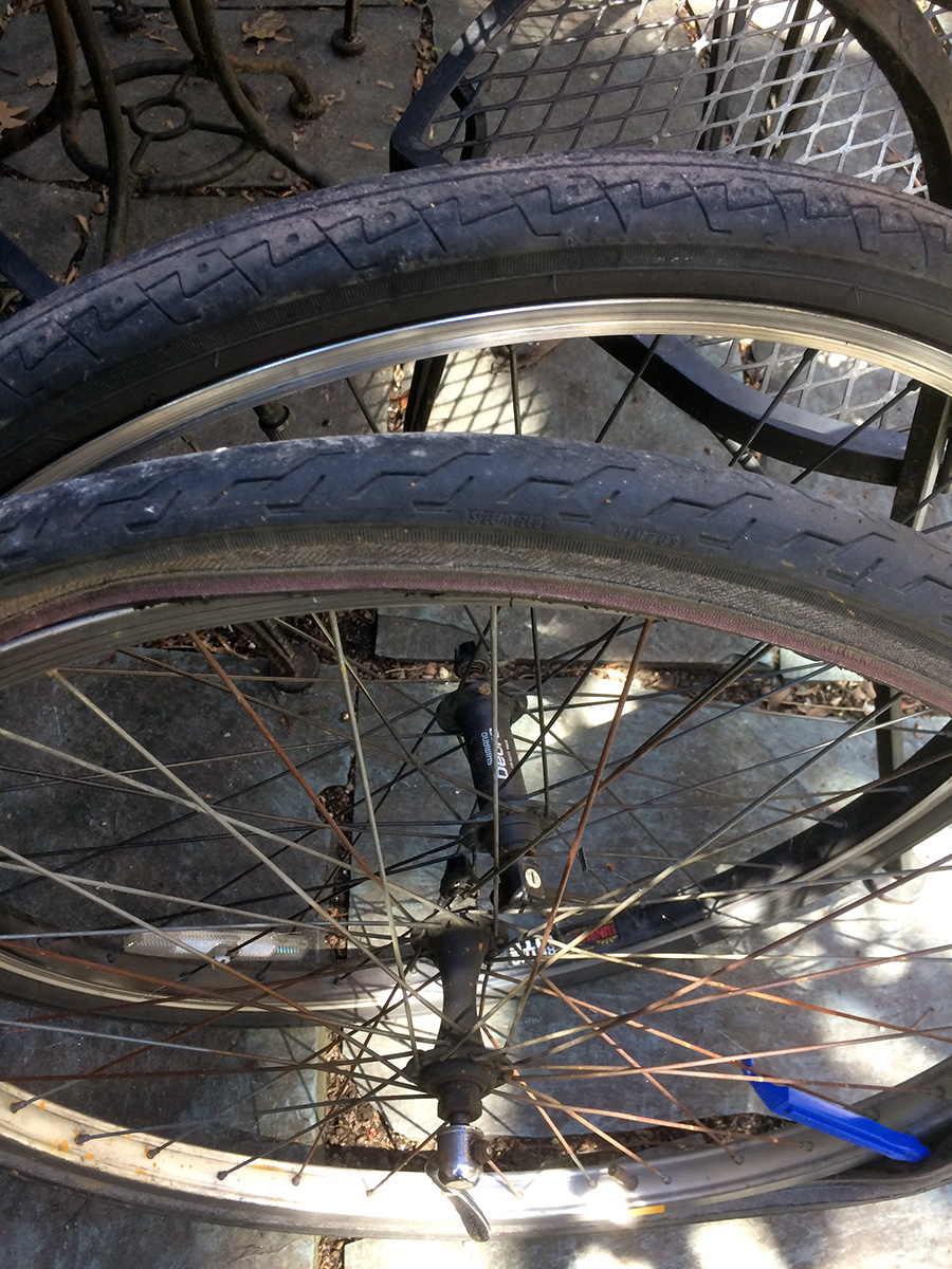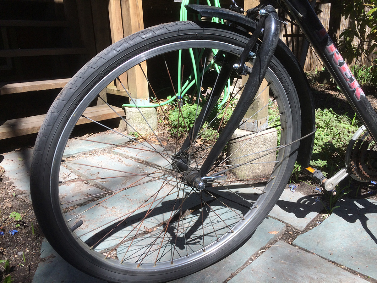 that's when i got an idea: i could reuse the front wheel from the used mountain bike ed gave me. both were 26" wheels, the replacement wheel had a tiny dish to it, but not enough to rub up against the brake pads. so i brought the cargo bike back out, flipped it upside down, and swapped out the wheel. it would've been easy were it not for the fact that the tube in the replacement wheel was leaking. not a little leak, but a lot, enough that i could see it deflate immediately after i pumped it up. so i had to swap out the tire and the tube. i noticed that the replacement wheel's tube had been patched twice in the past but apparently wasn't enough to fix it. the tire/tube was easy to remove from the replacement wheel but nearly impossible to get off of the old wheel. plastic tire levers didn't work and i had to use my stainless steel ones, which damaged the edge of the tire a bit, but only cosmetic and nobody would see it once i installed it on the replacement wheel.