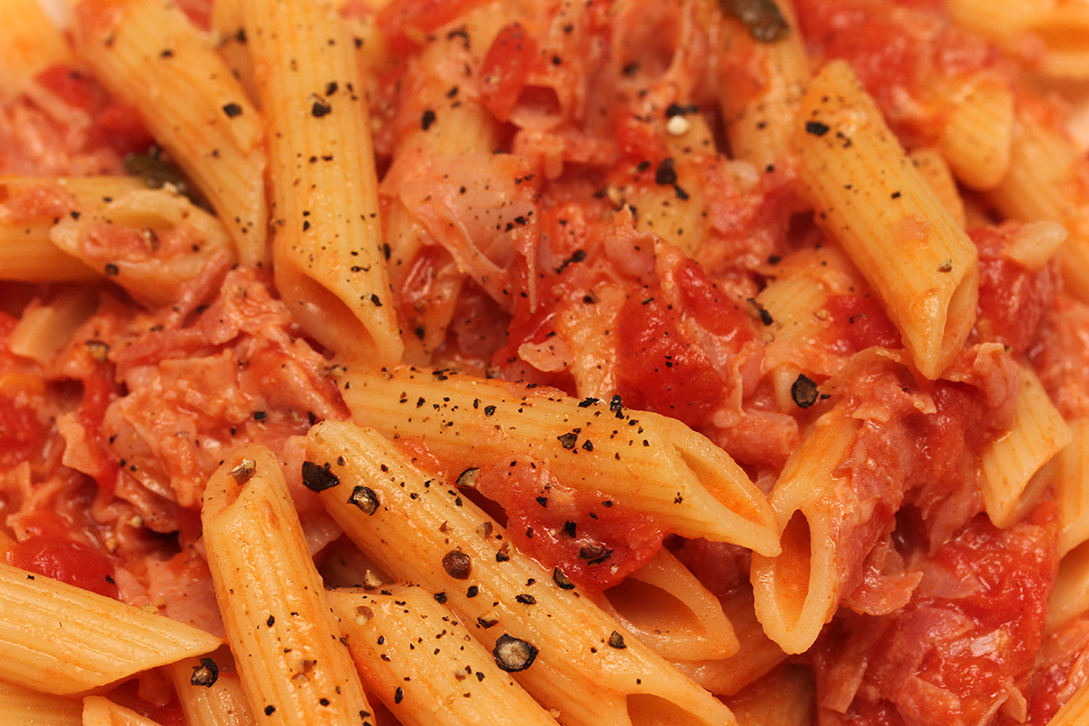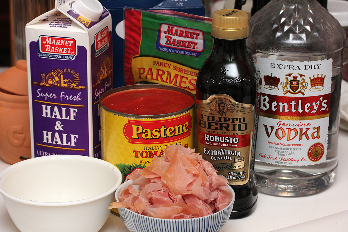 in the afternoon i rode the cargo bike to market basket (MB). haven't had good brakes for a while now, i found myself not trusting in the bike's ability to stop in time and out of habit just avoided using the brakes. it's been more than 2 weeks since i last went to MB. i left with $30 worth of groceries, much of that price was for a pound of prosciutto ($5.69) and a bottle of olive oil ($5.49). i decided earlier that i would make a penna alla vodka recipe for dinner.