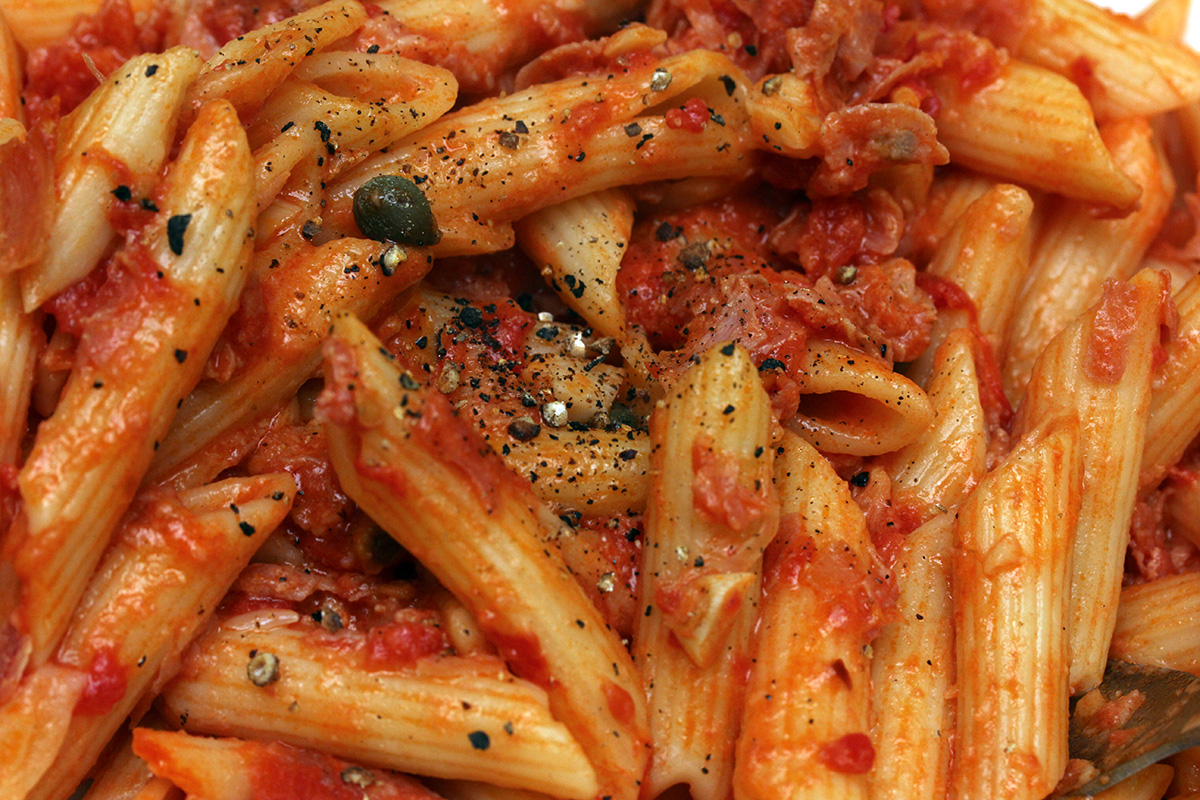 i had a bowl of salad in the early evening before having half of the leftover pasta from yesterday. penne alla vodka doesn't taste so good as leftover, but i heated it over the stove, which beat the microwave at least. i wanted to throw in a piece of anchovy but ended up sprinkling some capers just to add some more flavor.