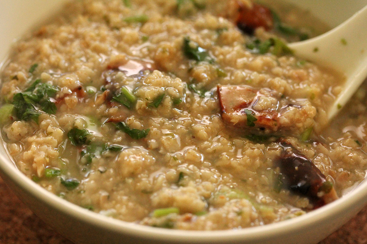 | grill chicken sausage then chop into pieces. instant oatmeal makes for a better texture. hot water makes for faster cook time. the anchovy is mixed with the oatmeal for an additional umami flavor. worcestershire sauce can be substituted for black vinegar. | |