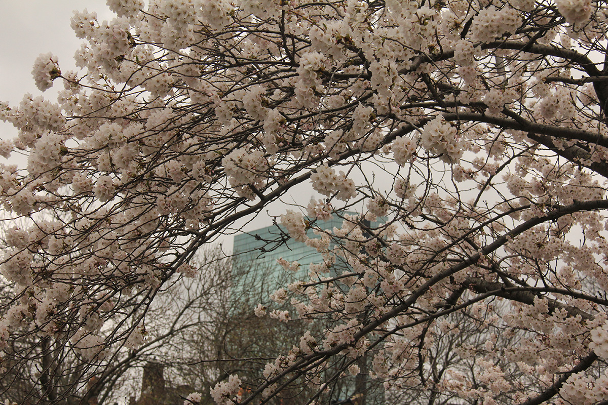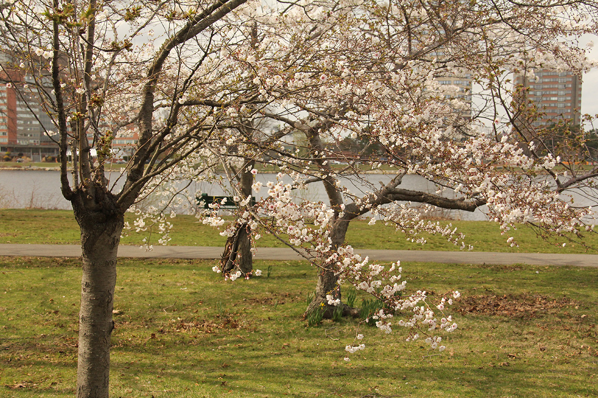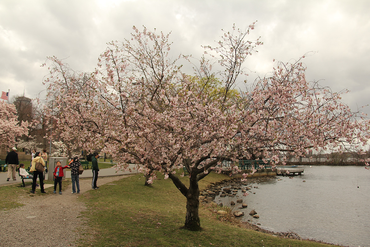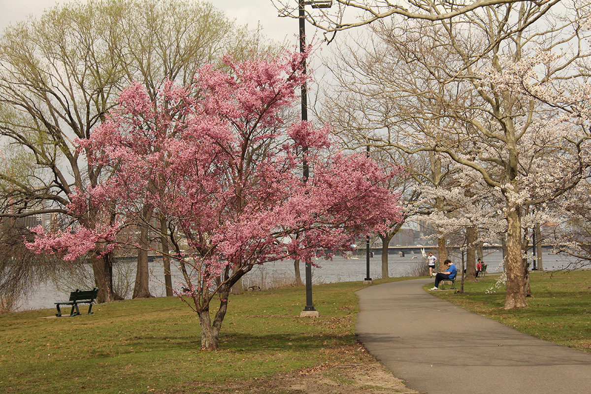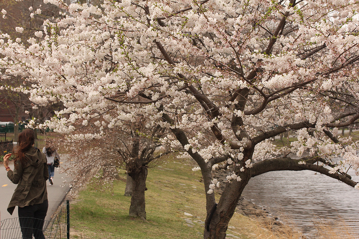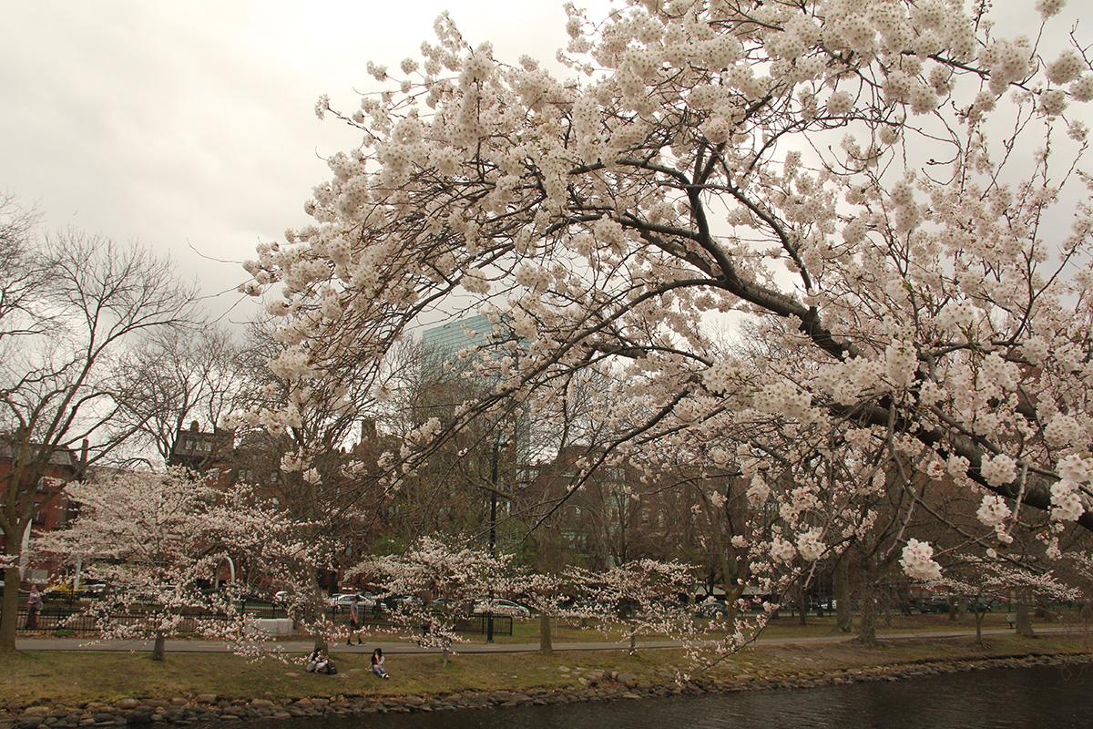 i purposely crossed storrow drive via a pedestrian overpass. i biked through BU's campus, then crossed the BU bridge so i could be on the memorial drive side of the river, across from microcenter, on magazine beach, where a week ago i already saw some flowering kwanzans. there were more flowers, but they were at peak yet, as there were plenty of buds yet to blossom. i tried taking some photos but it was very windy and the kept on swaying in the wind.