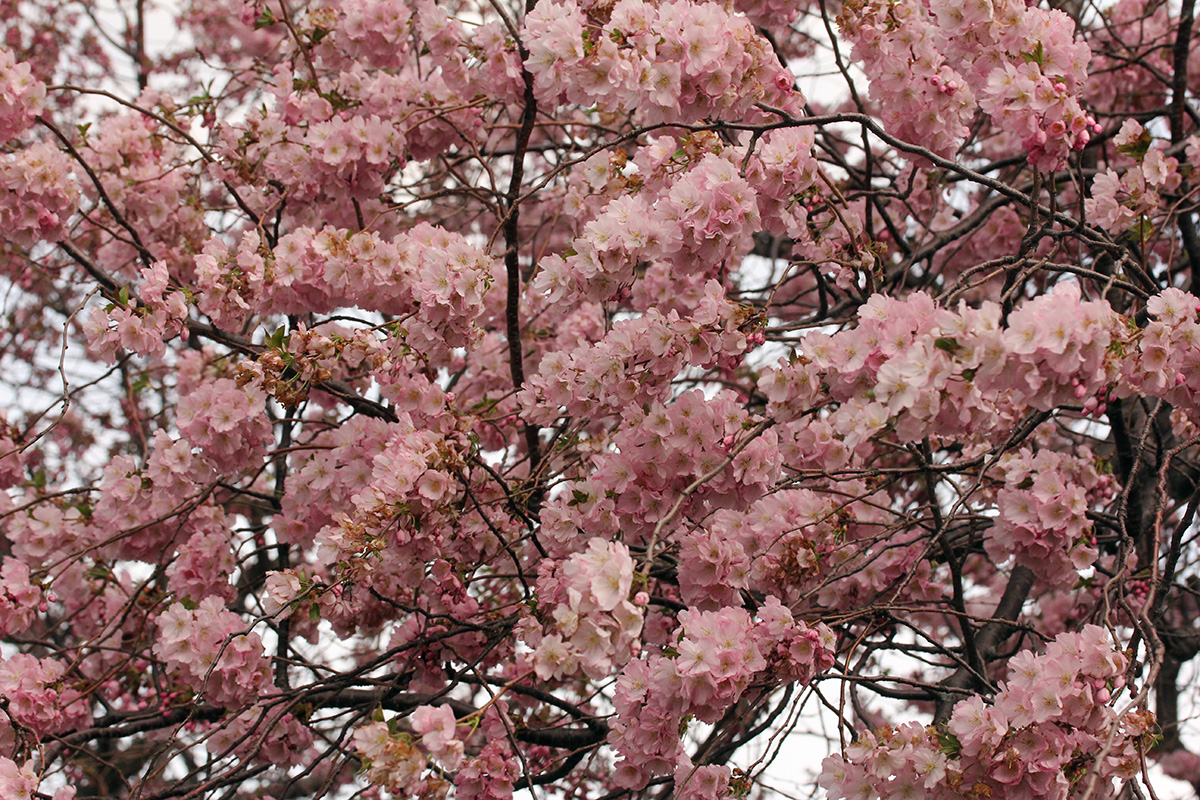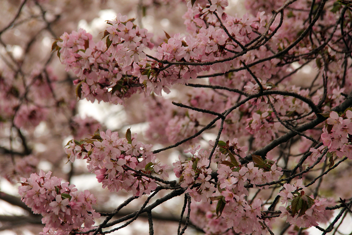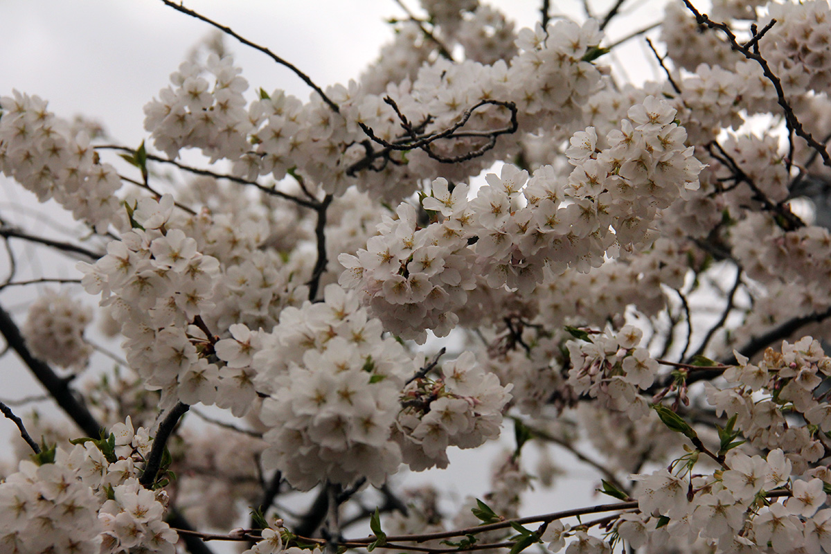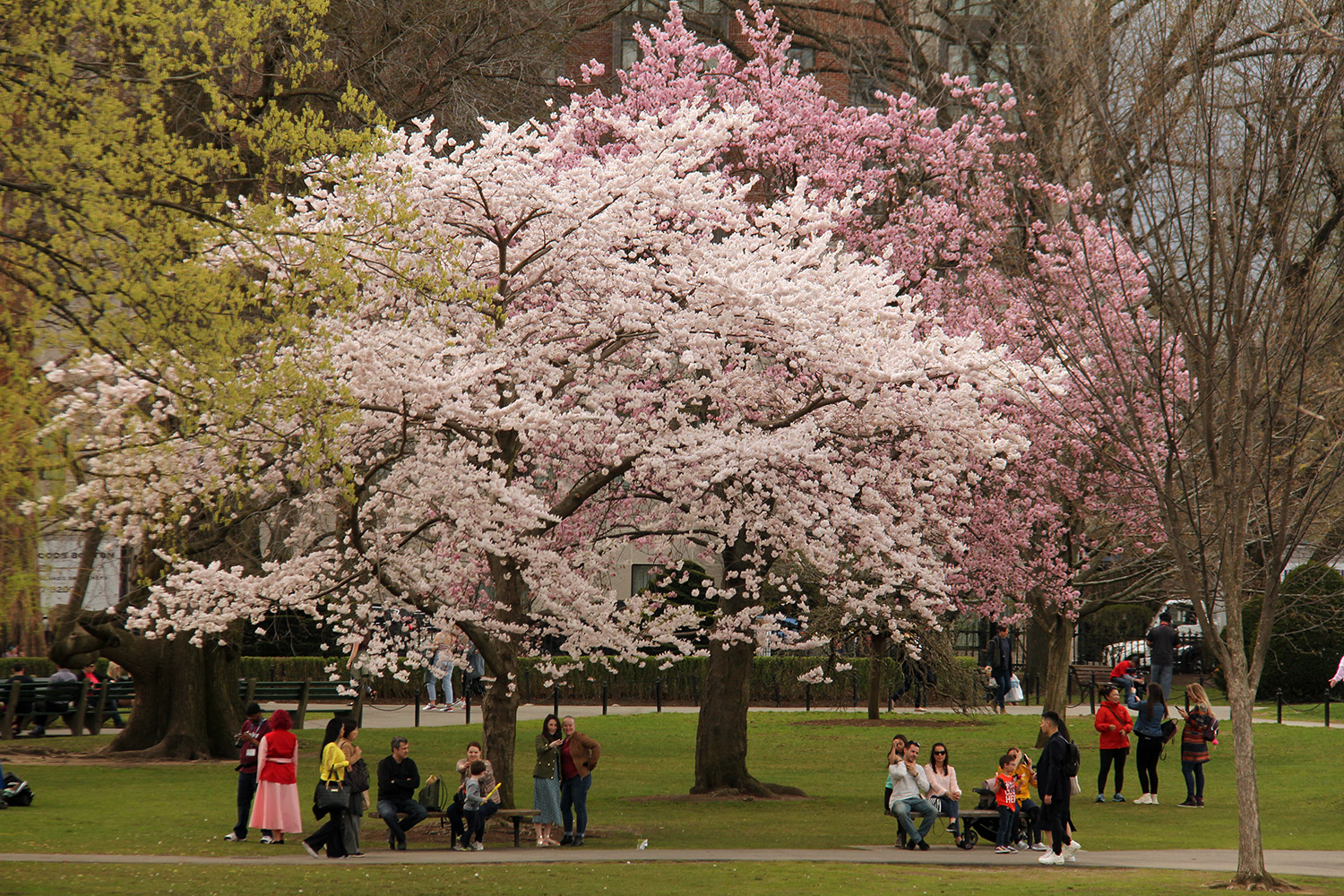 beyond the mass ave bridge, across from boston university, were even more flowering cherries. here students were out enjoying the overcast but warm day, taking selfies underneath the cherries. here i saw my first kwanzans, spectacular pink canopies of blossoms. i also saw cherries i hadn't seen before, like a deep pink okamesque tree (long slender petals) and smaller white cherry flowers with either pale yellow or deep pink centers. some of these trees weren't in good shape, pruned haphazardly, but even those still flower in the spring.