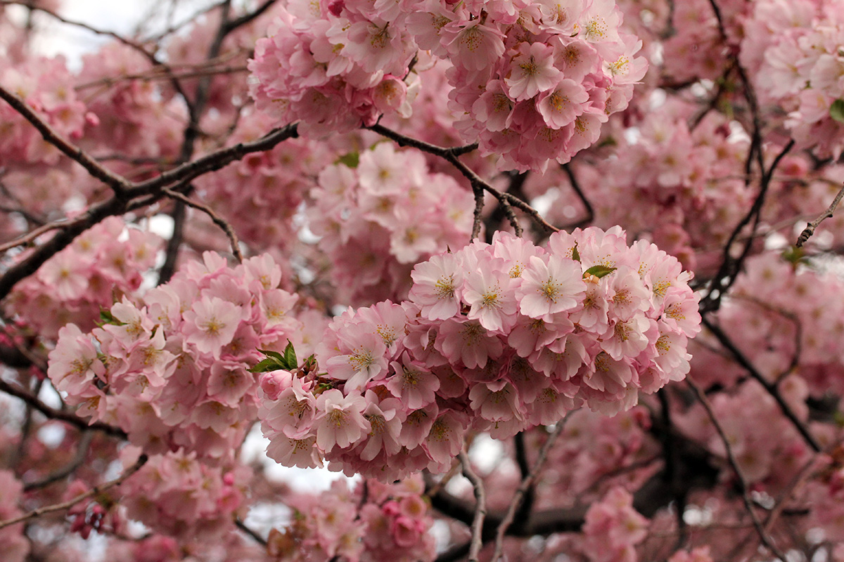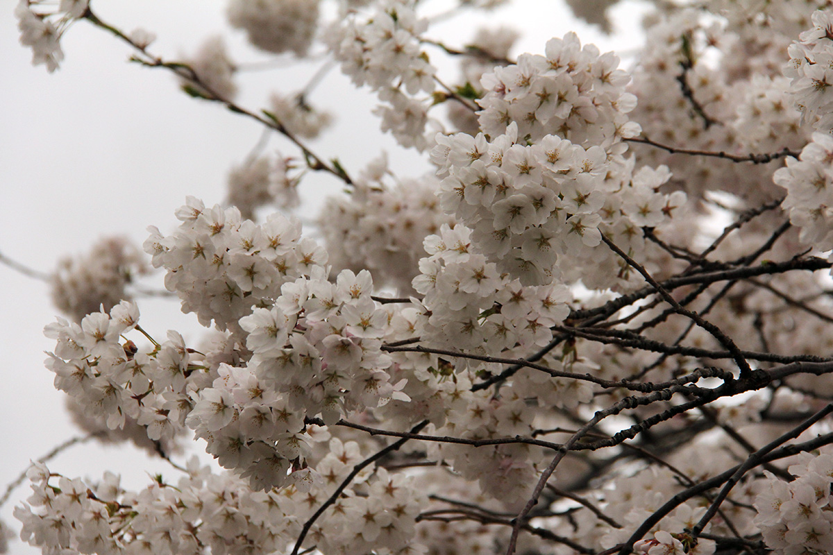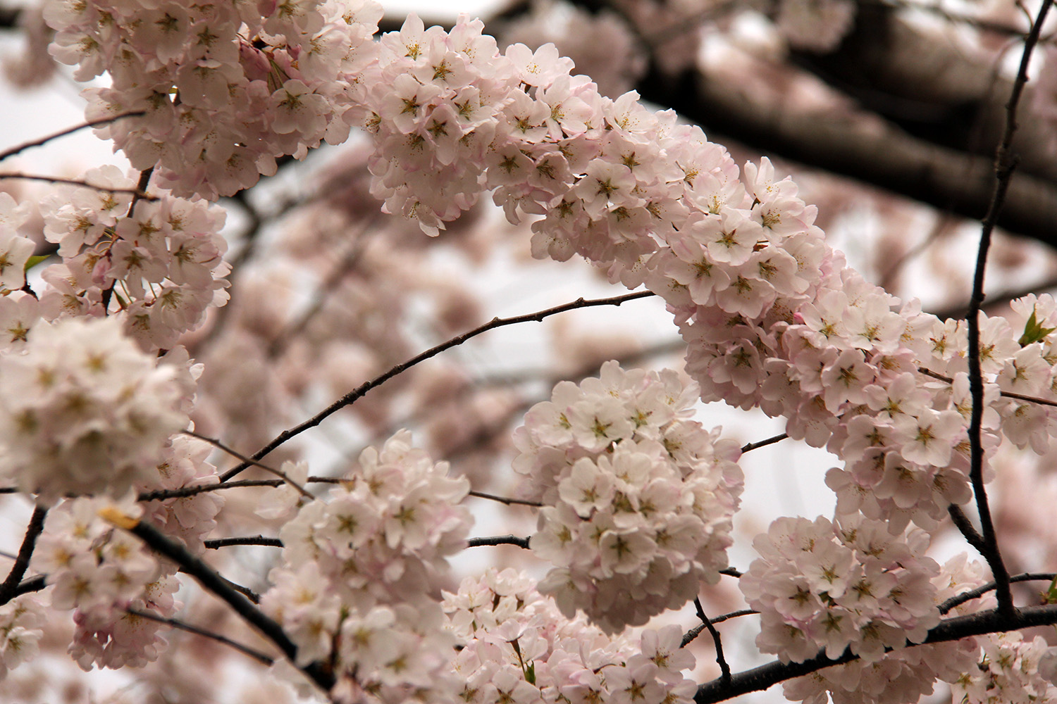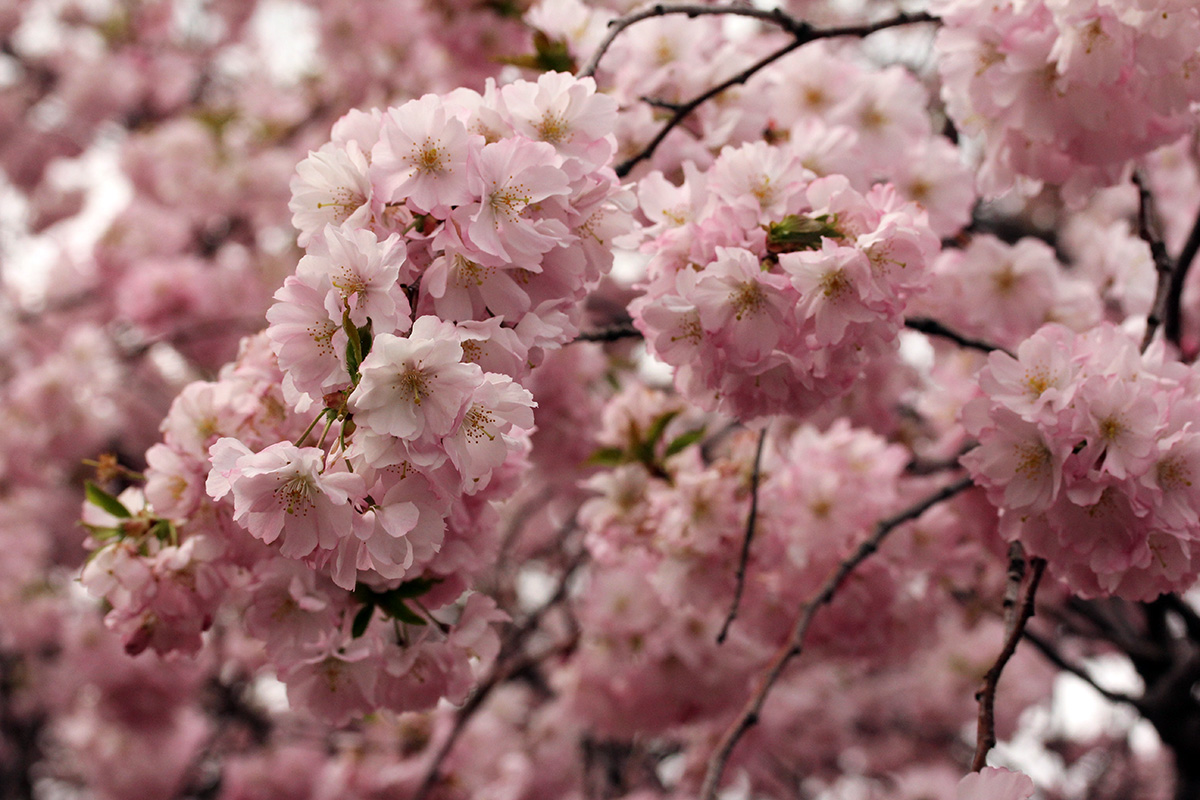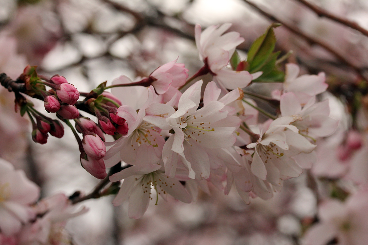 beyond the mass ave bridge, across from boston university, were even more flowering cherries. here students were out enjoying the overcast but warm day, taking selfies underneath the cherries. here i saw my first kwanzans, spectacular pink canopies of blossoms. i also saw cherries i hadn't seen before, like a deep pink okamesque tree (long slender petals) and smaller white cherry flowers with either pale yellow or deep pink centers. some of these trees weren't in good shape, pruned haphazardly, but even those still flower in the spring.