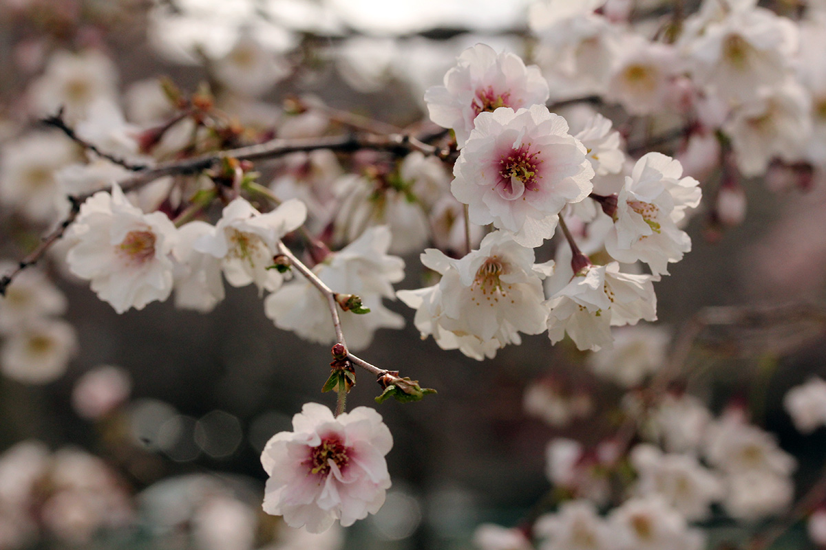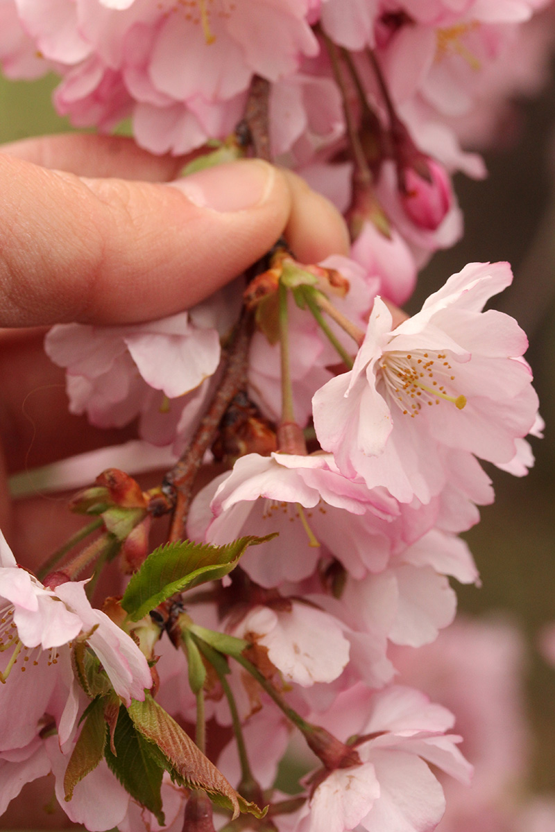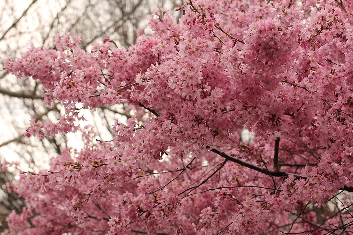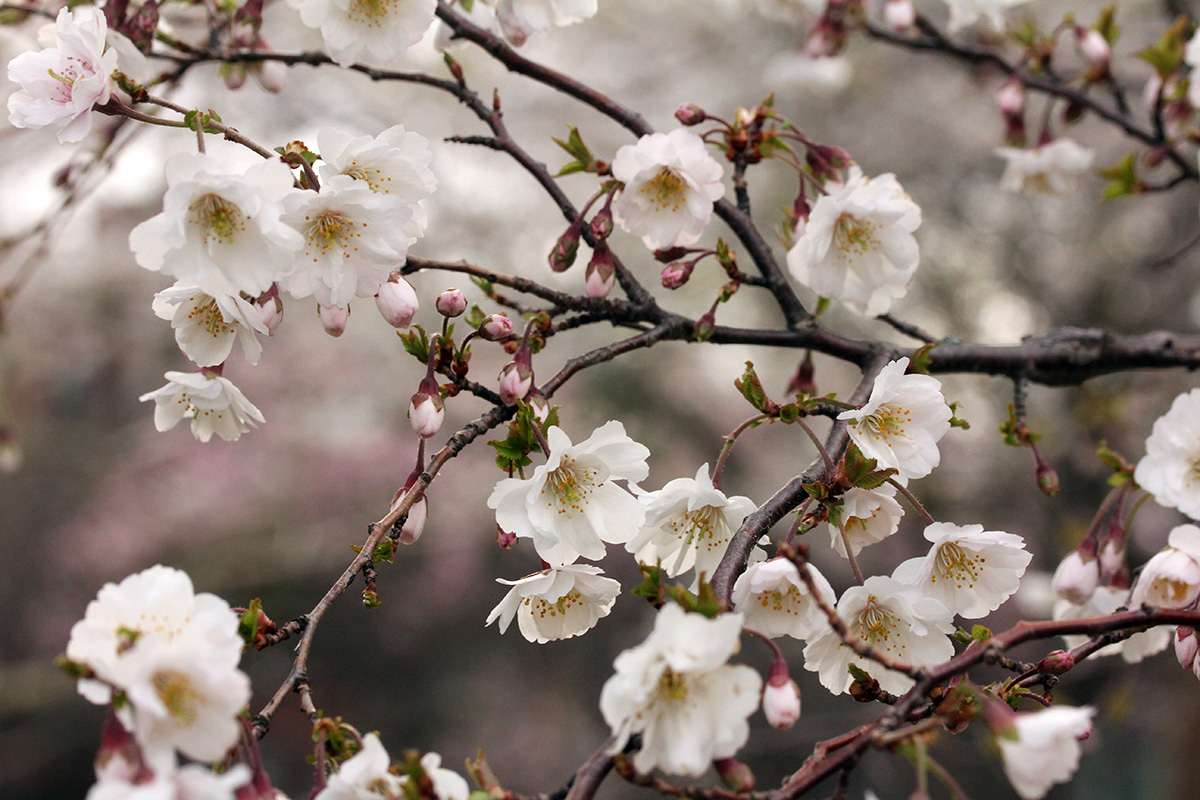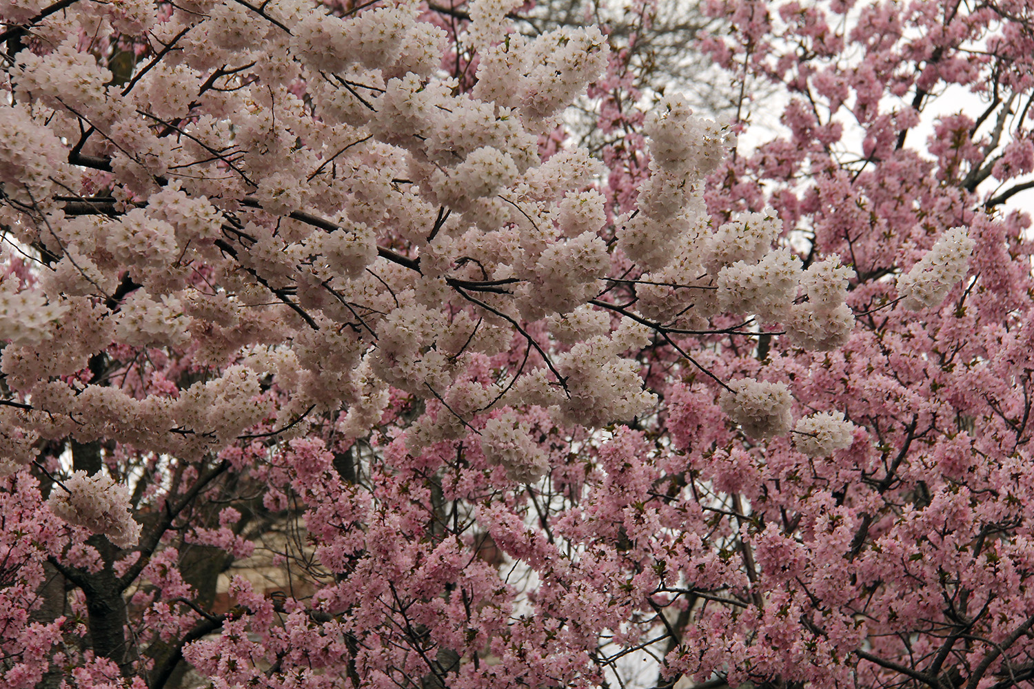 the light pink flowering tree i first encountered was probably a sargent cherry AKA hill cherry, a large cold hardy and long-living cherry from the japanese northern region. the white/pale pink blossoms were most likely yoshino cherries, the way the flowers are arranged in puffy sleeves are very characteristic of this variety. the nearby pink flower variety i couldn't identity.