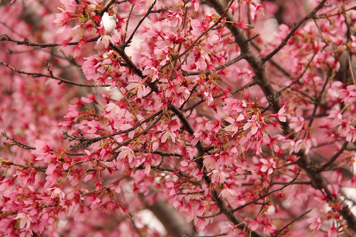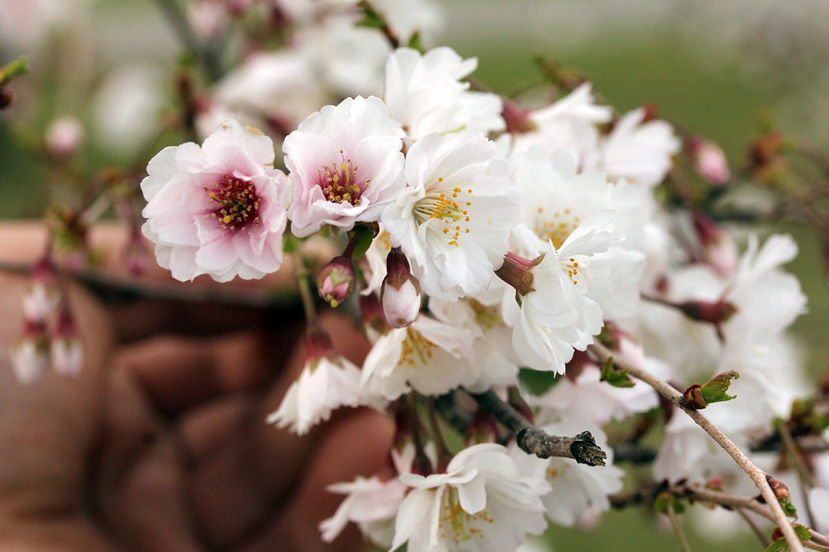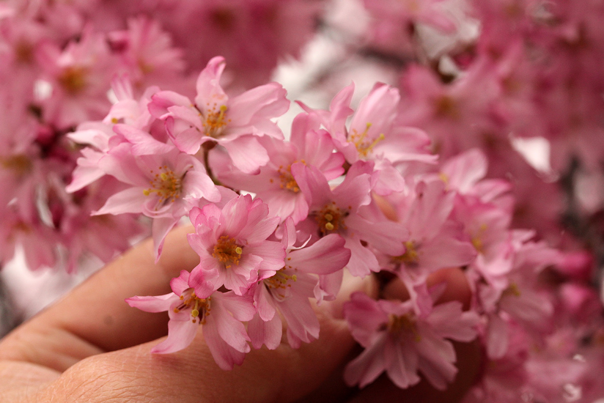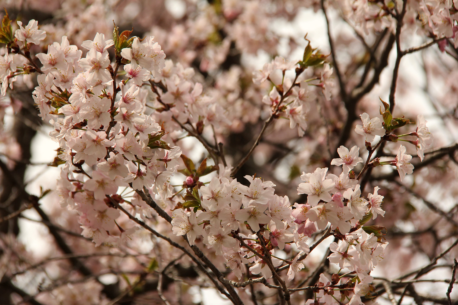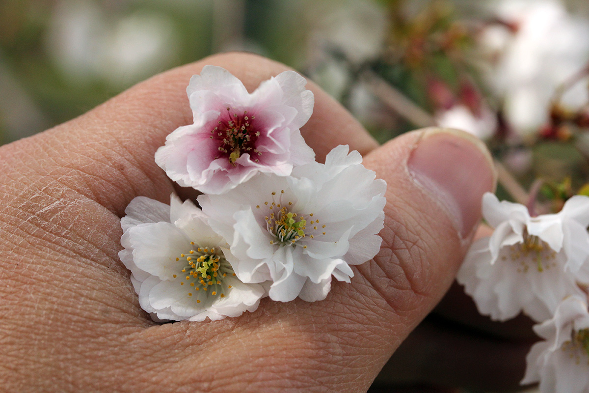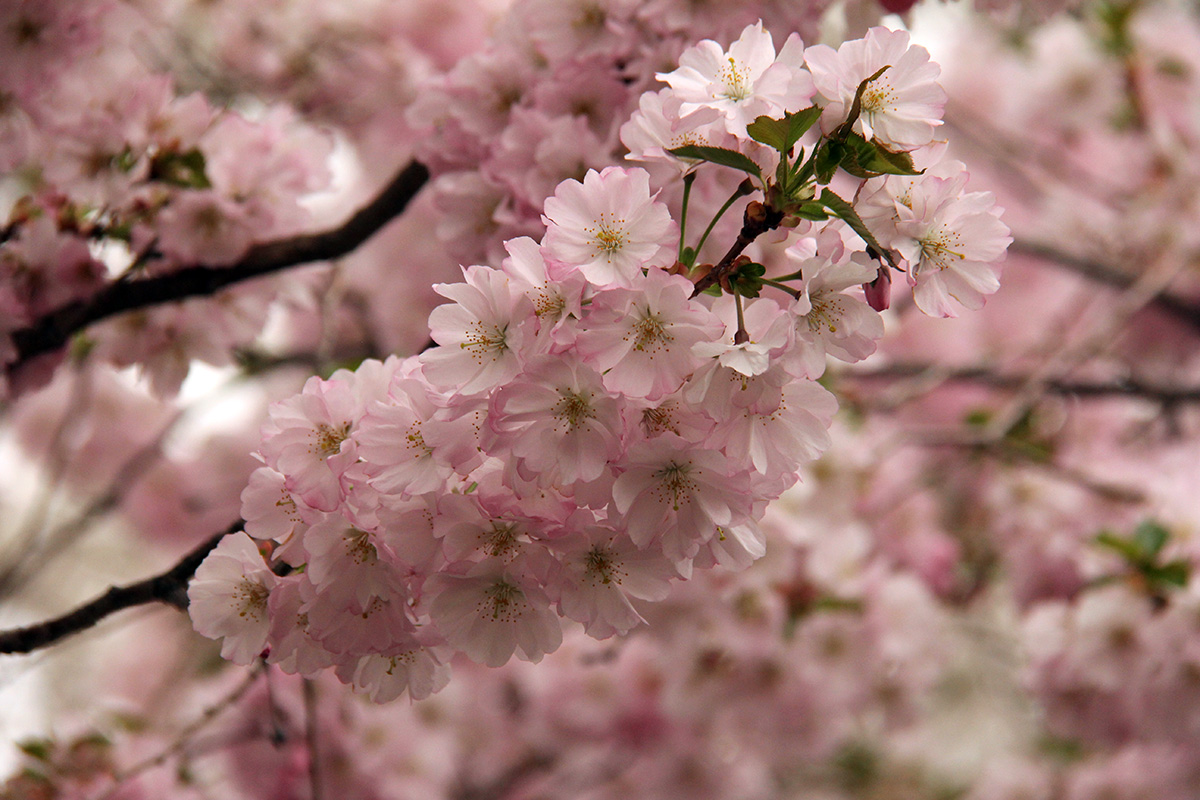 the light pink flowering tree i first encountered was probably a sargent cherry AKA hill cherry, a large cold hardy and long-living cherry from the japanese northern region. the white/pale pink blossoms were most likely yoshino cherries, the way the flowers are arranged in puffy sleeves are very characteristic of this variety. the nearby pink flower variety i couldn't identity.