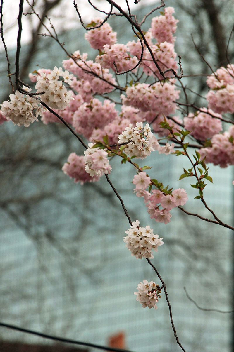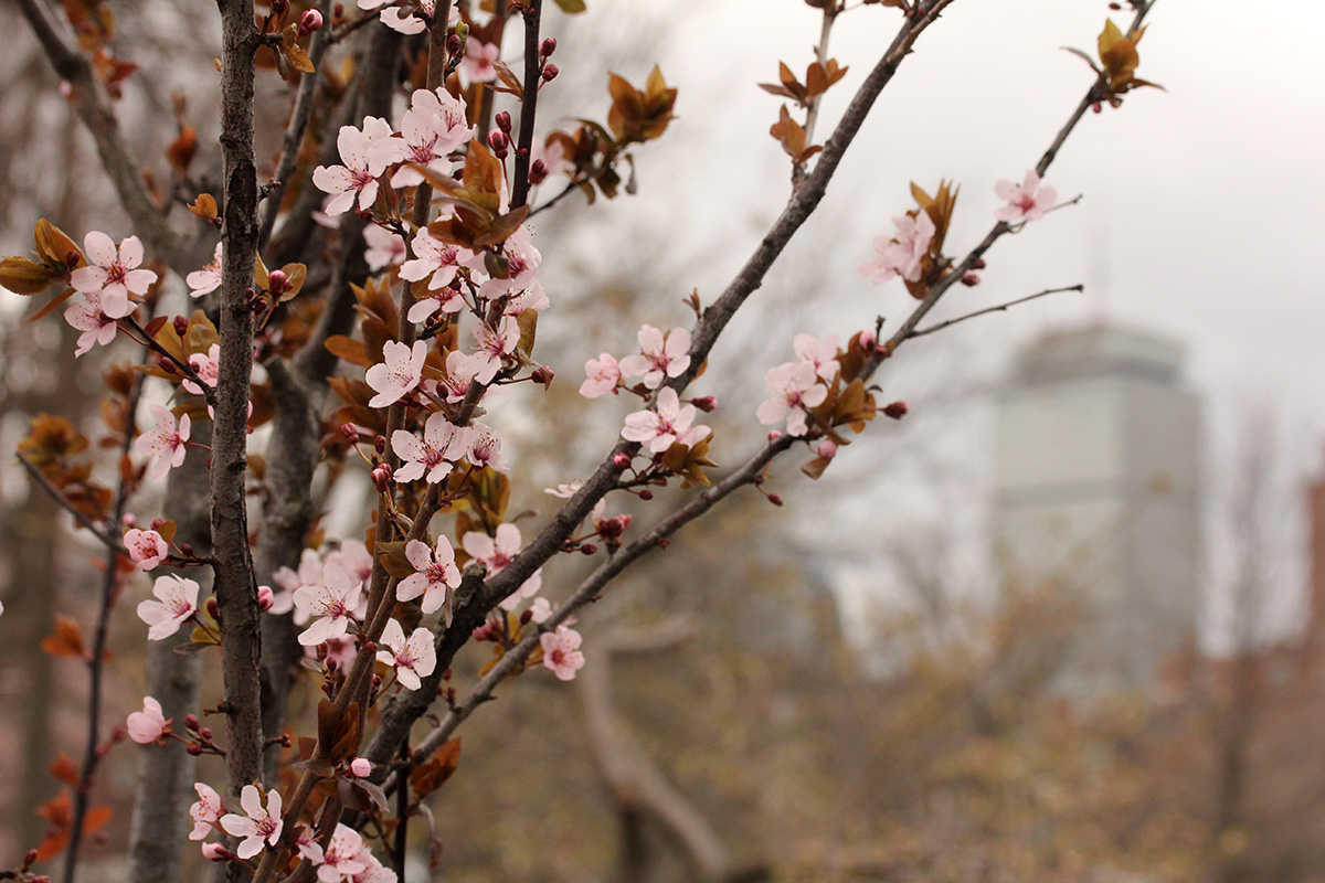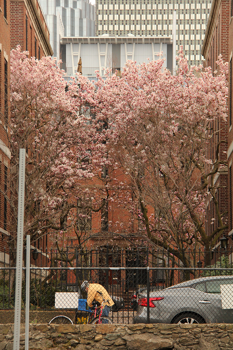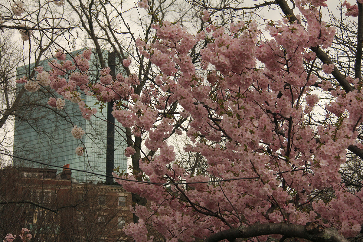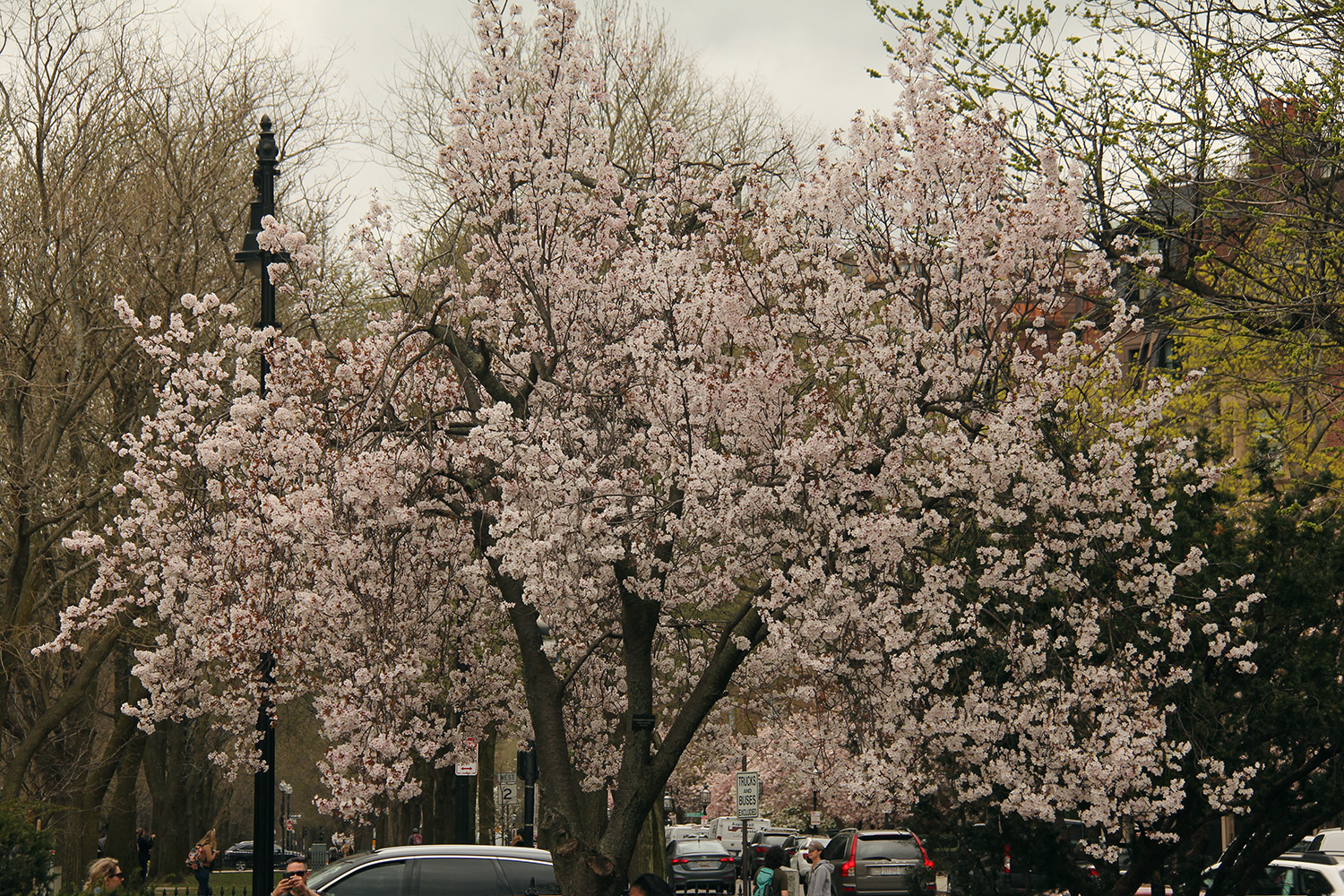 there were also a few flowering trees by the entrance facing commonwealth avenue, they also looked like flowering plums because the flowers seemed kind of purply and the leaves were also purplish red, but they were definitely cherries. and down commonwealth avenue were a boulevard of sidewalk magnolias.