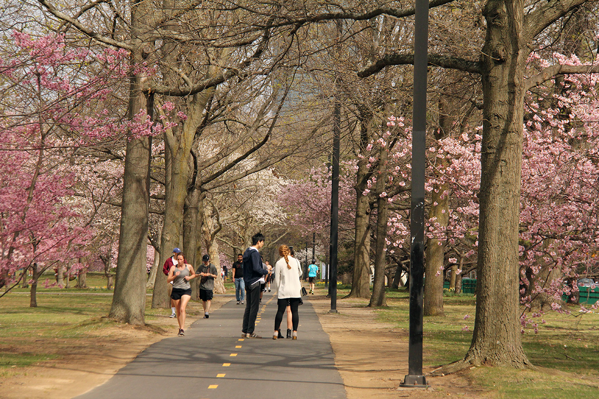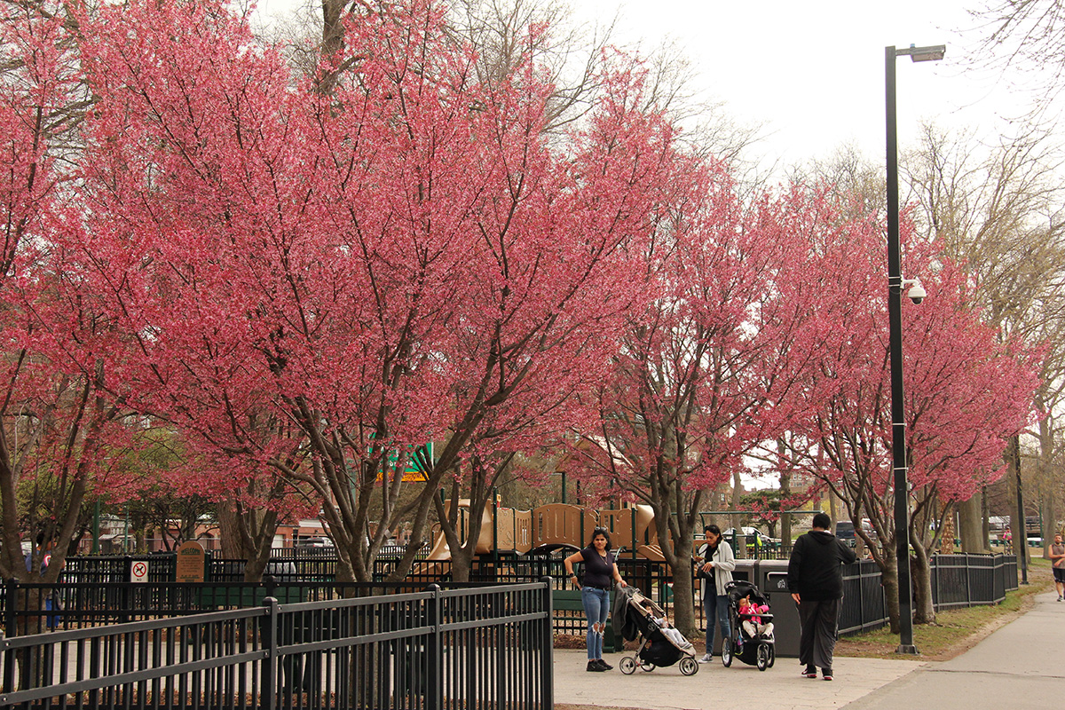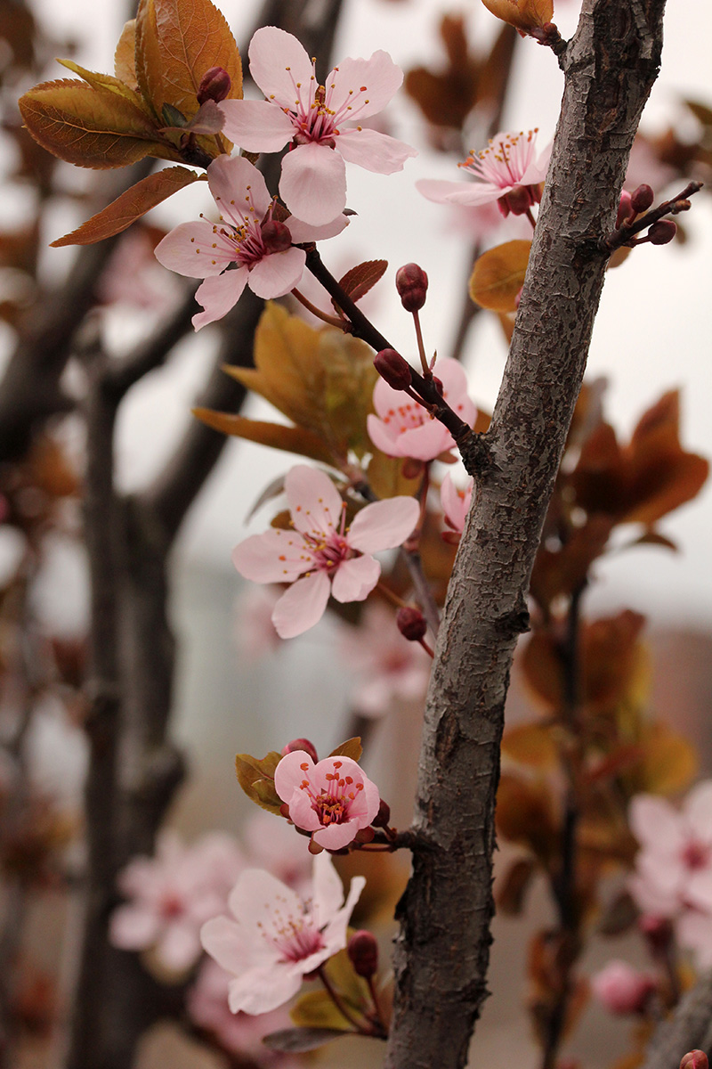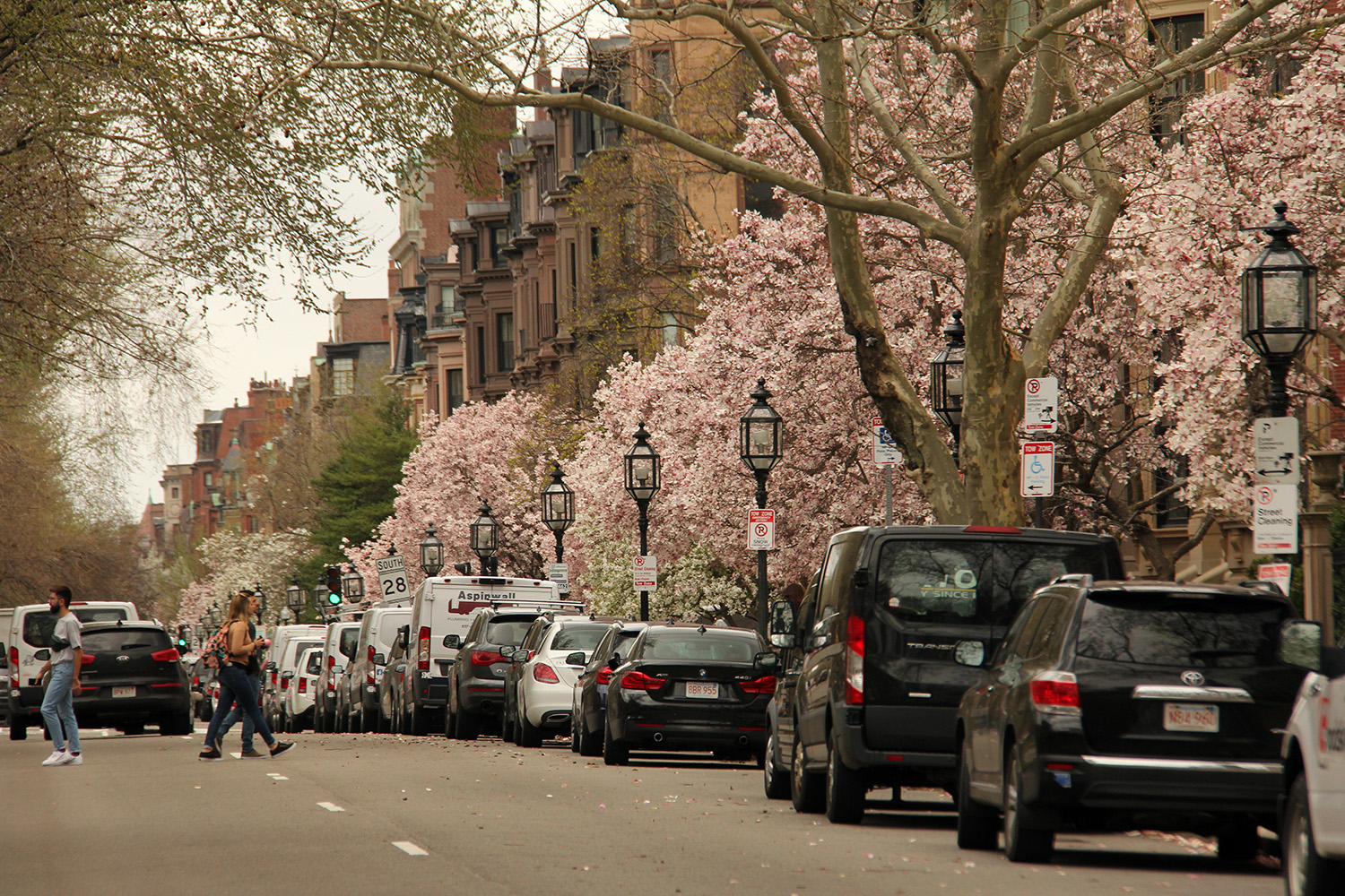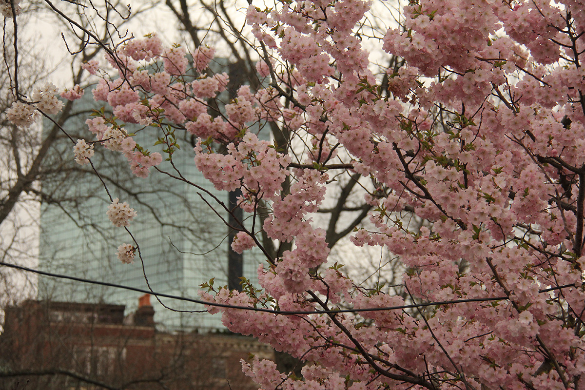 there were also a few flowering trees by the entrance facing commonwealth avenue, they also looked like flowering plums because the flowers seemed kind of purply and the leaves were also purplish red, but they were definitely cherries. and down commonwealth avenue were a boulevard of sidewalk magnolias.