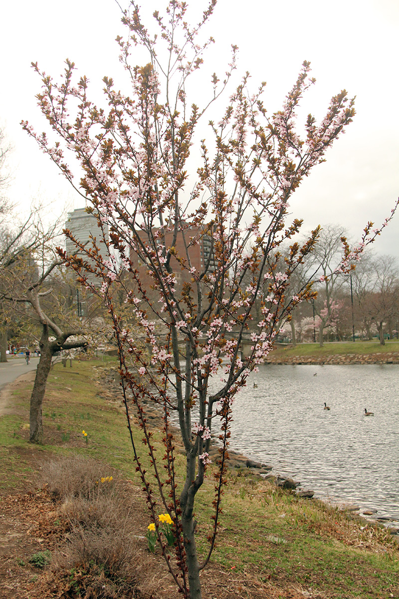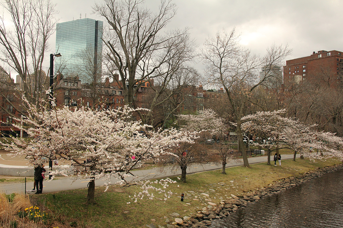 from new chardon i arrived at cambridge street. instead of crossing the longfellow bridge, i made a detour across the new pedestrian overpass onto the esplanade and the charles river bike path. there was plenty of cherries in bloom, though none were kwanzan, which i now realize bloom the latest of the flowering cherries. many of the white blooms along the charles river lagoon i believe are probably yoshino cherries. i saw a few pinks, which i'm guessing could be autumnalis. i even saw a few flowering plums near the hatch shell, though these seems to be recently planted. as i made my way to cambridge along the bike path, i'd stop frequently to take photos of some cherries i didn't recognize. it was windy though and my bike toppled half a dozen times. i gave advice to a latina girl taking selfies, told her to stand in such a way that she could get both cherries and the hancock tower in her photo; i don't think she understood english.