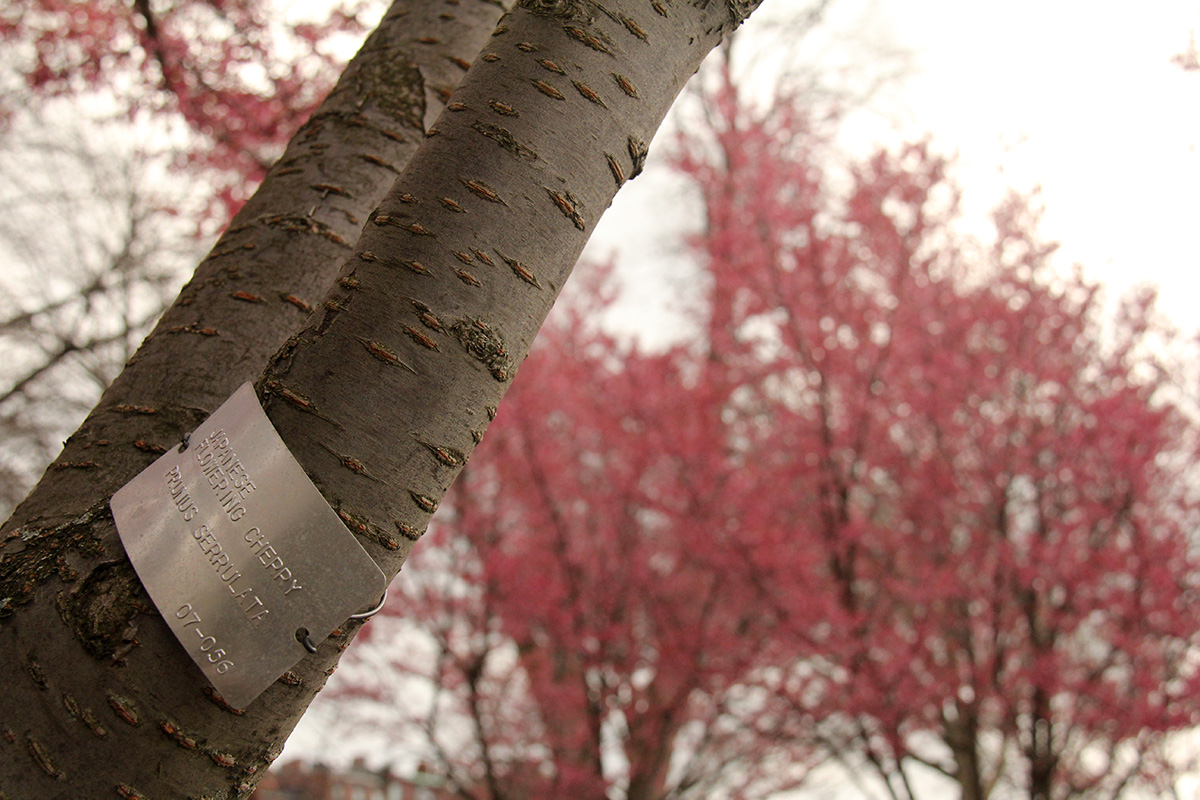 at the tot lot near the mass ave bridge there was a grove of okame cherries. they bloomed early so now they're getting close to post-peak bloom, though their stems are reddish so even after the petals fall they still remain colorful until the leaves come out. though none of the trees i saw had tags, here was the first one that did. unfortunately the label was pretty much useless, "japanese flowering cherry, prunus serrulata" with no variety name. the esplanade association really need to up their tree game and tag their plants with useful labels.