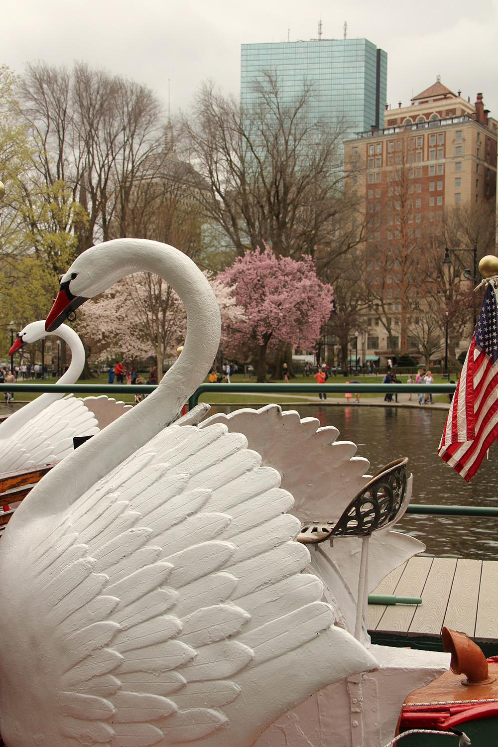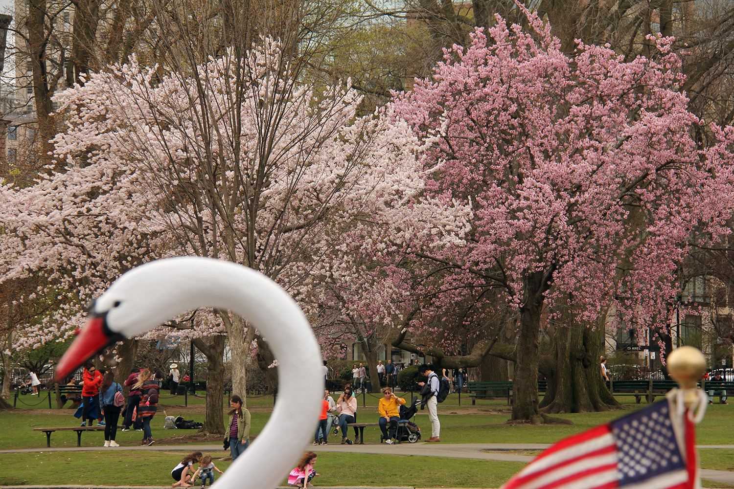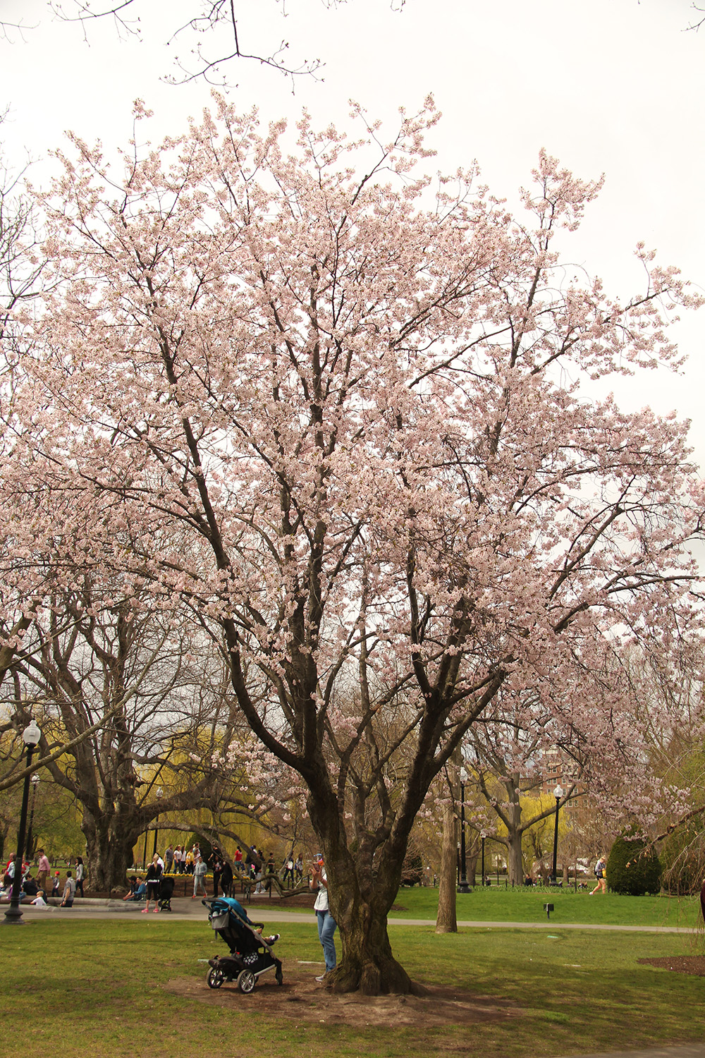 once i arrived in boston, i decided to make a stop at the public garden to check out some of the flowering cherry trees there. there were a lot of people, a combination of school vacation week and marathon tourists still in town. most trees in the public garden aren't tagged so i could only guess what varieties they were. i also accidentally left my fuji 3D camera at home, though i wasn't sure, and was afraid i might've lost it in transit. that meant no 3D photos of the cherry blossoms.