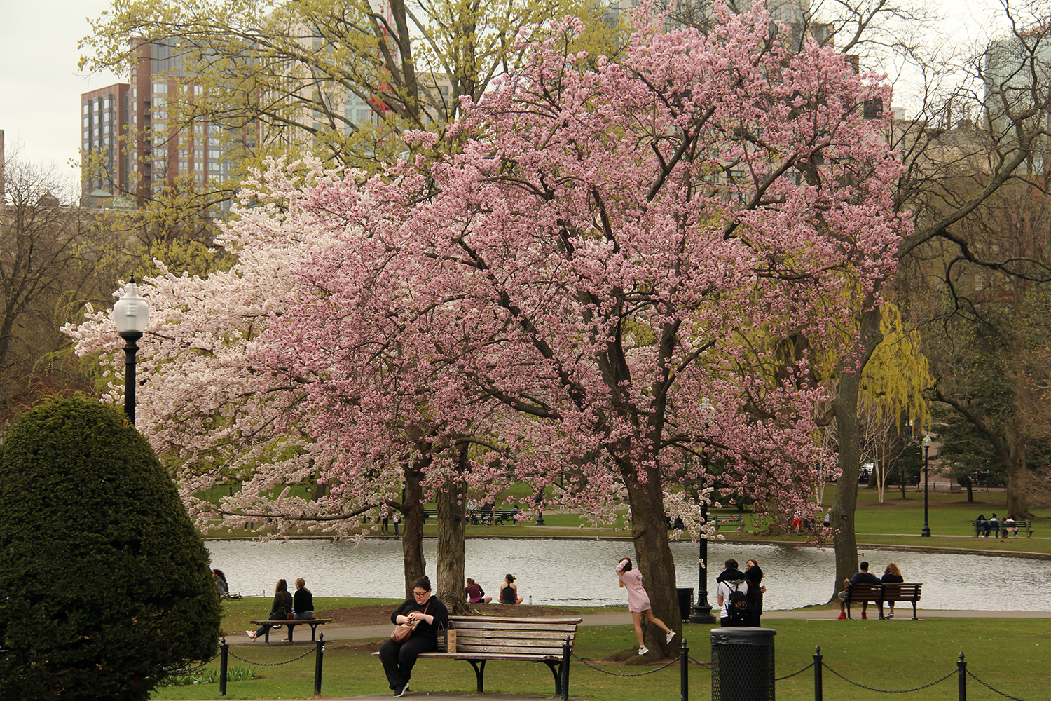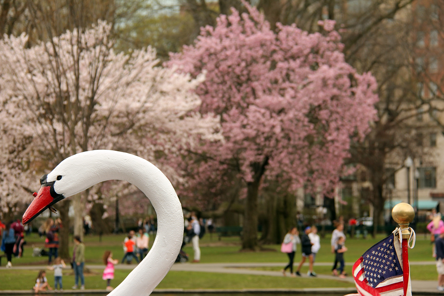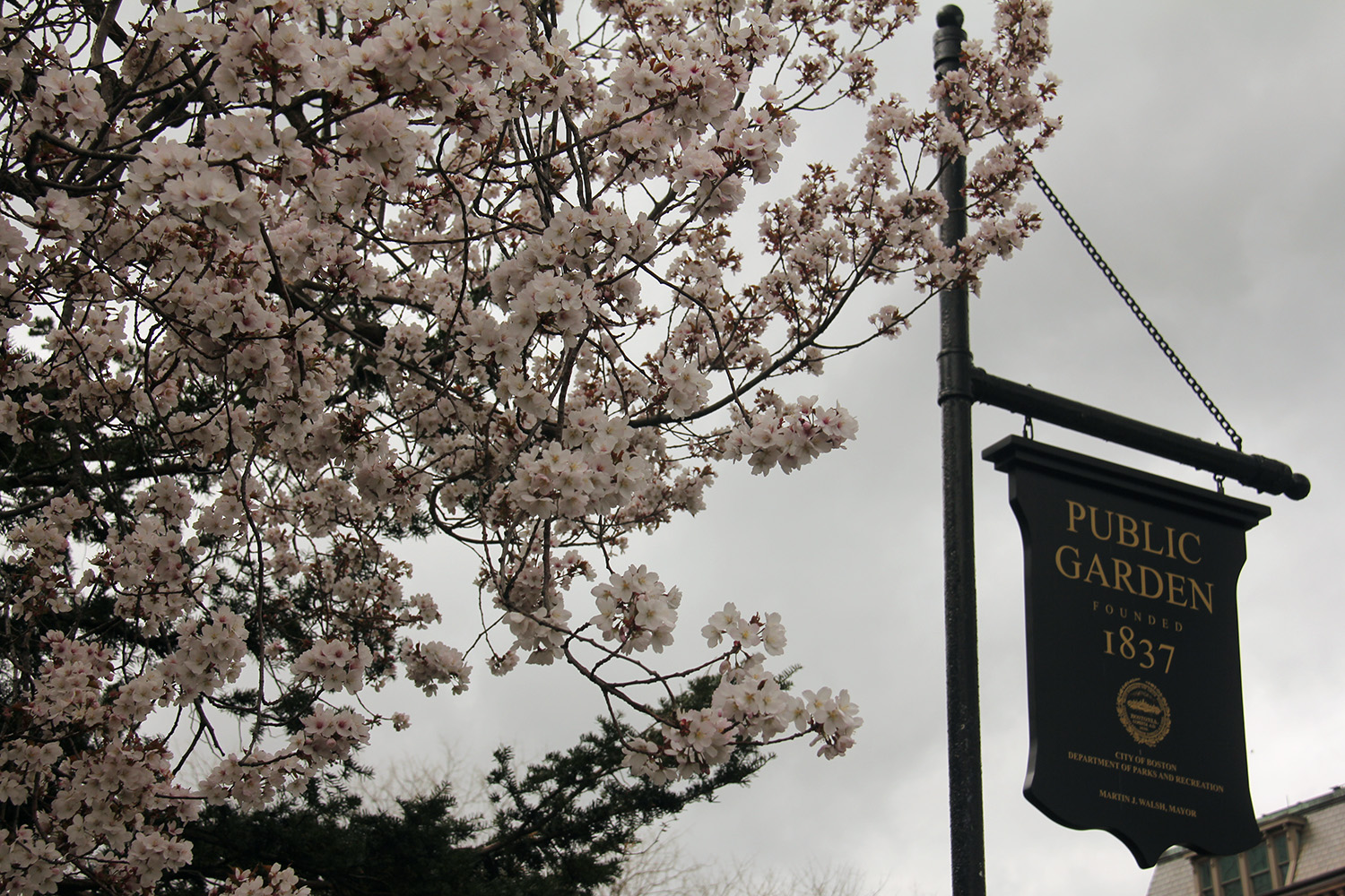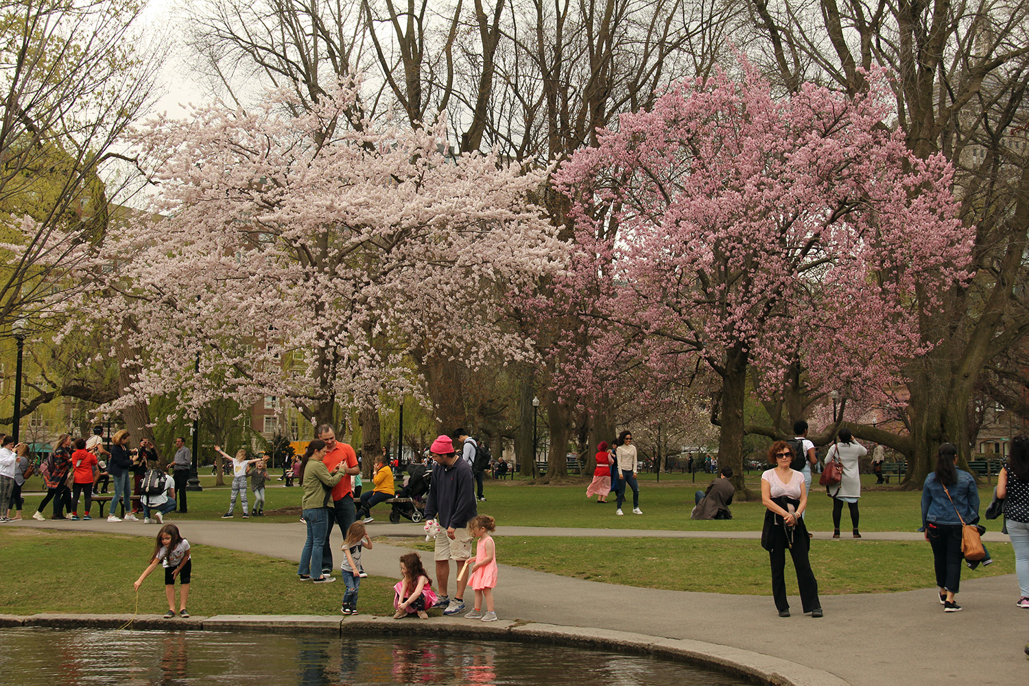 once i arrived in boston, i decided to make a stop at the public garden to check out some of the flowering cherry trees there. there were a lot of people, a combination of school vacation week and marathon tourists still in town. most trees in the public garden aren't tagged so i could only guess what varieties they were. i also accidentally left my fuji 3D camera at home, though i wasn't sure, and was afraid i might've lost it in transit. that meant no 3D photos of the cherry blossoms.