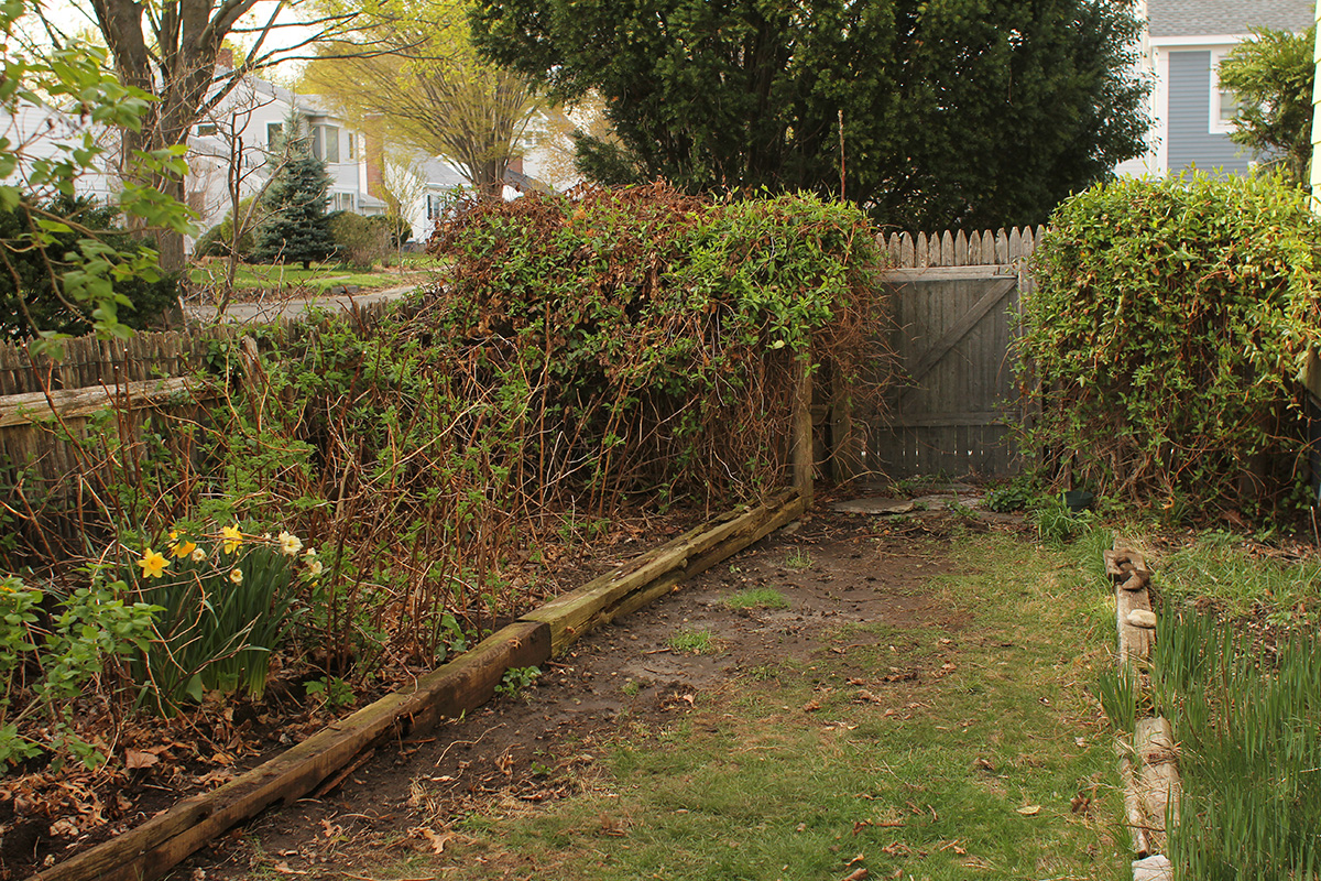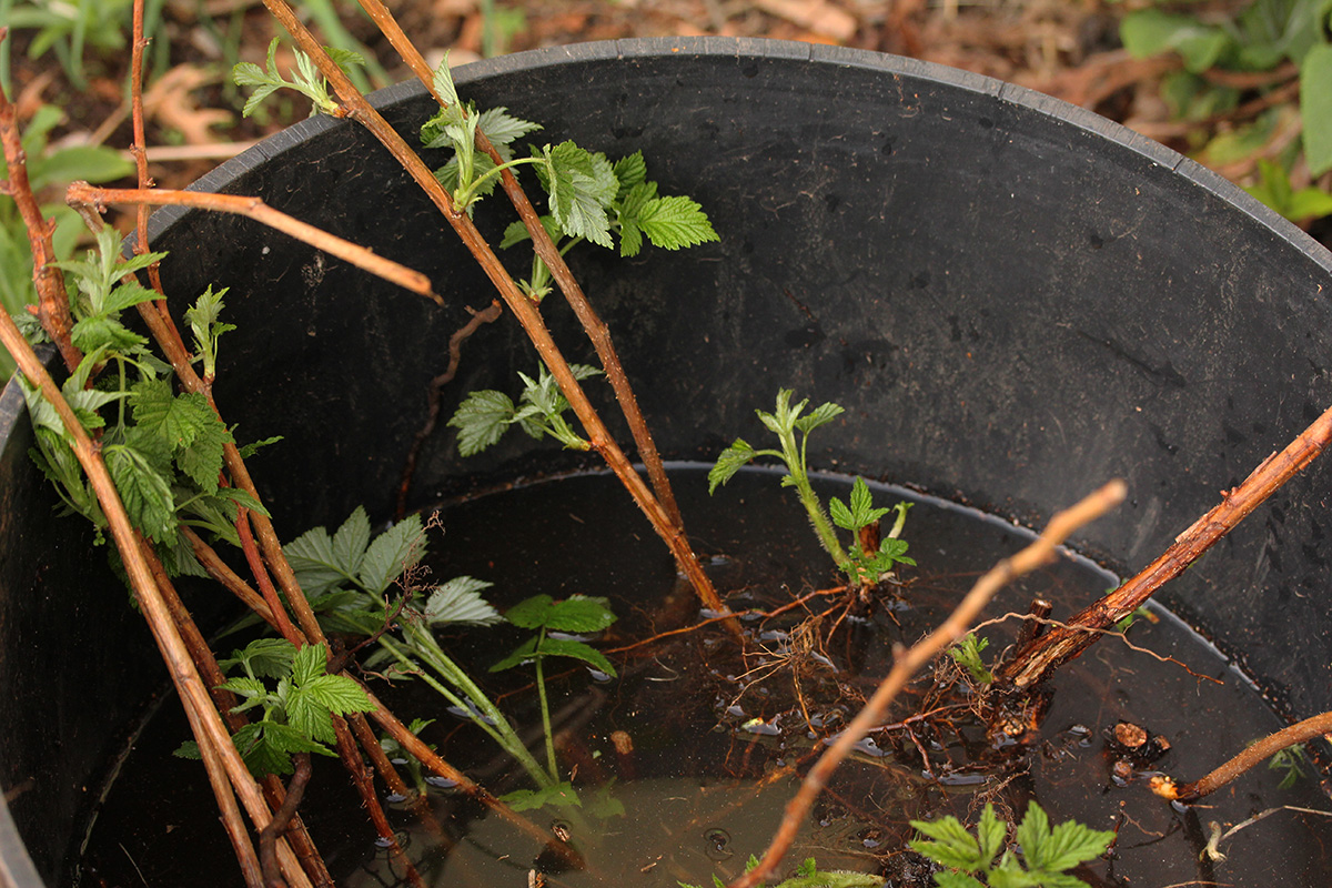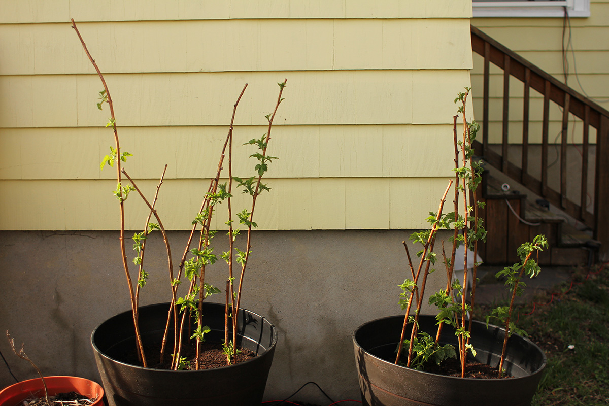 next we dug up the escaping golden raspberry canes growing on the lawn on the western side of the house. it would've been a waste to throw them all away so we decided to replant some in pots. we saved the best canes, throwing out weaker ones. i also relocated some violet clumps. after drilling holes in the bottom of the large plastic pots we got from costco a few weeks ago, we poured a large bag of potting soil into each one, planting the best canes in the process (pour dirt halfway, layer the canes, pour the rest), about half a dozen canes per pot. we still had some leftover canes which we kept alive soaking in a pot. later i replanted half a dozen more canes back to the raspberry patch.