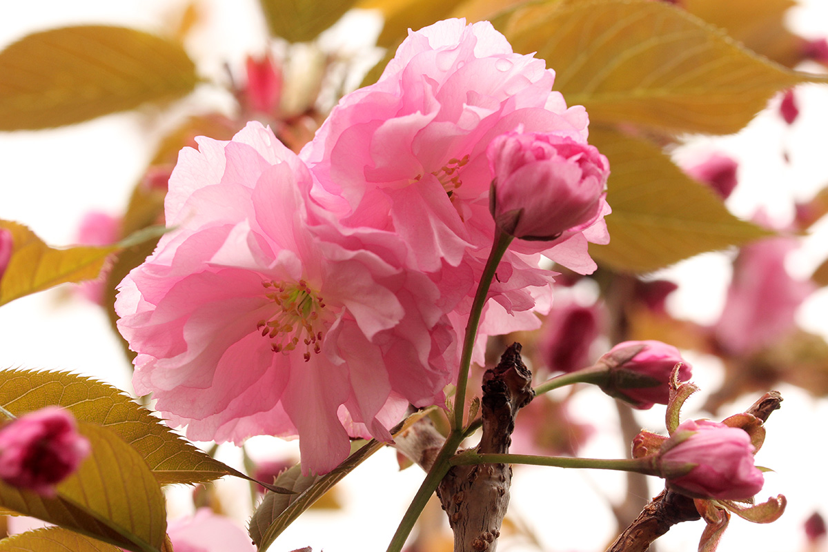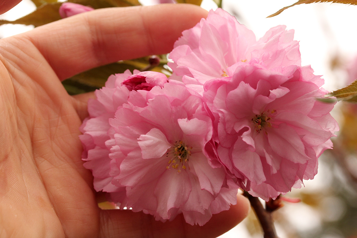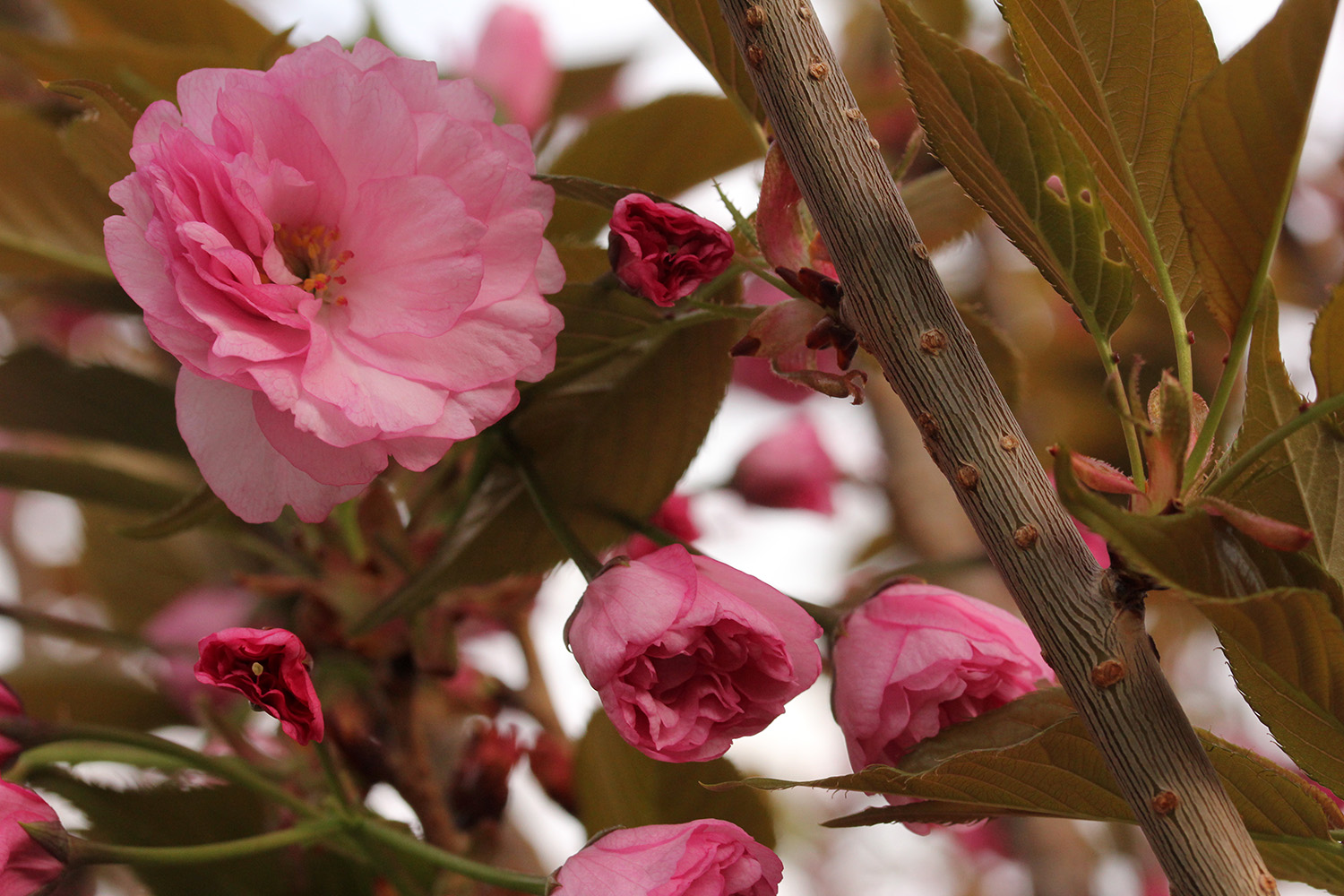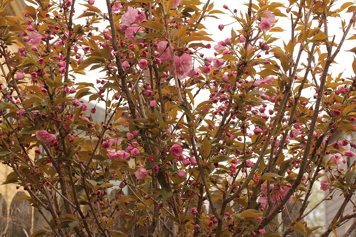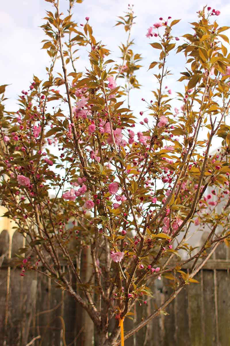 more kwanzan cherry blossoms have emerged. their flowers have been mutated so much for maximum impact that judging by flowers alone i wouldn't necessarily identify them as cherries. a single blossom has so many layers (compared to the traditional 5 cherry petals) that they look more like pink carnations. some sources say that kwanzan are fragrant but i noticed no scent. the leaves are already out, which seems unusual compared to other flowering cherries where they flower first. it may be a side effect of where this tree was originally grown (we think it was south), but maybe the flowers will eventually bloom enough that they hide the leaves. we noticed the same thing with our KV plum, that it already leafed out without many flowers.