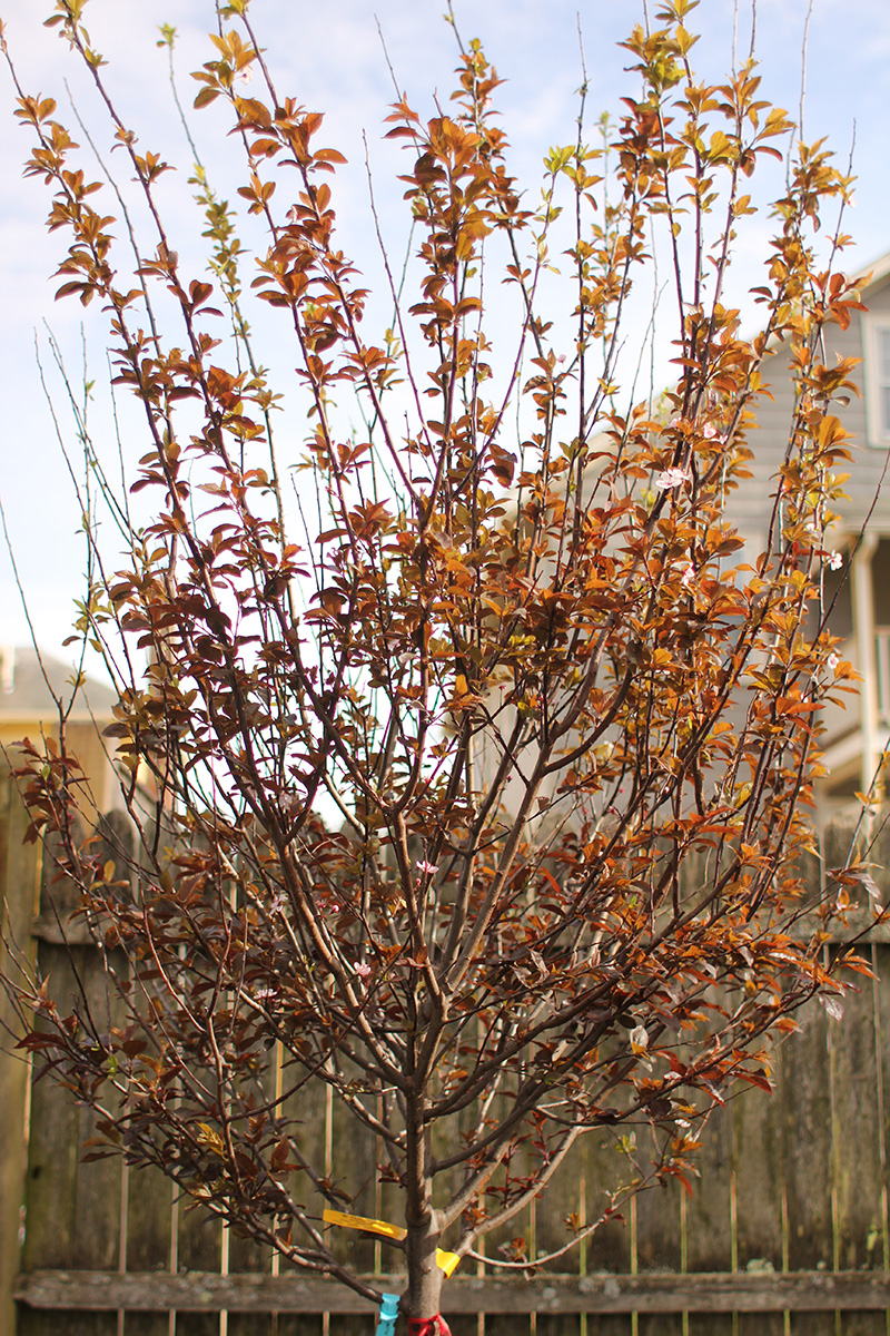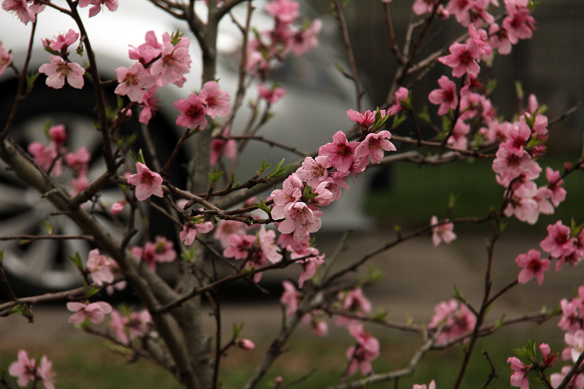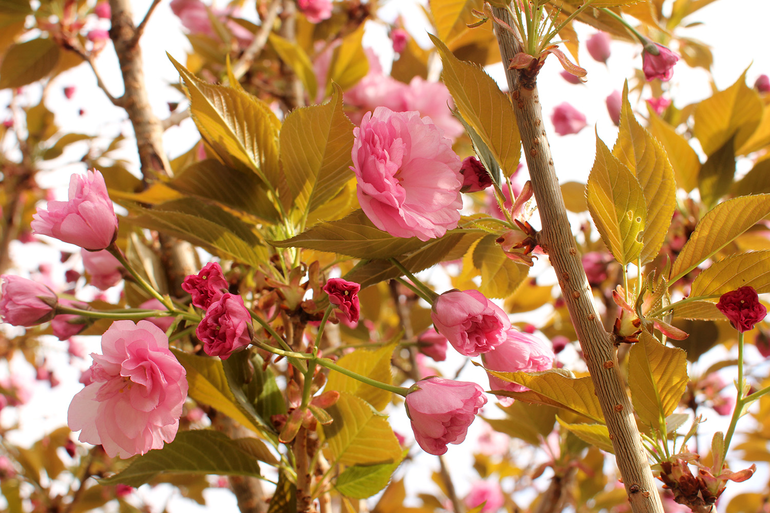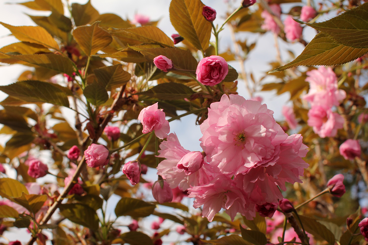 more kwanzan cherry blossoms have emerged. their flowers have been mutated so much for maximum impact that judging by flowers alone i wouldn't necessarily identify them as cherries. a single blossom has so many layers (compared to the traditional 5 cherry petals) that they look more like pink carnations. some sources say that kwanzan are fragrant but i noticed no scent. the leaves are already out, which seems unusual compared to other flowering cherries where they flower first. it may be a side effect of where this tree was originally grown (we think it was south), but maybe the flowers will eventually bloom enough that they hide the leaves. we noticed the same thing with our KV plum, that it already leafed out without many flowers.