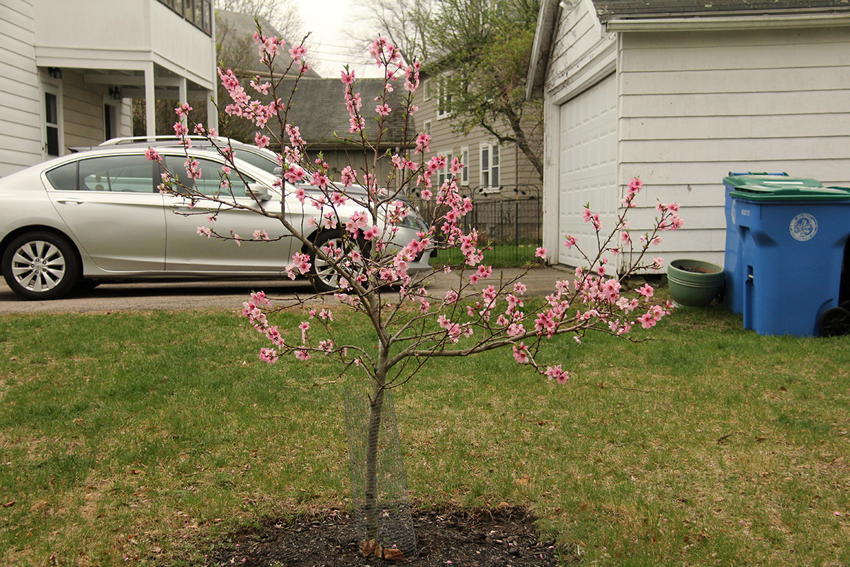 speaking of colors, a nearby neighbor has a dwarf peach growing on their lawn. the tree has been there for many years, protected by a collar of chicken wires to keep rabbits from damaging the bark. but only now did we realize it's a peach tree, and a dwarf one at that since it never seems to grow very big. it was probably purchased as a bareroot and has taken many years to get to this point.