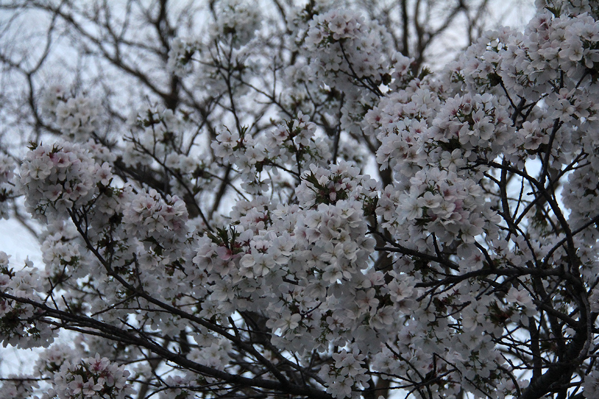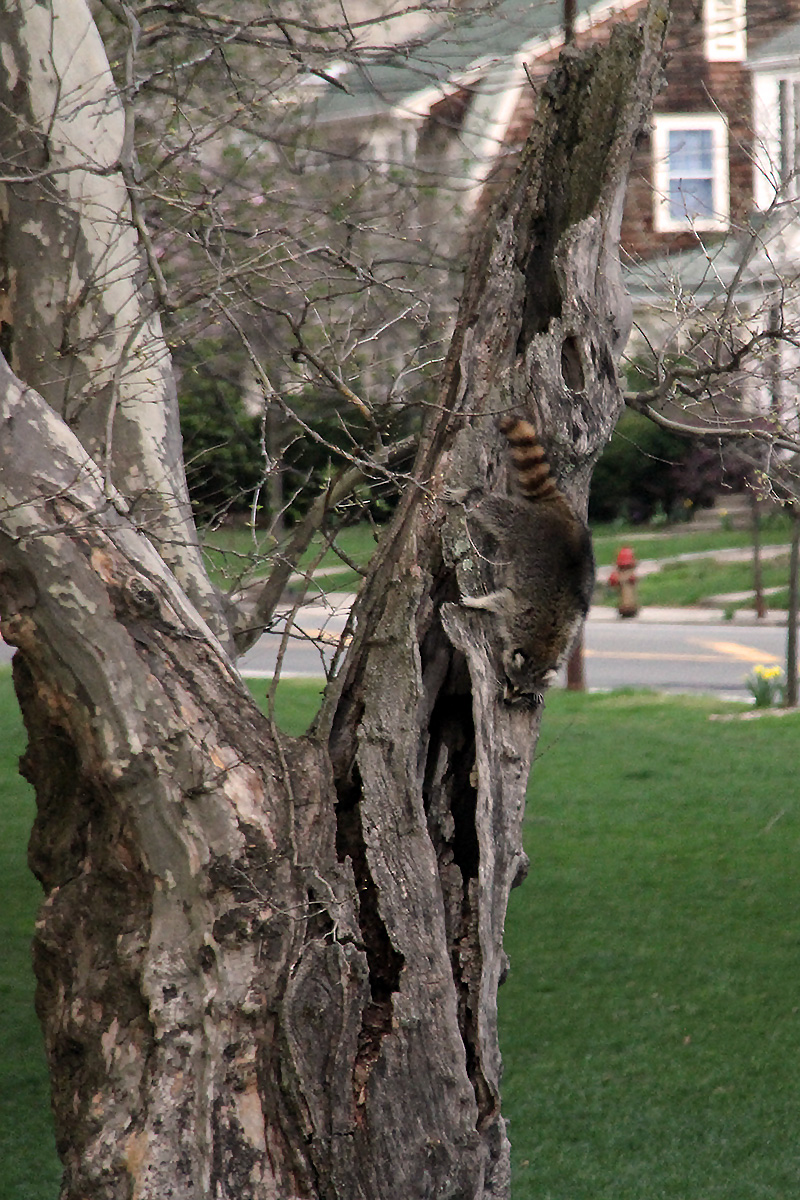 on my way home, i watched an animal climb a tree. at first i thought it was a cat, but it took me a few more seconds to realize it was a raccoon. perhaps it was waking up from its nest inside the tree? it spent a long time climb all over the tree, but enough time for me to get off my bike and grab my camera. it was a fat raccoon too, maybe somebody's been feeding it. after a minutes it finally got off the tree and ran across the street to some neighbor's backyard. i've also noticed a profusion of white flowering trees. initially i thought they were all flowering pears, but i think most of them are white-flowering cherries, if i had to guess yoshinos.
