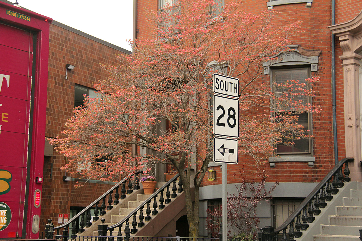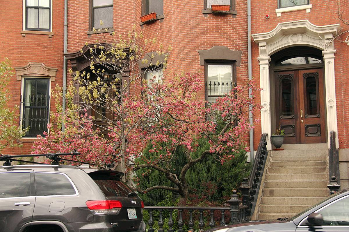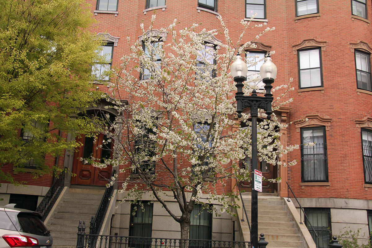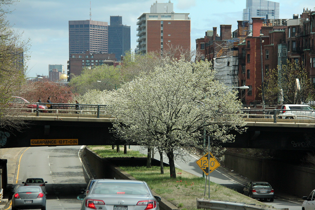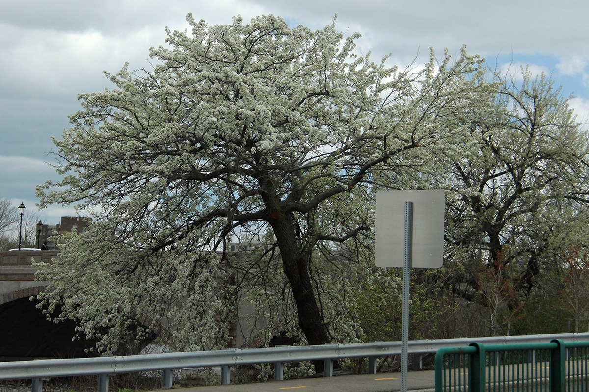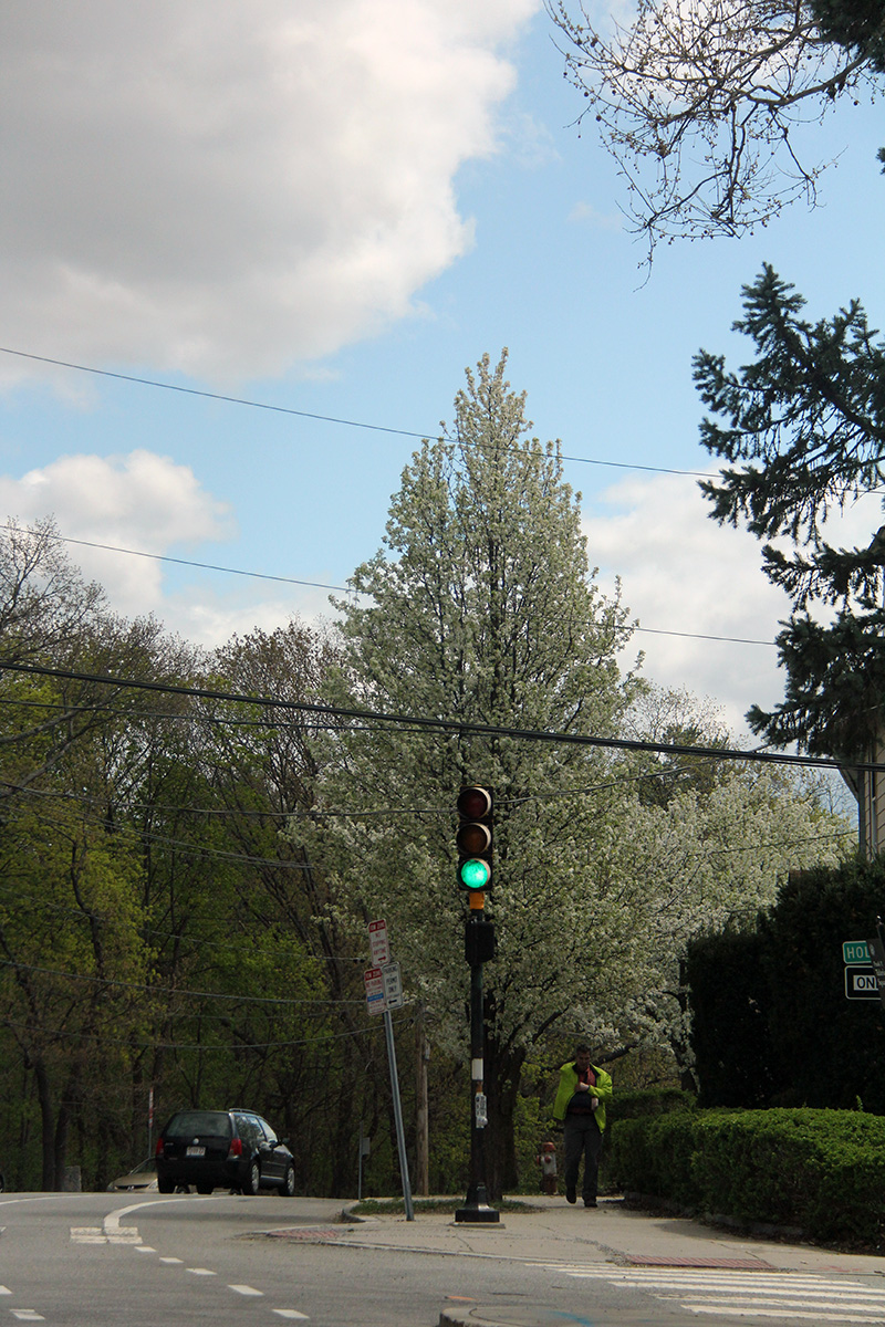 everywhere i looked i saw white flowering pears. younger trees have that upright oval shape while older trees branch out more into an umbrella shape.