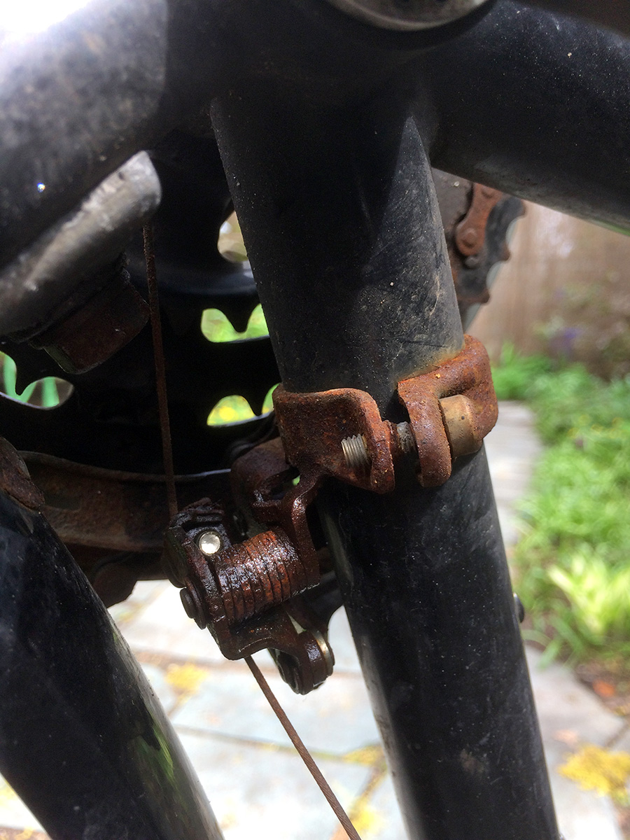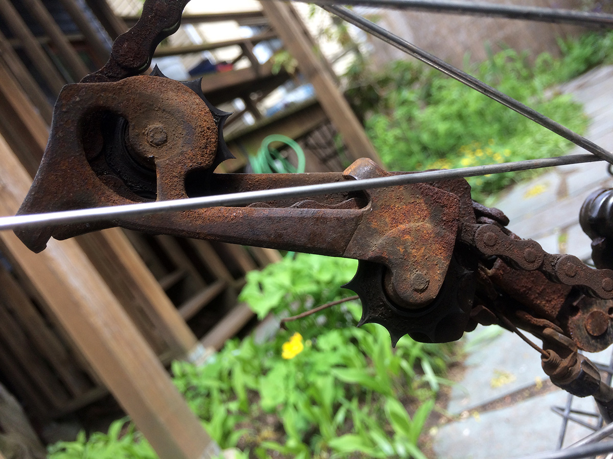i thought i would try jiggling the shifter cable, and that's when i realized the derailleur was stuck. i tried blasting it with tri-flow, but it seems to be stuck pretty well, and there doesn't seem to be any way to open the derailleur to inspect what's wrong. the derailleur needs to be replaced anyway, the sprockets on it barely have anymore teeth left. in the meantime it seems to be stuck in 5th gear, which is what i ride in normally, so i keep riding it in single gear until i get a derailleur replacement. i tried shifting the chainwheel, but couldn't get it to engage any of the 3 gears. that's when i discovered that the front derailleur is also rusted shut, so i'll need to replace that as well.