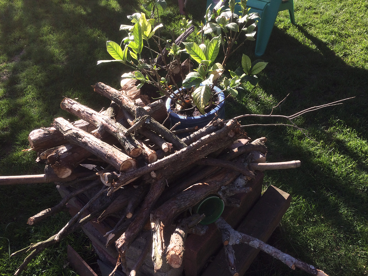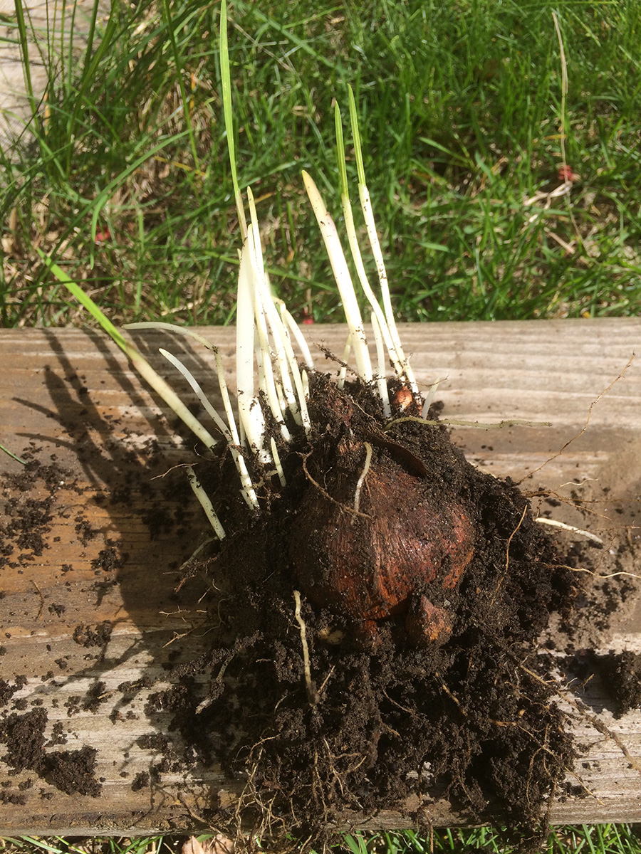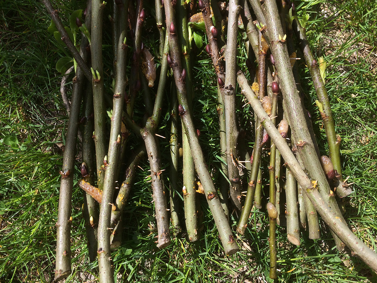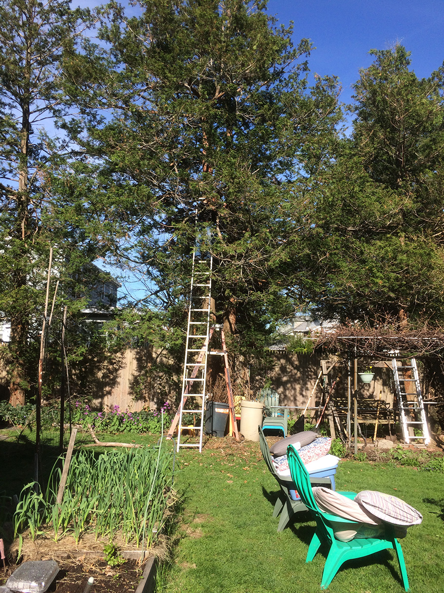 after some oatmeal porridge for lunch as well as a blueberry muffin, my father and i went outside to work. while he mowed the lawn (first time this season), i went around digging up dandelions and other weeds. i finally replaced the water in the bucket of pussy willow branches and sure enough, some of them have already developed roots. i made a gallon solution of copper fungicide (mixed with 1 ounce of liquid copper) and sprayed all the Prunus cherries and plum as well as the Vitis grapes. i planted the monkshood on the western perennial bed, digging up a bunch of crocuses that i redistributed back into the soil. finally, we moved the ladder onto the tall eastern cedar tree to do some handsaw pruning of dead branches. while we were up there we also knocked down an unused squirrel nest.