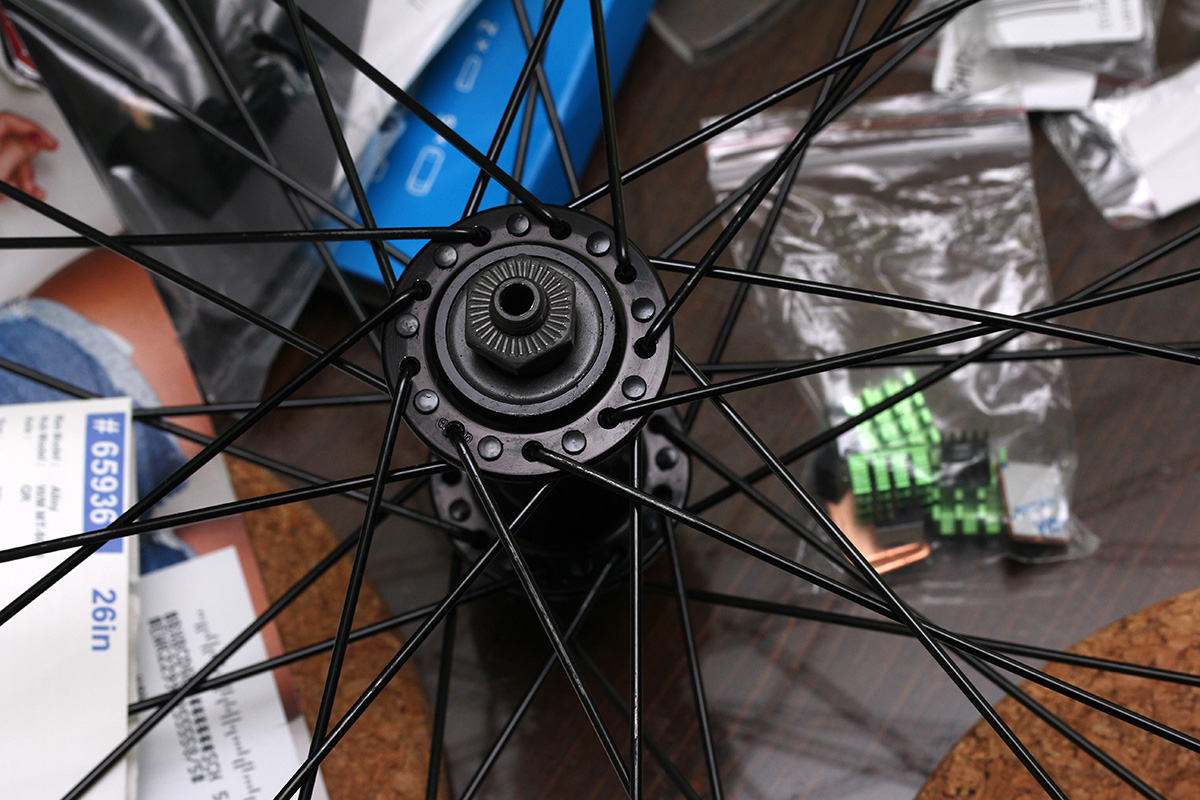the part i was most curious to see was the wheel. i got the wheel master front 26x1.5" 559x19 alloy black machined-sidewall 36 quick-release 14G ($38.40 with 20% discount). i failed to take into consideration the number of spokes when i ordered: this one has 36 while my old wheels both were 32. i was afraid it'd look weird but it's barely noticeable. i was also worried about the axle length, but i compared it to my old wheel and they're exactly the same. one thing that's different is the wheel master doesn't have rubber dust caps on the hub. i thought maybe they were missing but i checked online and apparently it's a shimano deore hub feature, most bike wheels don't have them.