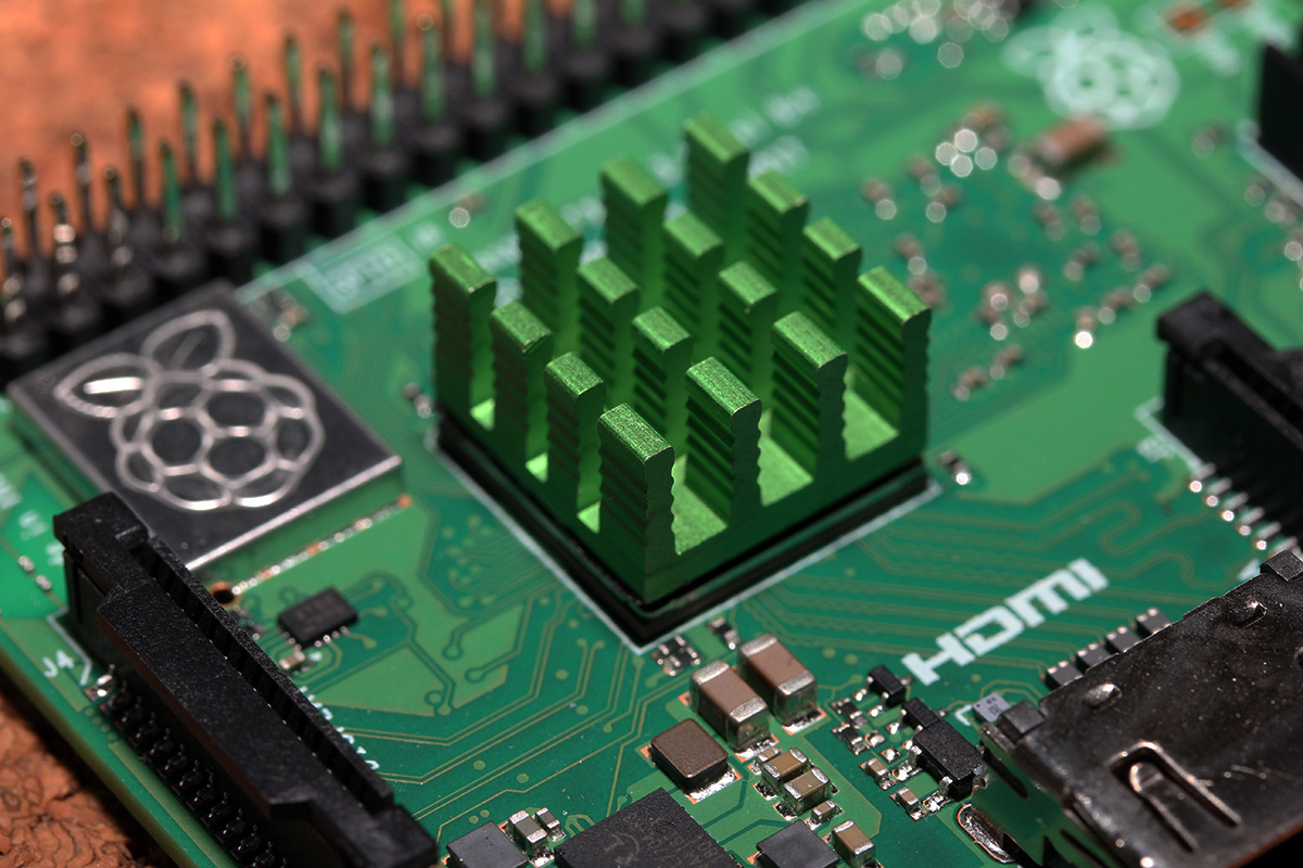 also arriving in the mail were some heat sinks for my raspberry pi's. i installed a set on my raspberry pi 3 model B+. the main heat sink that goes on the CPU is green, which goes well with the green PCB board. there was also a smaller heat sink for the network chip and a copper square wafer heat sink for the memory chip at the bottom of the board.