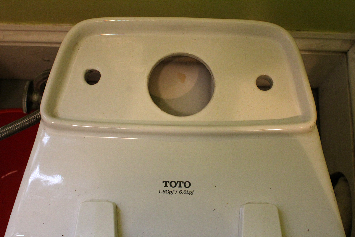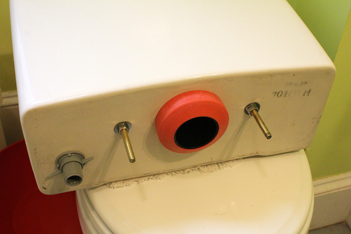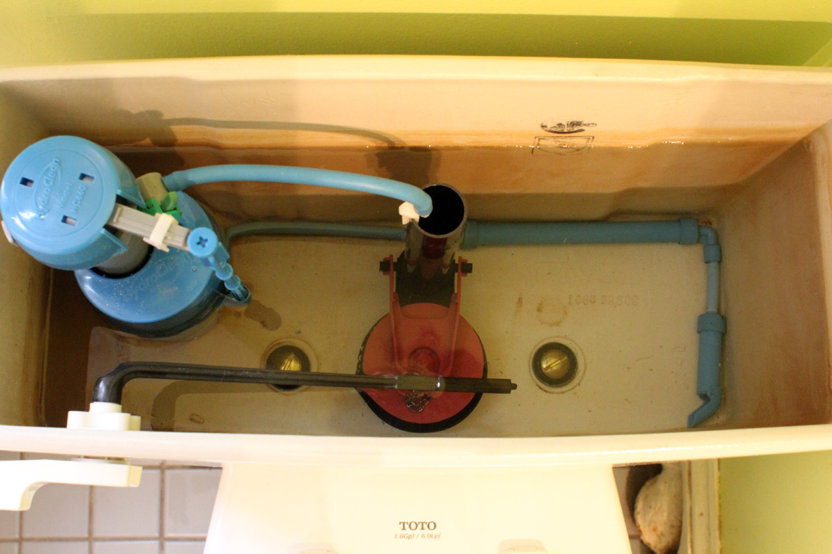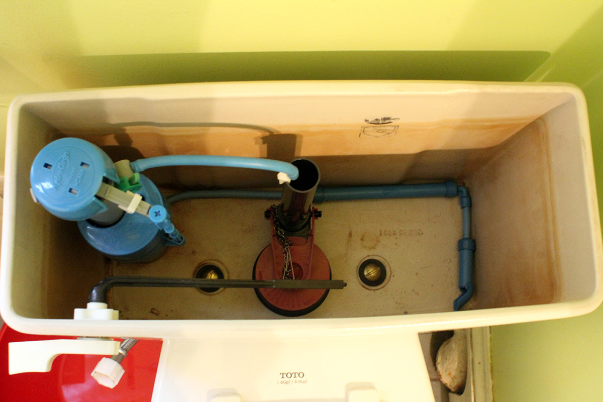 instead of eating lunch, i went ahead and replaced the flush valve on my toilet. what was supposed to take 20-25 minutes ended up taking me more than an hour. it wasn't my first time removing the toilet tank, i did a long time ago when i painted the bathroom. after draining the tank and sponge out as much water as possible, i disconnected the water supply. the two brass bolts securing the tank to the bowl took some finessing to remove, a combination of flat-head screwdriver and a 1/2" socket wrench. once that was done, the tank could be removed, but not before i tipped it over to drain whatever water was still left behind.