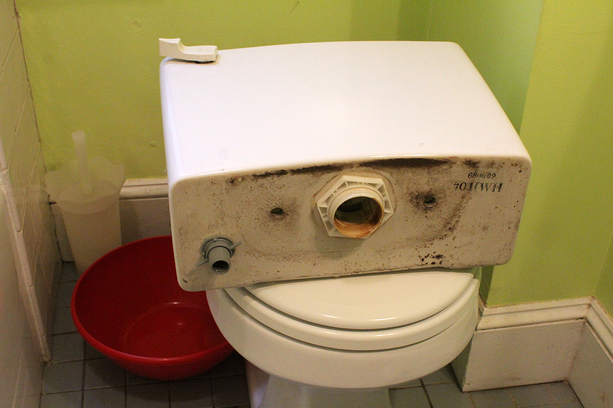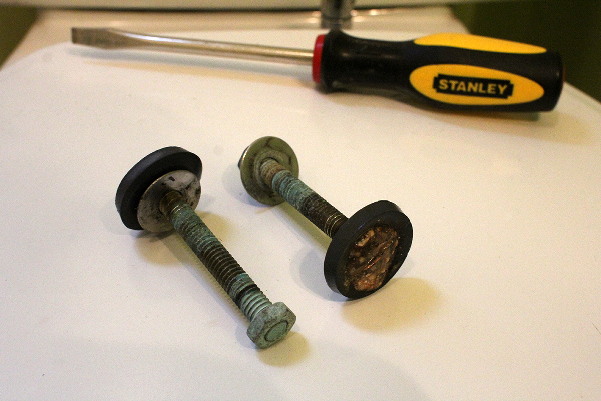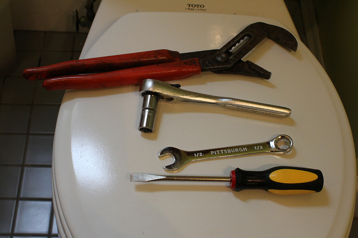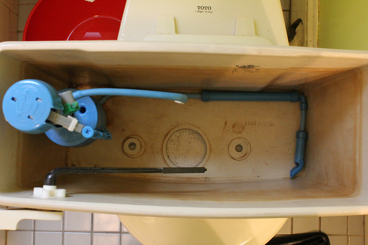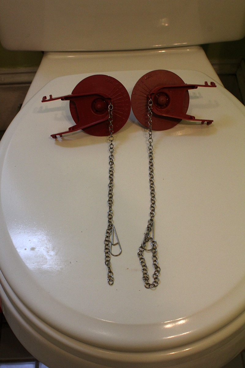instead of eating lunch, i went ahead and replaced the flush valve on my toilet. what was supposed to take 20-25 minutes ended up taking me more than an hour. it wasn't my first time removing the toilet tank, i did a long time ago when i painted the bathroom. after draining the tank and sponge out as much water as possible, i disconnected the water supply. the two brass bolts securing the tank to the bowl took some finessing to remove, a combination of flat-head screwdriver and a 1/2" socket wrench. once that was done, the tank could be removed, but not before i tipped it over to drain whatever water was still left behind.