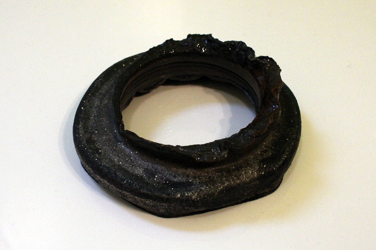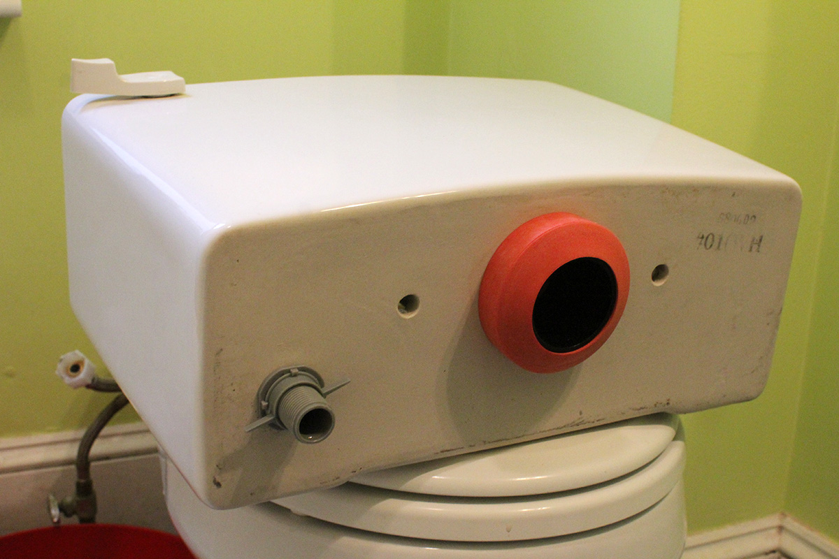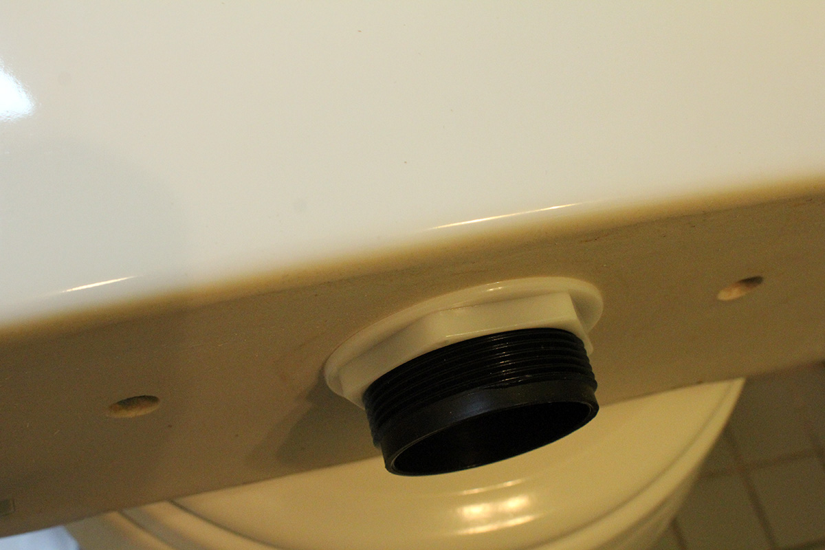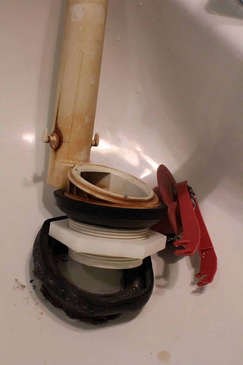 with the old flush valve assembly removed, i put on the new flush valve. the locknut on the new assembly was even thinner, and should i need to remove it in the future i'll probably need a special tool for it. i then slipped on the rubber gasket, red instead of black. i noticed the gasket was large enough that it didn't fit the flush hole on the toilet bowl. maybe i got the wrong size? but i continued with the instructions.