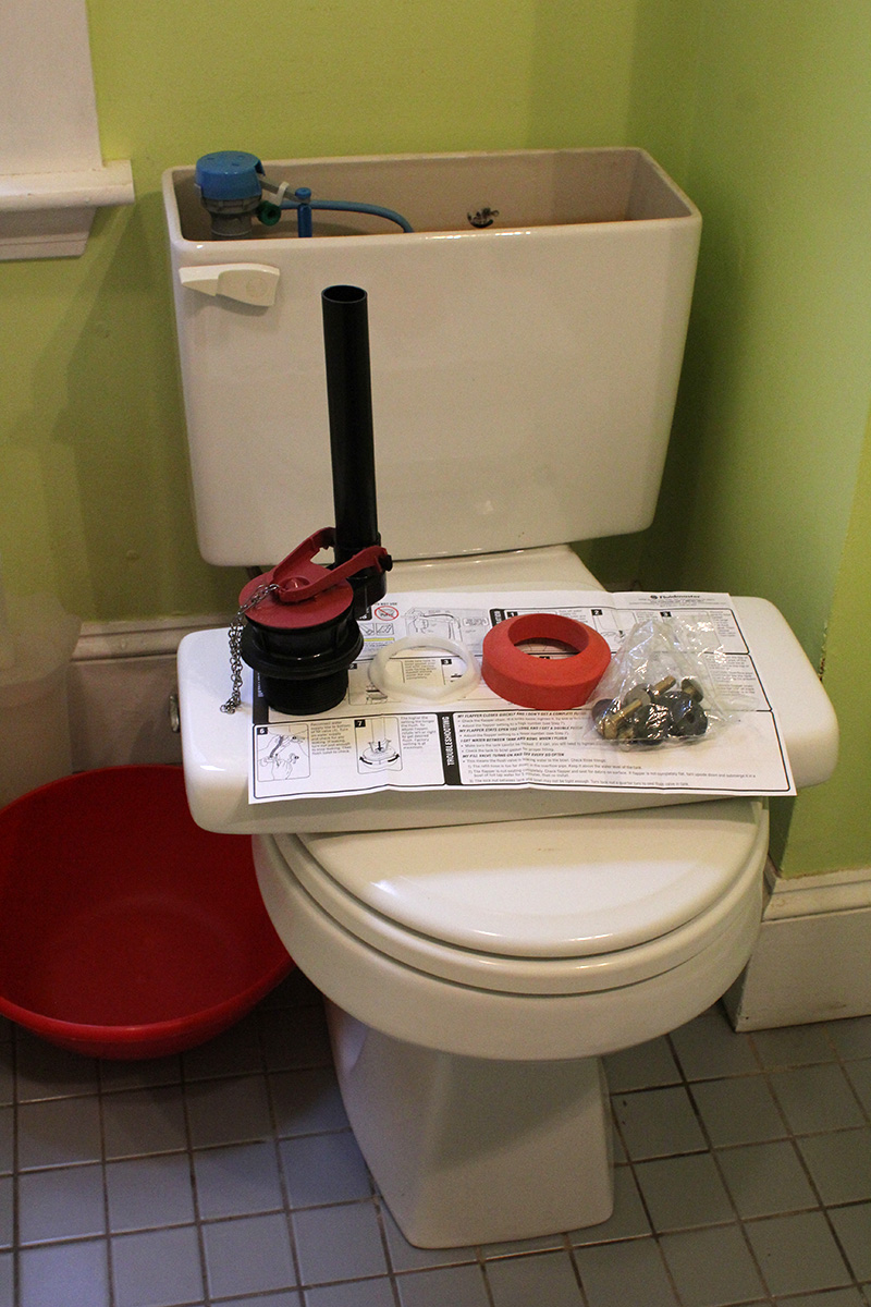 after adjusting the flapper chain to match the old length, i filled the tank up with water, gradually at first to make sure nothing leaked, then finally filling it to capacity. i flushed it, no leaks, everything seems to be working again. it was 2pm by the time i finished.