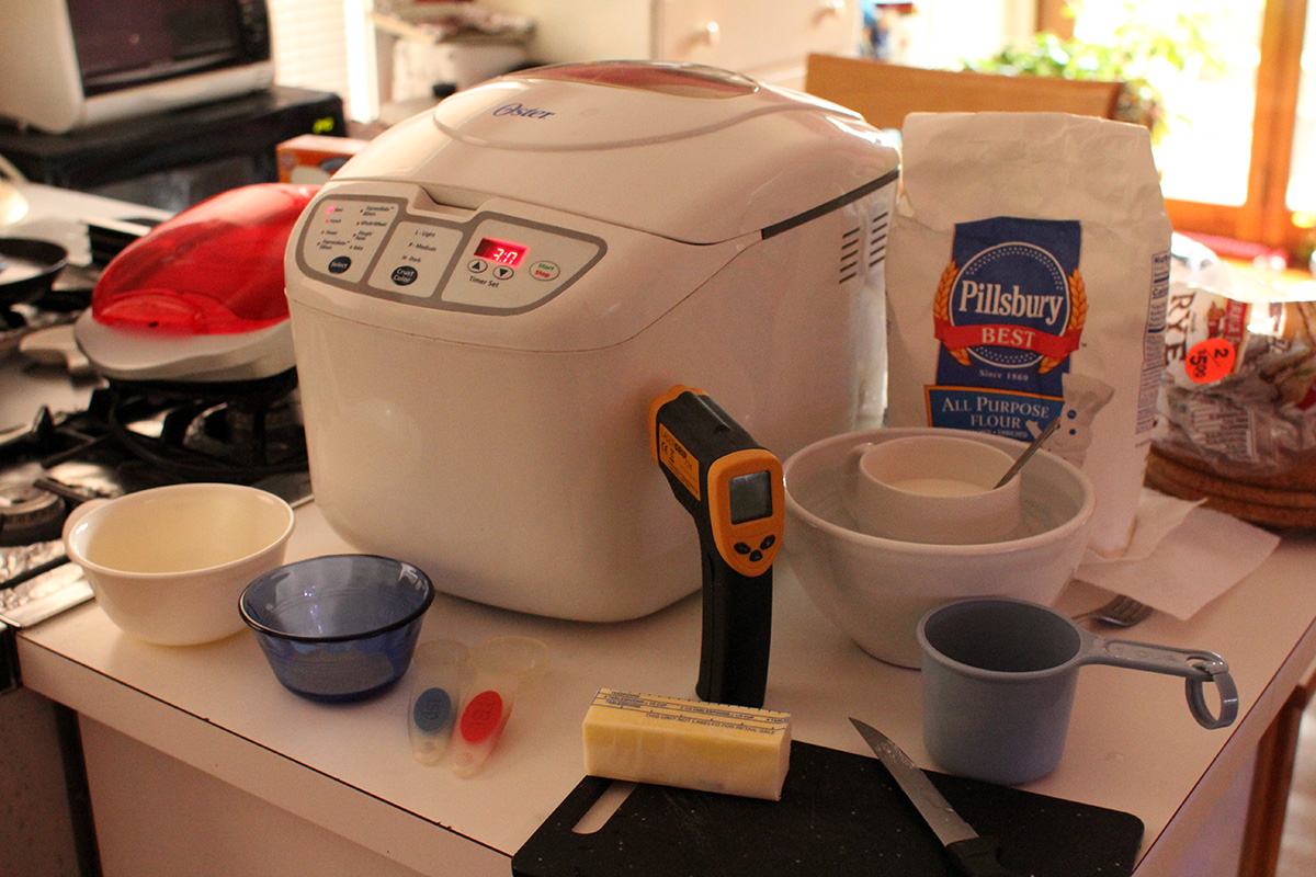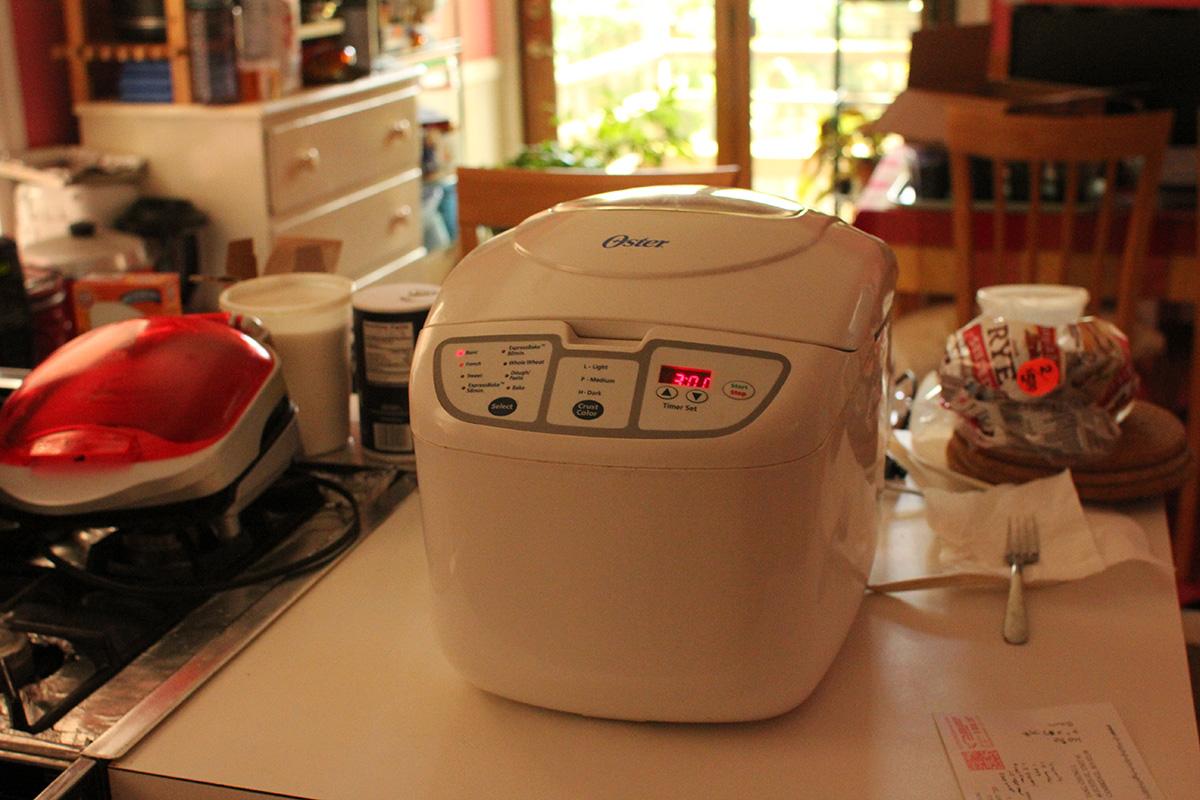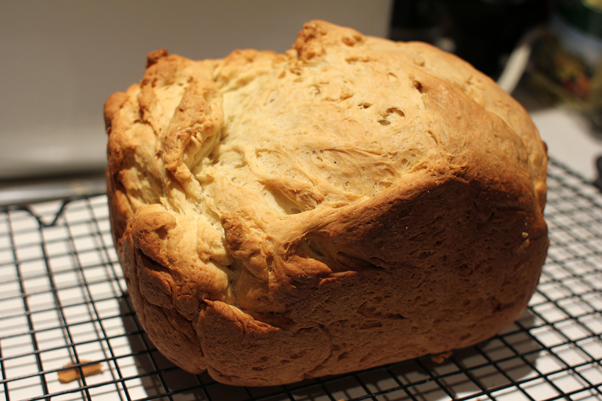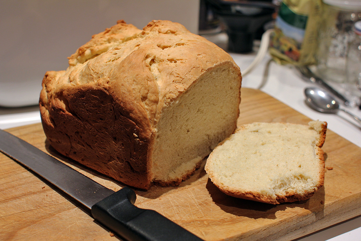 i wasn't feeling particularly hungry today, and didn't have lunch until 2pm, a chicken kielbasa english muffin sandwich with some homemade sauerkraut. in the afternoon i wanted a health snack so i decided to make some machine bread machine - which takes 3 hours to make. i used a recipe that called for: 1 cup of warm half and half, 1 egg, 1-1/2 tbsp of melted butter, 1-1/2 tsp of salt, 1-1/2 tbsp of sugar, 4 cups of flour, and 2 tsp of yeast. it should've given me a delicious bread but it didn't. the bread didn't seem to rise all that much, sitting inside the machine in an unsightly clump, and the end result was like a dense edible rock.