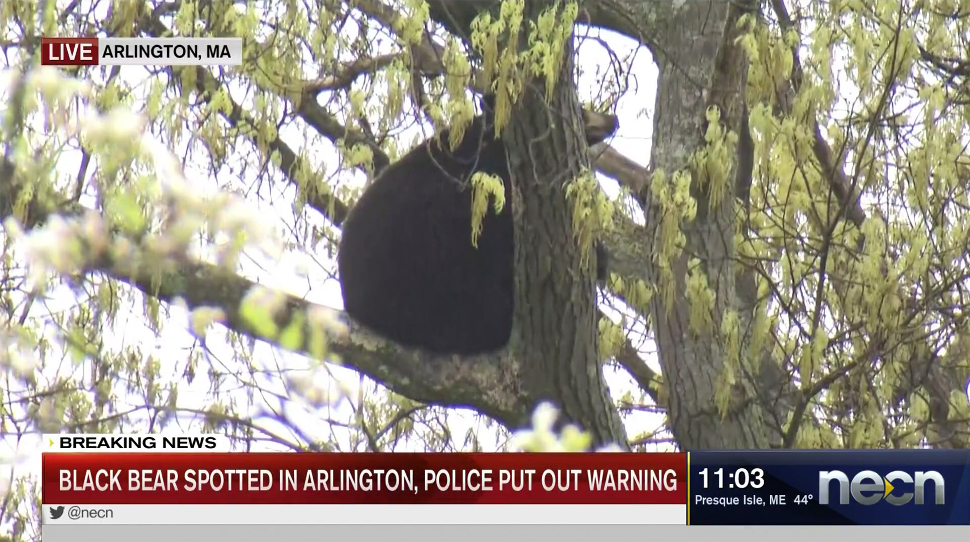 a black bear up a tree in arlington was the news du jour this morning. animal control shot it with a tranquilizer dart and the bear had the foresight to finally climb down the tree (despite the mob of watching residential spectators) before it passed out. supposedly they'll reintroduce the bear (a young 2-3 years old male with study tags) to somewhere further out in western massachusetts.