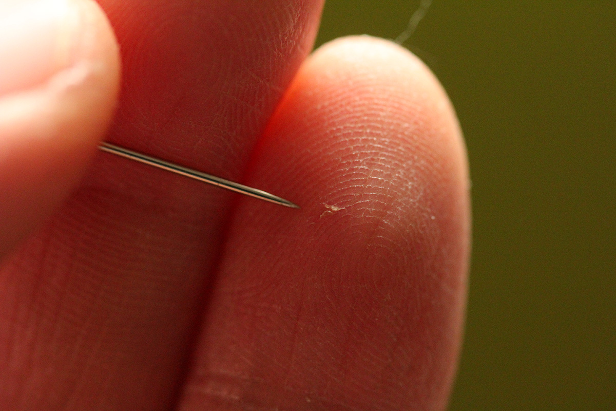 i continued working on that splinter in my fingertip with the sewing needle as it was still hurting. i opened up the wound a little more, to the point where i got the splinter to poke out a bit. then it was just a simple matter of extracting the splinter with the tweezers. the splinter itself seemed like nothing, just a tiny bit of wood, yet it managed to cause all this discomfort.