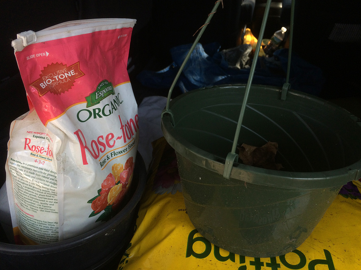 returning home, we stopped in front of a nearby house that was dumping a bunch of flower pots. had we known, we probably didn't need to buy some earlier. they also got rid of a bag of rose-tone organic fertilizer.