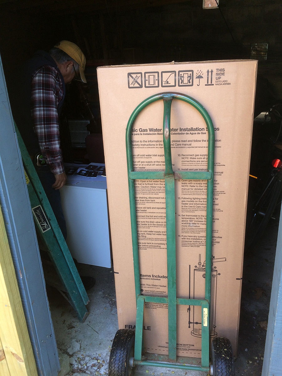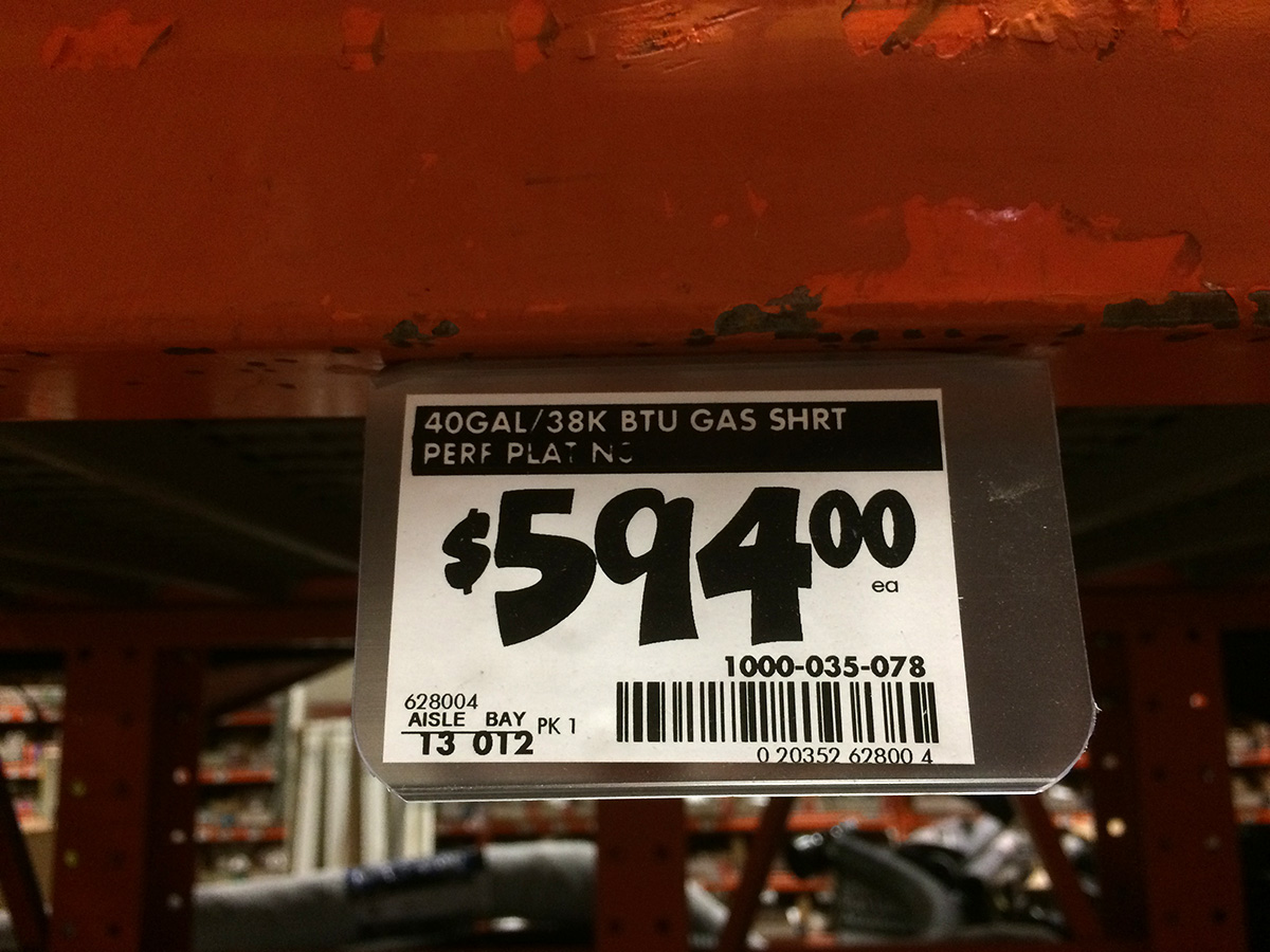 my father and i went to the watertown home depot around 2:45pm to pick up a new water heater to replace the one in my sister's basement which started leaking the past few days. the weather had improved since earlier, and the sun was even out, making it hot. we got a rheem's tank that was 40 gallons (enough for 2-4 people) with a 12 year warranty and more importantly of the right height for the low basement. all the floor units were sold out so we had to ask one of the employees to help us get one from the top shelf. we also left with 4 bags of potting soil.