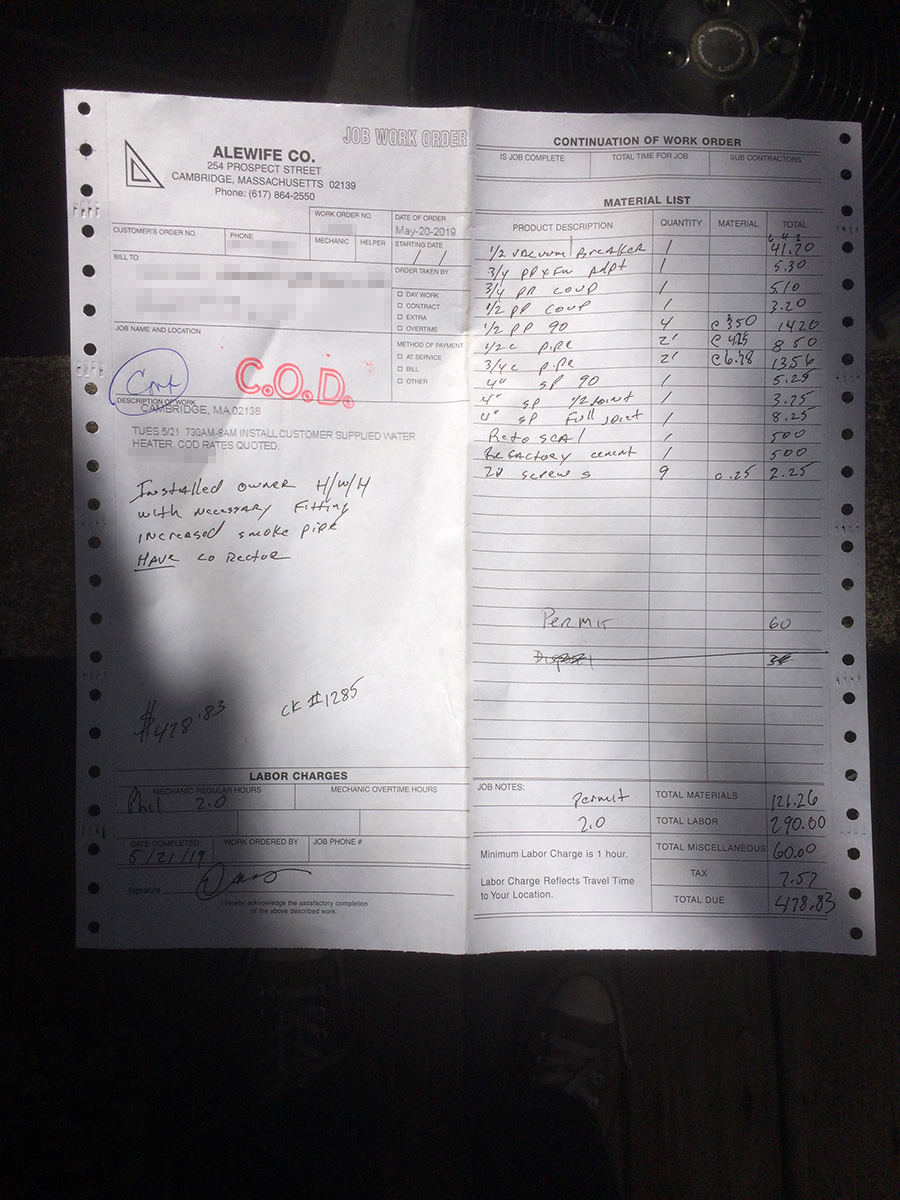 phil spent the final 10 minutes of his time writing out the invoice. he left by 9:20am. the final cost was $478, which i thought was still a little high, but compared to the $1200 home depot wanted to charge, it was still a bargain. but 2 hours of labor? more like 1-1/2 hours if you're being generous, unless he started counting from when he was supposed to get here which was 7:30am (he arrived around 8am). there was also $120 for additional materials which i can understand, but i was surprised about the $60 permit fee. still, the work was good, and everything seemed to be done according to code.