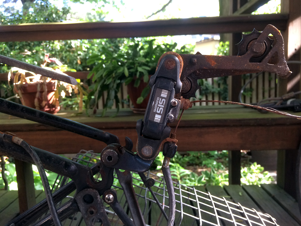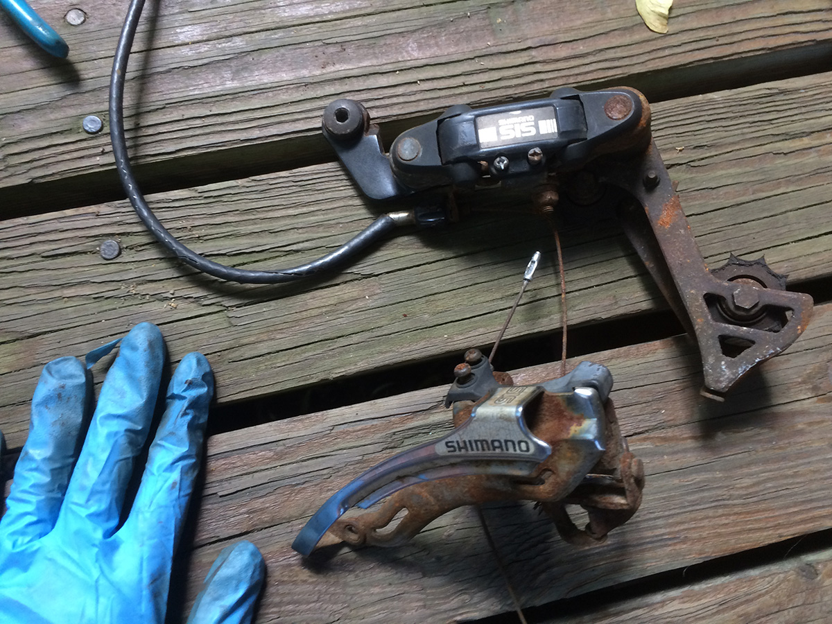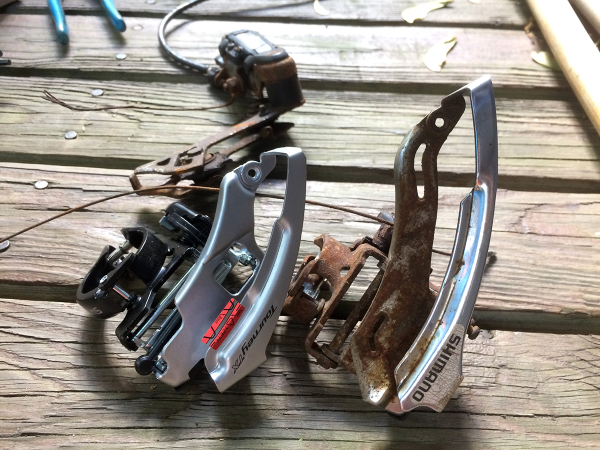 in the late afternoon i finally had some time to work on my utility bike. i moved it to my backyard deck and flipped the bike upside down. after removing the rusty chain, i removed the old derailleurs. besides the derailleurs, the shift cables were so rusty i couldn't remove them so i ended up clipping them instead. installing the rear derailleur was easy. the front derailleur was more challenging because i needed to use the provided insert shim to fit my bike frame. another problem is the derailleur might activity conflict with my rear fender. i ended up not installing the front derailleur until i took a closer look at the instructions.