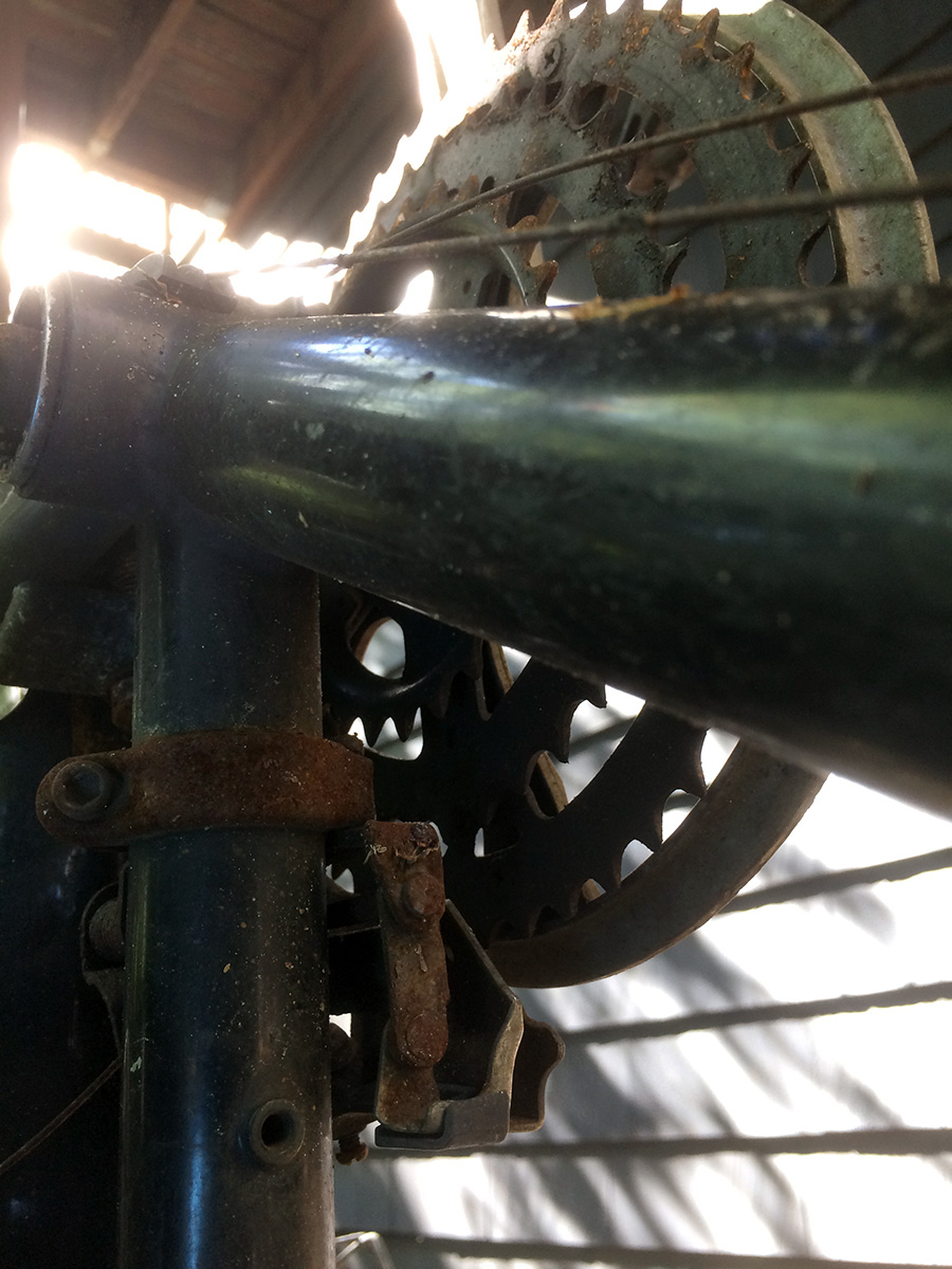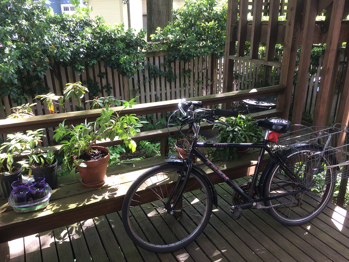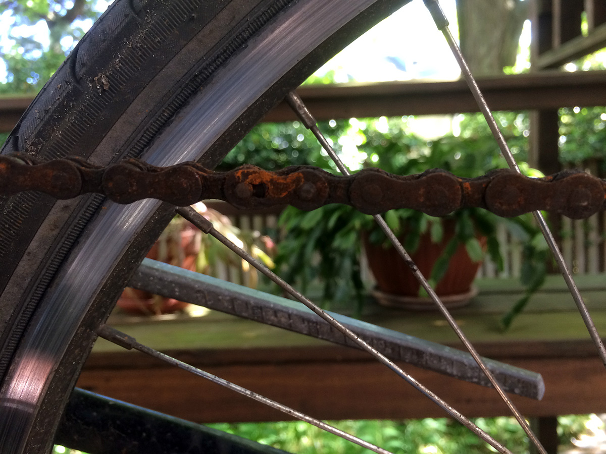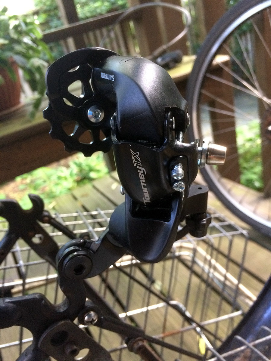 in the late afternoon i finally had some time to work on my utility bike. i moved it to my backyard deck and flipped the bike upside down. after removing the rusty chain, i removed the old derailleurs. besides the derailleurs, the shift cables were so rusty i couldn't remove them so i ended up clipping them instead. installing the rear derailleur was easy. the front derailleur was more challenging because i needed to use the provided insert shim to fit my bike frame. another problem is the derailleur might activity conflict with my rear fender. i ended up not installing the front derailleur until i took a closer look at the instructions.