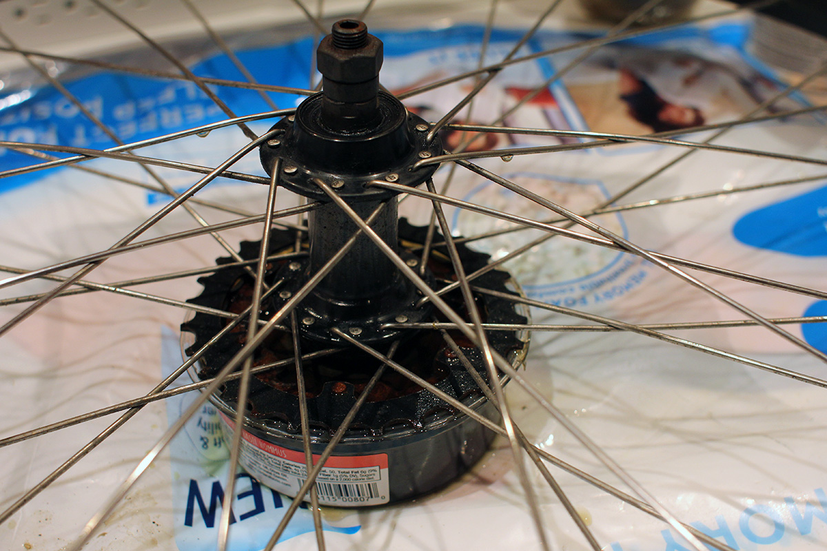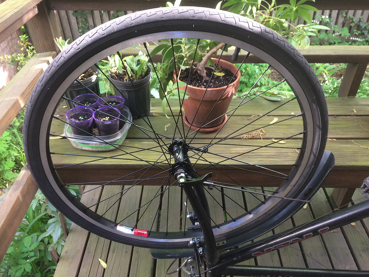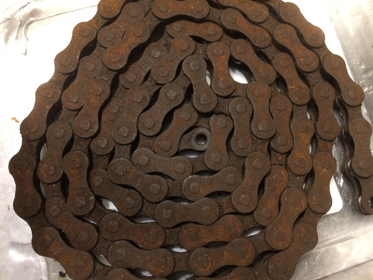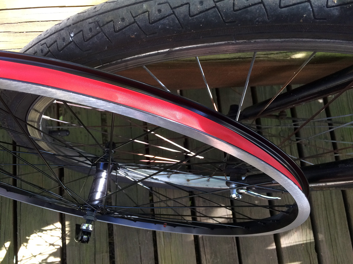 i replaced the front wheel. after putting on a new rim tape (red), i removed the tube and tire from the old wheel and transferred it onto the new one. i used my plastic tire levers because i didn't want to scratch the new rim. i thought about testing the tube first for leaks, but decided i wouldn't waste time and install the tube/tire right away. if the tube continues to leak, i'll just put in a new one. after that i installed it on the front forks easily, perfect fit. i soaked the rusty chain in some old rust remover solution. like the tube, i also thought about replacing the chain, but i'll see how clean they are after the rust treatment. after the chains had been soaking for a few hours, i dunked the cassette on the rear wheel in the rust remover.