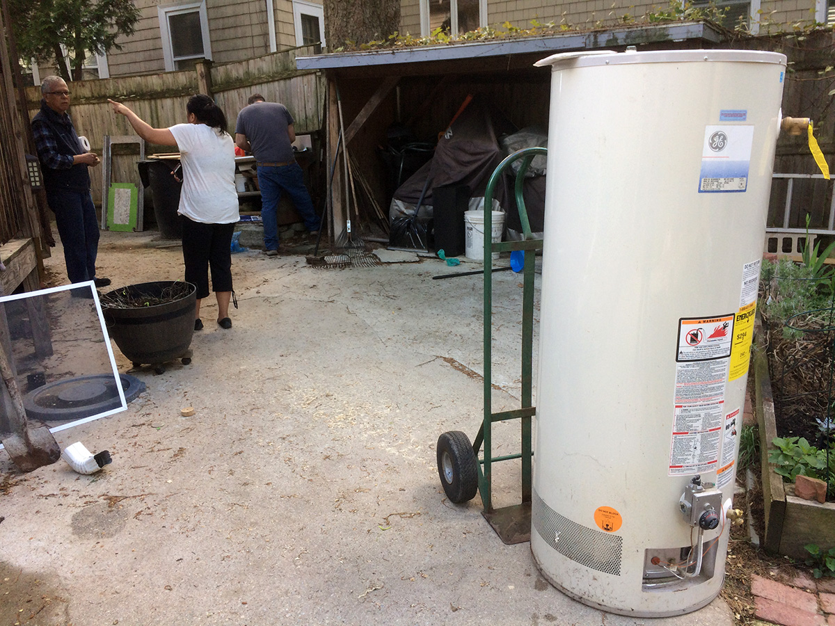 while waiting for the old water tank to completely drain, i helped my father put up some closet shelving, install an air conditioner in the larger bedroom, and bring the older moldy air conditioner outside so we could try cleaning it with a pressure washer. when the tank finally drained completely, we moved it onto the car and left for home depot a bit before 11am.