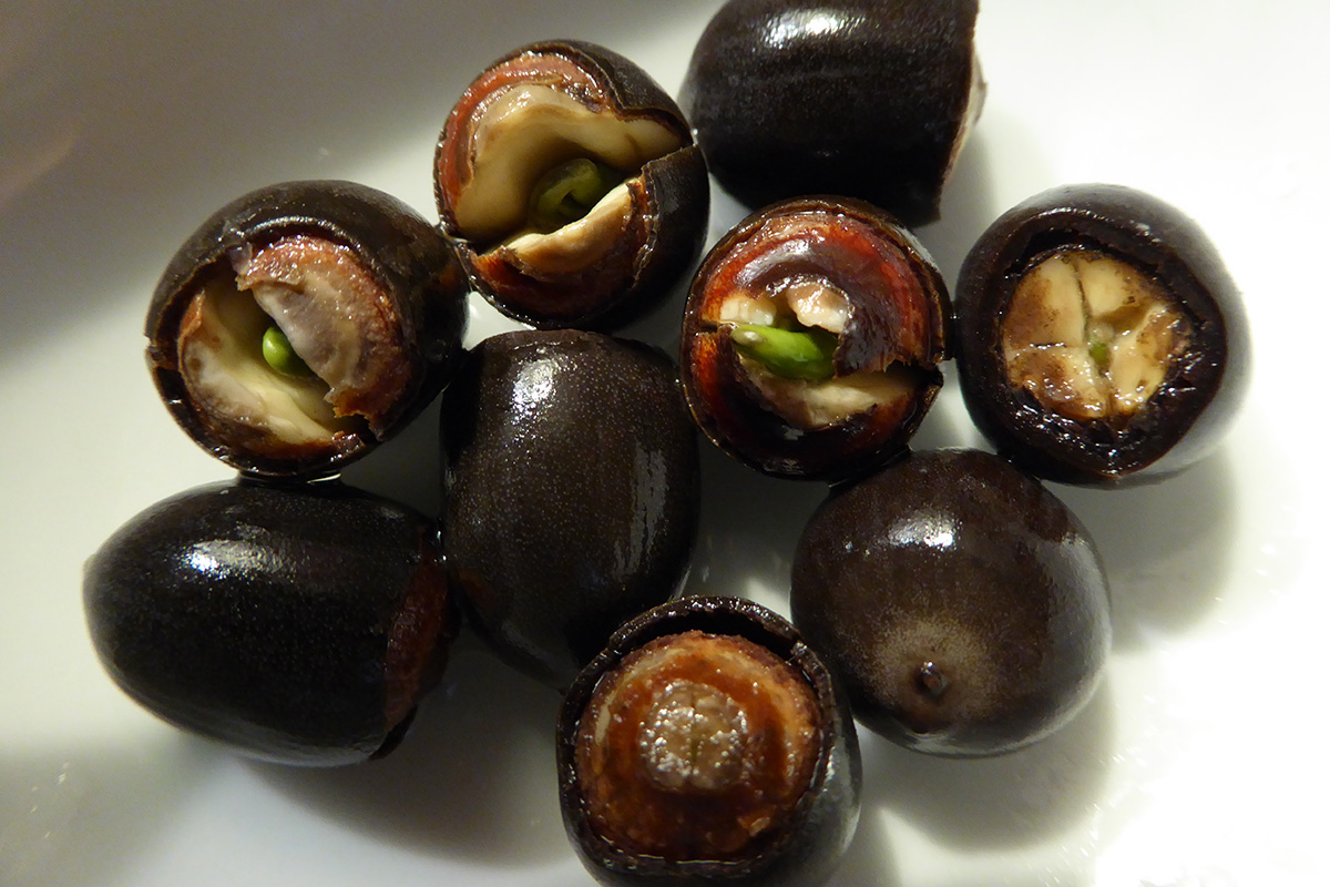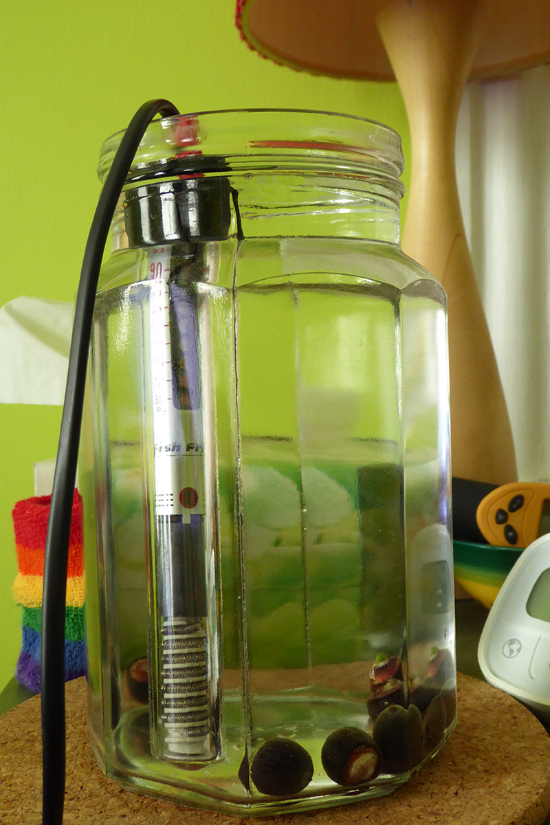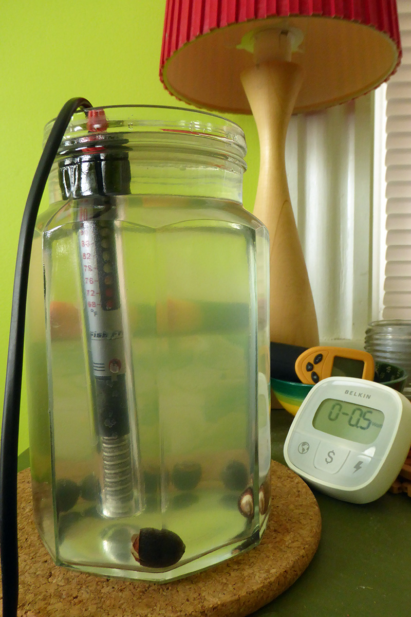 it rained last night and much of this morning, though the forecast called for increasing sun after noontime. in the early afternoon i did a water change on my lotus jar after it started getting cloudy. on friday night it looked like 3 more seeds were ready to germinate. to that select group i can add a possible 4 candidate, as it also looked like a little green sprout is about to emerge.