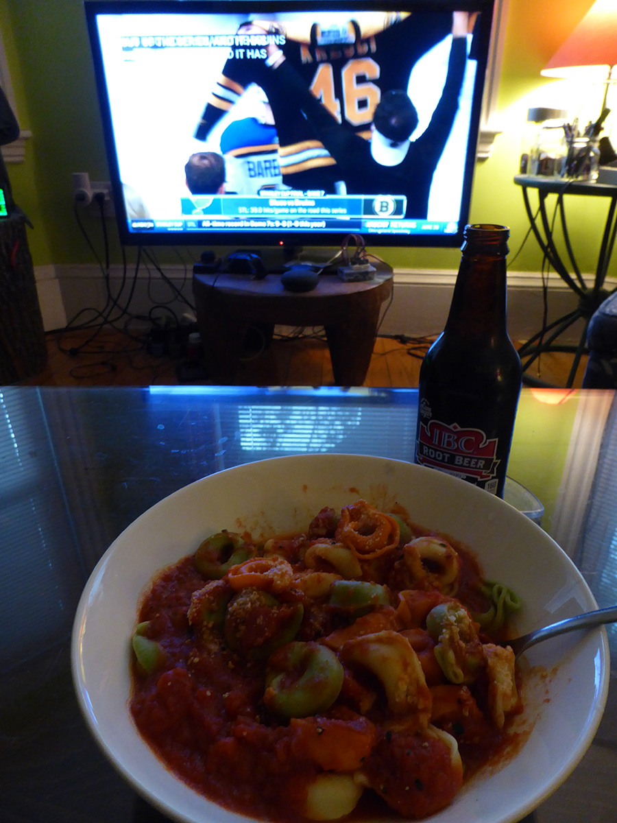 i cooked up some frozen tortellini for dinner, mixed with half a jar of pasta sauce. tonight was all about the stanley cup final: could the boston bruins win it and give us a 3rd sports championship in less than a year? the elusive trifecta? all day long i was seeing people decked out in their bruins wear, the local fan support was palpable. the blues scored twice in the first period, while the bruins couldn't get anything off of st.louis' rookie goalkeeper. neither teams scored in the 2nd period. when the blues scored a 3rd goal in the 3rd period, the inevitable seemed certain, and when they scored a 4th goal, it was the end. boston managed to get one goal for pride when they emptied their net but it was too late. the st.louis blues won the stanley cup, the first time in their franchise history.