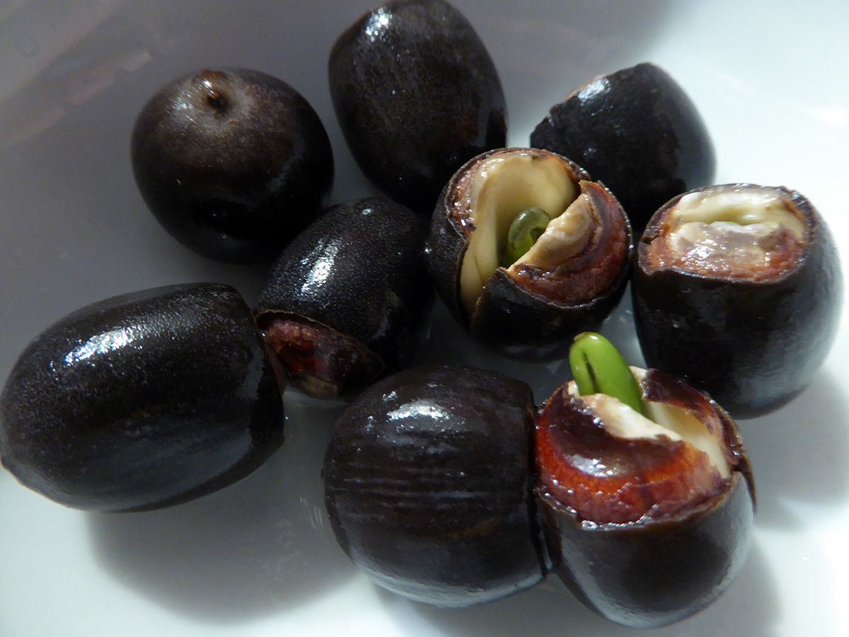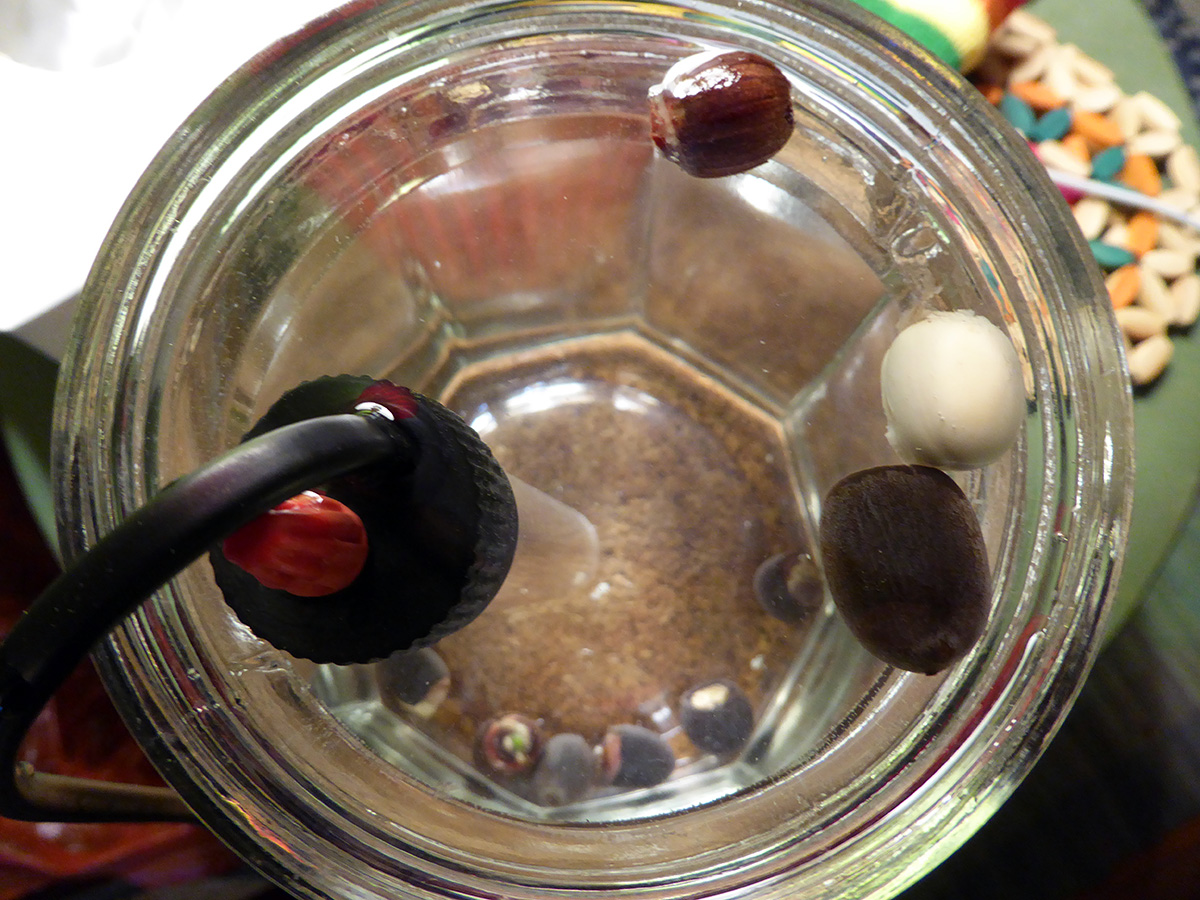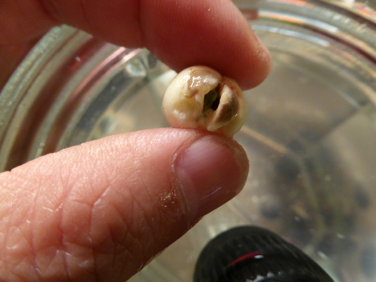 of the floating lotus seeds, a few look rotten. not only are they squishy, but they also give off a mild vomit odor. if i squeeze them i can see a tiny sprout on the inside but don't know if they'll actually germinate. i decided to peel one so all the white was exposed, and another one i peeled but left on the thin brown skin. maybe taking off the soft leathery outer skin will give these floating seeds more room to expand.