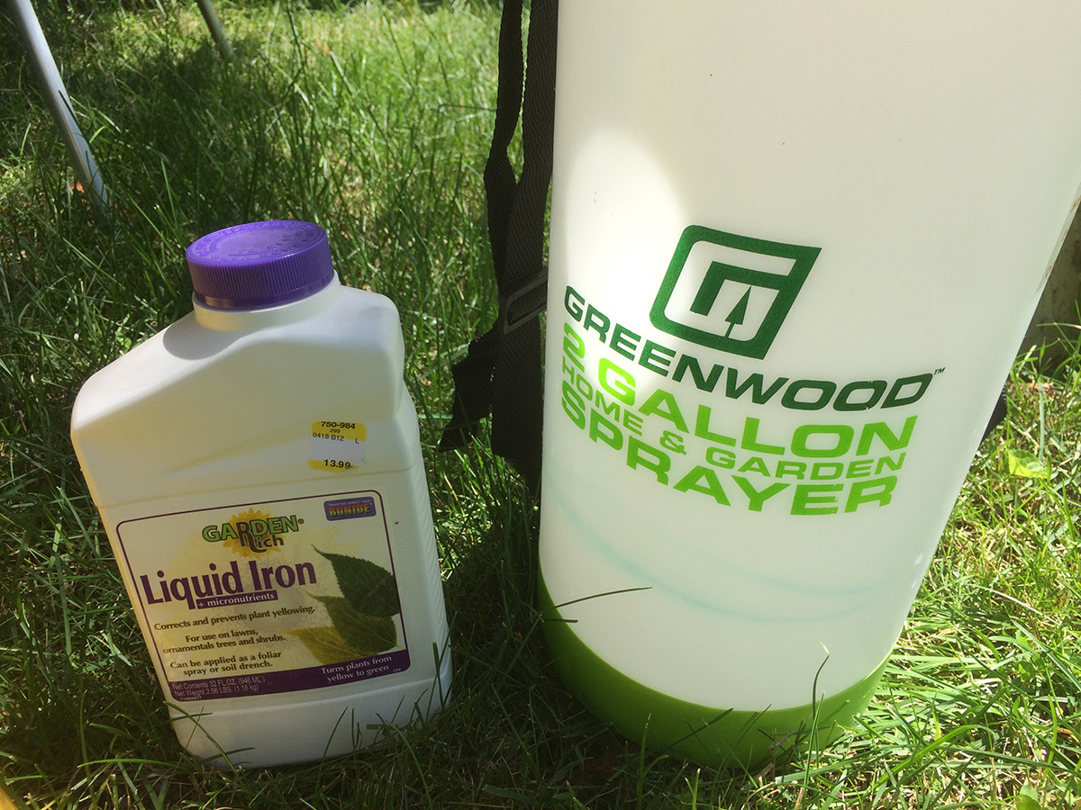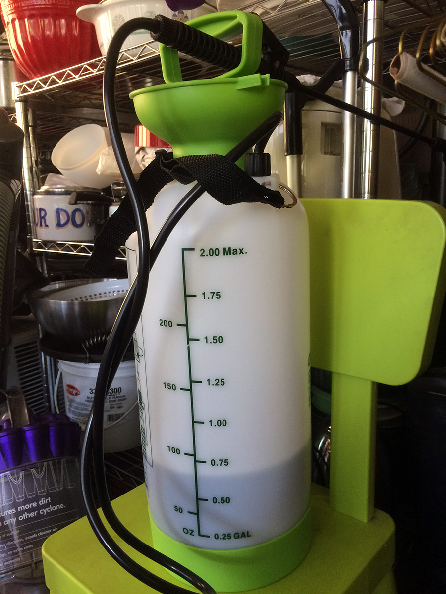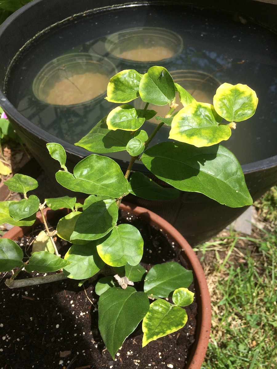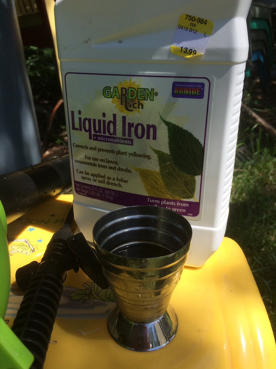 back at home i prepared the iron foliage spray. first i poured out the copper solution that was previously in our sprayer tank. i then mixed 1 gallon of water with 1 ounce of liquid iron (instruction said 1-1/4 ounces, i figured it wouldn't make that much difference). the liquid iron was brownish black and had a surprisingly nice smell. maybe not "nice" but in my mind i was expecting it to smell like blood for some reason, or more metallic, of which it was neither. i sloshed the tank to thoroughly mix the solution before i started spraying. i only selected 2 of the 4 potted jasmines (not including the new belle of india jasmines, which show no signs of chlorosis). this would allow me to do a comparison but would also have some additional plants in case the liquid iron ended up hurting instead of helping. the guy at the garden store reminded me not to expose the newly sprayed plants to direct sunlight, so i moved them into the shade of the grapevines for the time being.