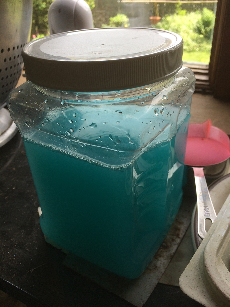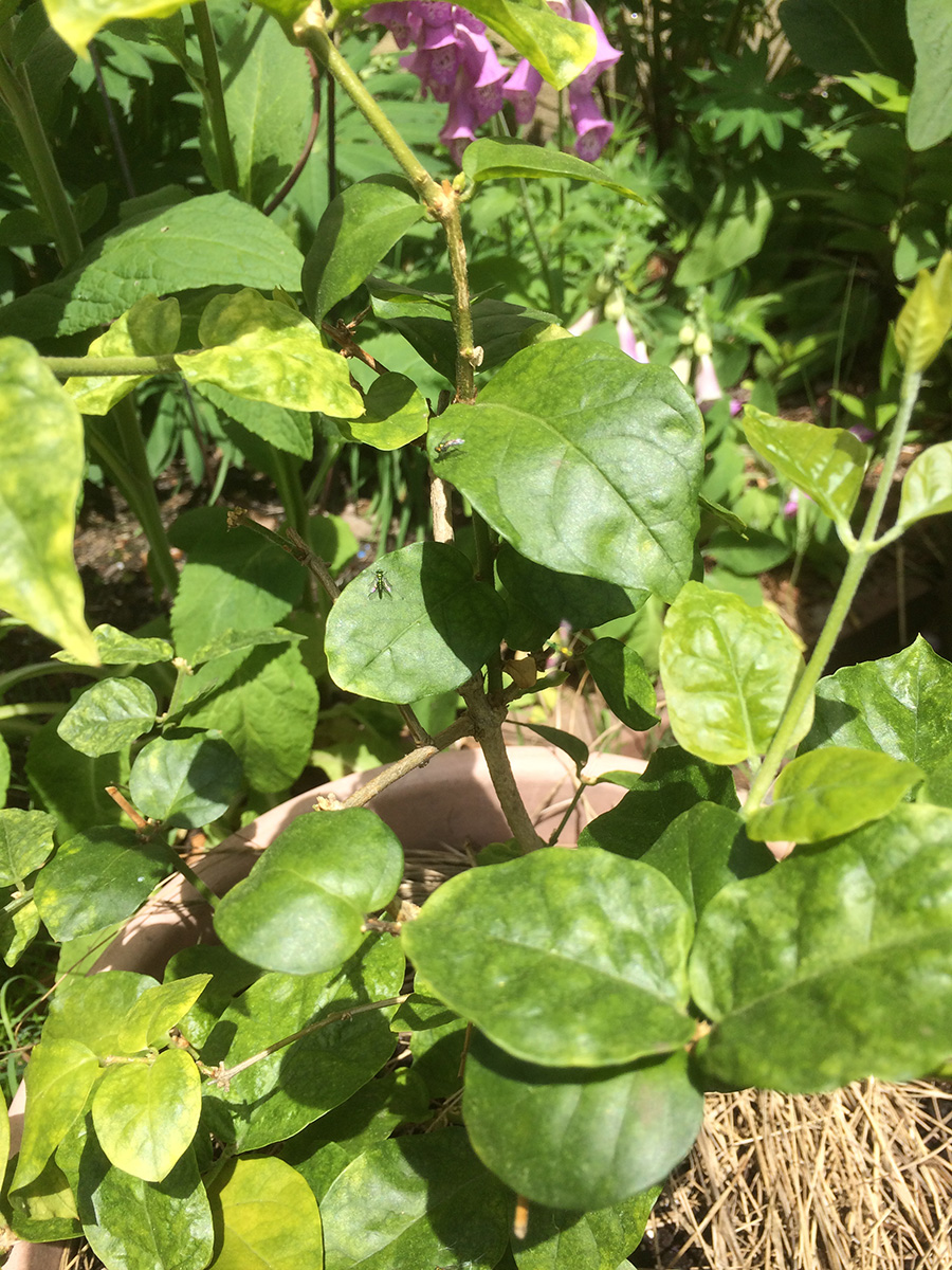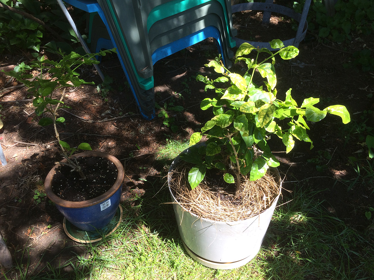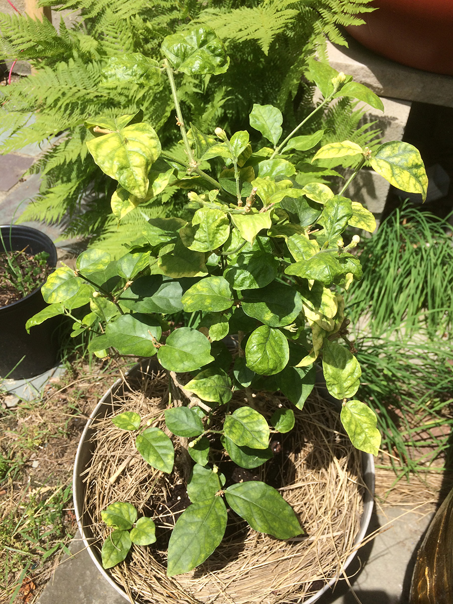 back at home i prepared the iron foliage spray. first i poured out the copper solution that was previously in our sprayer tank. i then mixed 1 gallon of water with 1 ounce of liquid iron (instruction said 1-1/4 ounces, i figured it wouldn't make that much difference). the liquid iron was brownish black and had a surprisingly nice smell. maybe not "nice" but in my mind i was expecting it to smell like blood for some reason, or more metallic, of which it was neither. i sloshed the tank to thoroughly mix the solution before i started spraying. i only selected 2 of the 4 potted jasmines (not including the new belle of india jasmines, which show no signs of chlorosis). this would allow me to do a comparison but would also have some additional plants in case the liquid iron ended up hurting instead of helping. the guy at the garden store reminded me not to expose the newly sprayed plants to direct sunlight, so i moved them into the shade of the grapevines for the time being.