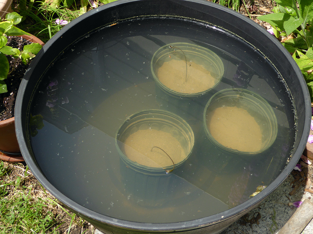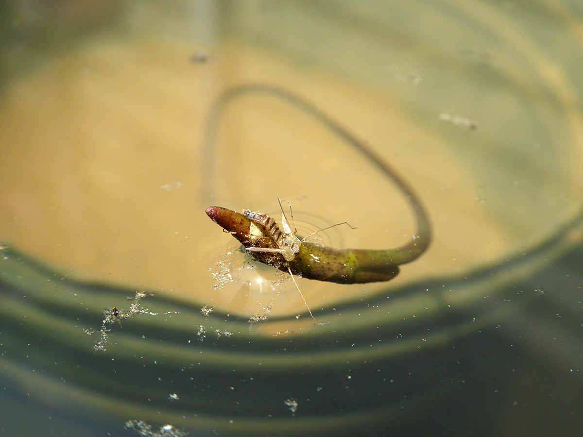 even though it's only been monday since i planted the lotuses, i was still curious to see how they were doing. sitting out in the bright sun submerged in warm water, the two lotus stalks seemed to be fine. both had their tips out of the water, ready to open up their first floating coin leaves. the water was clear, with meant none of the clay mud had seeped out from the containers. through its depths, i could see the emerging sprouts of the 2nd coin leaves ready to grow out from the sand substrate.