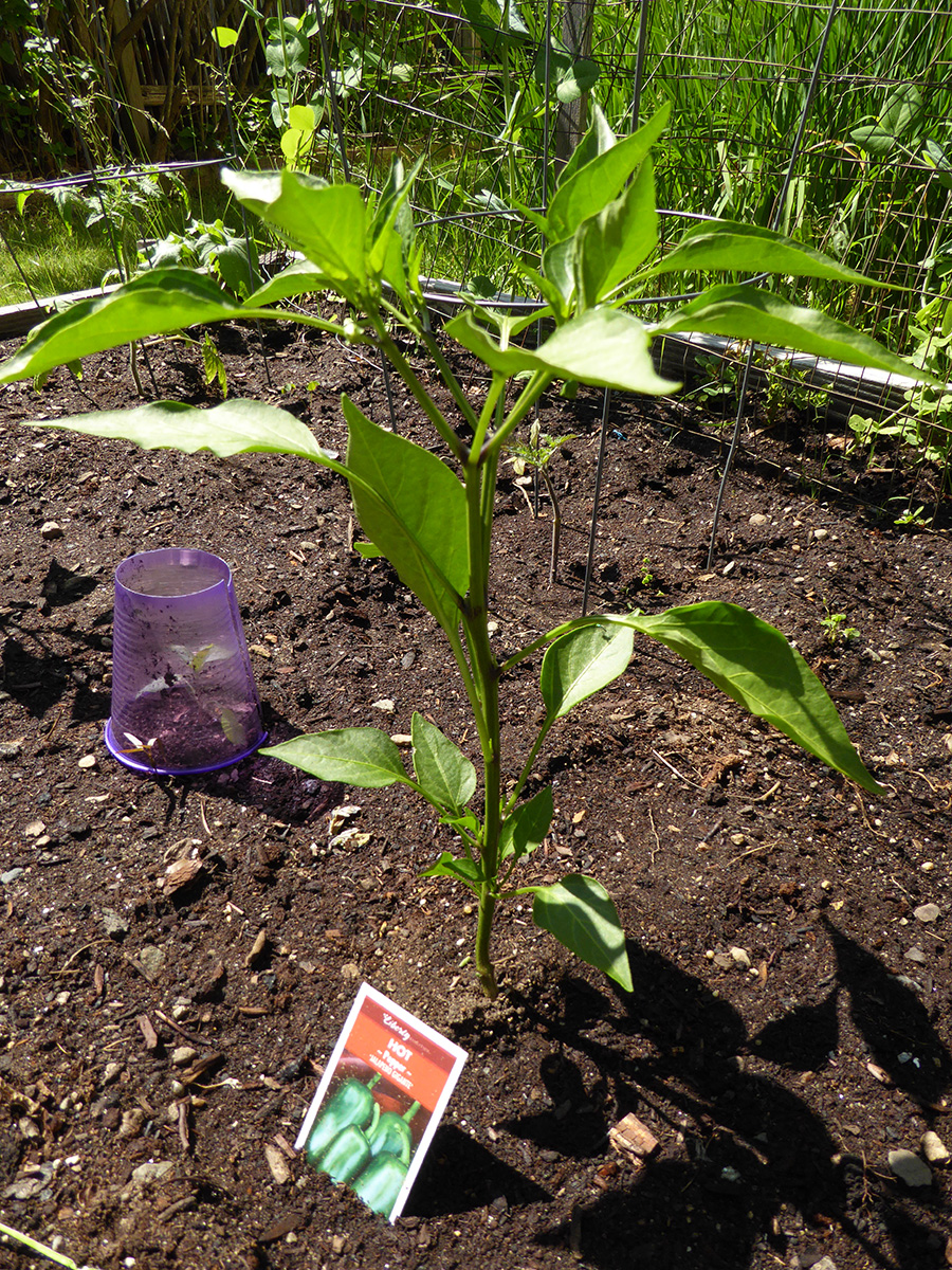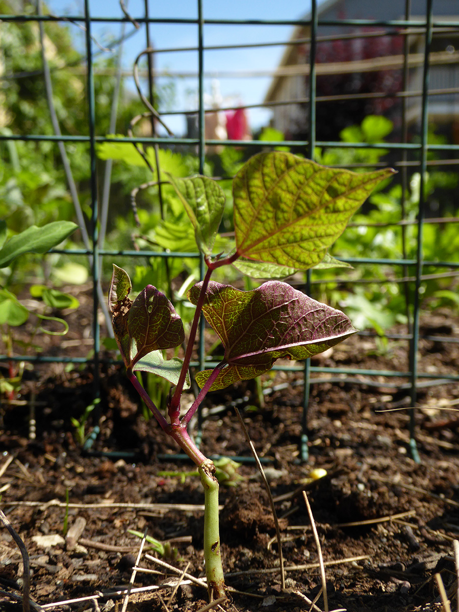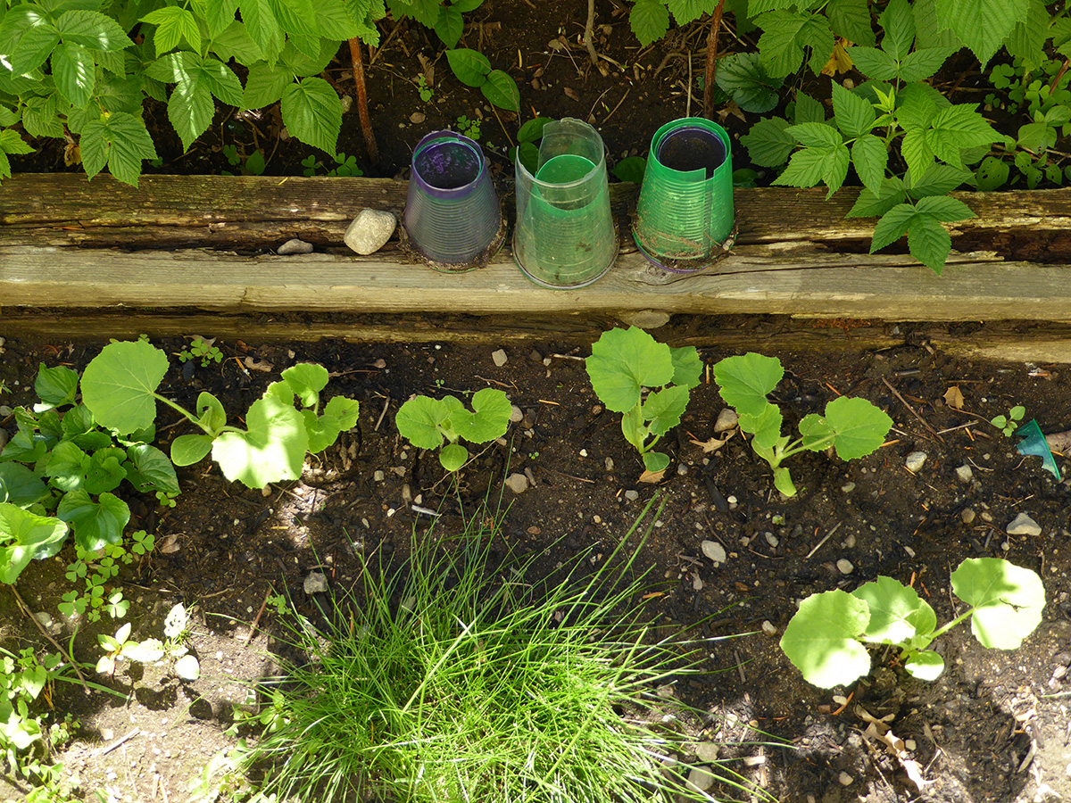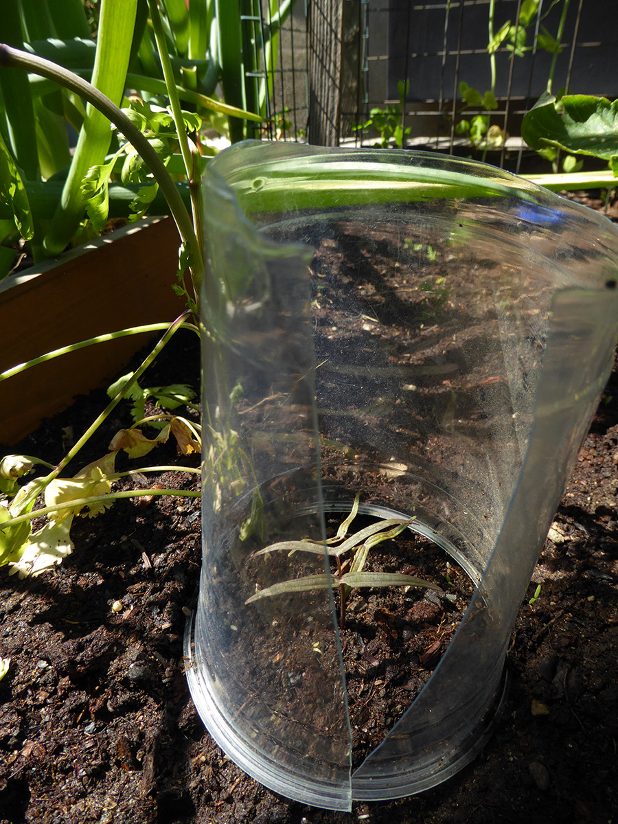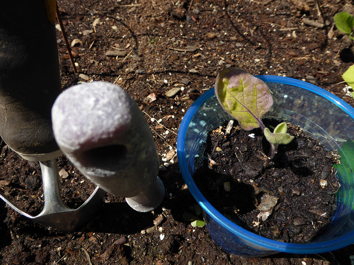 elsewhere in the garden: i noticed no difference in the iron treated jasmines, the leaves still show signs of chlorosis. we moved them to a sunny location, hopefully the light will induce the leaves to turn green. i noticed this last week, but the morning glory and moon flower seeds have germinated along the southern wall. they will grow slowly because the fence blocks the light, but once they crawl up the trellis they will get the sunshine they need. a few dahlias have also sprouted, i put plastic collars around them to protect them from possible critters.
